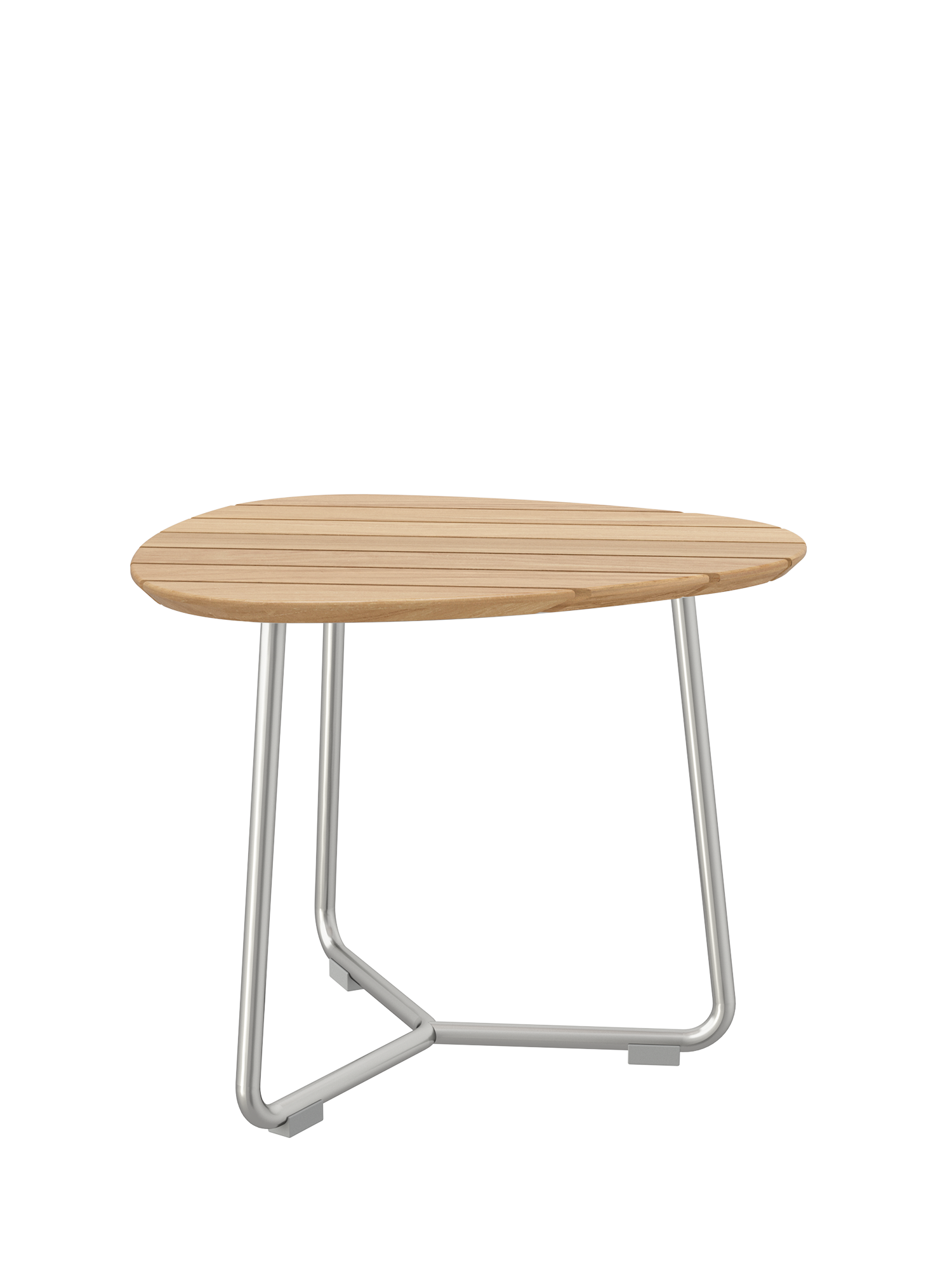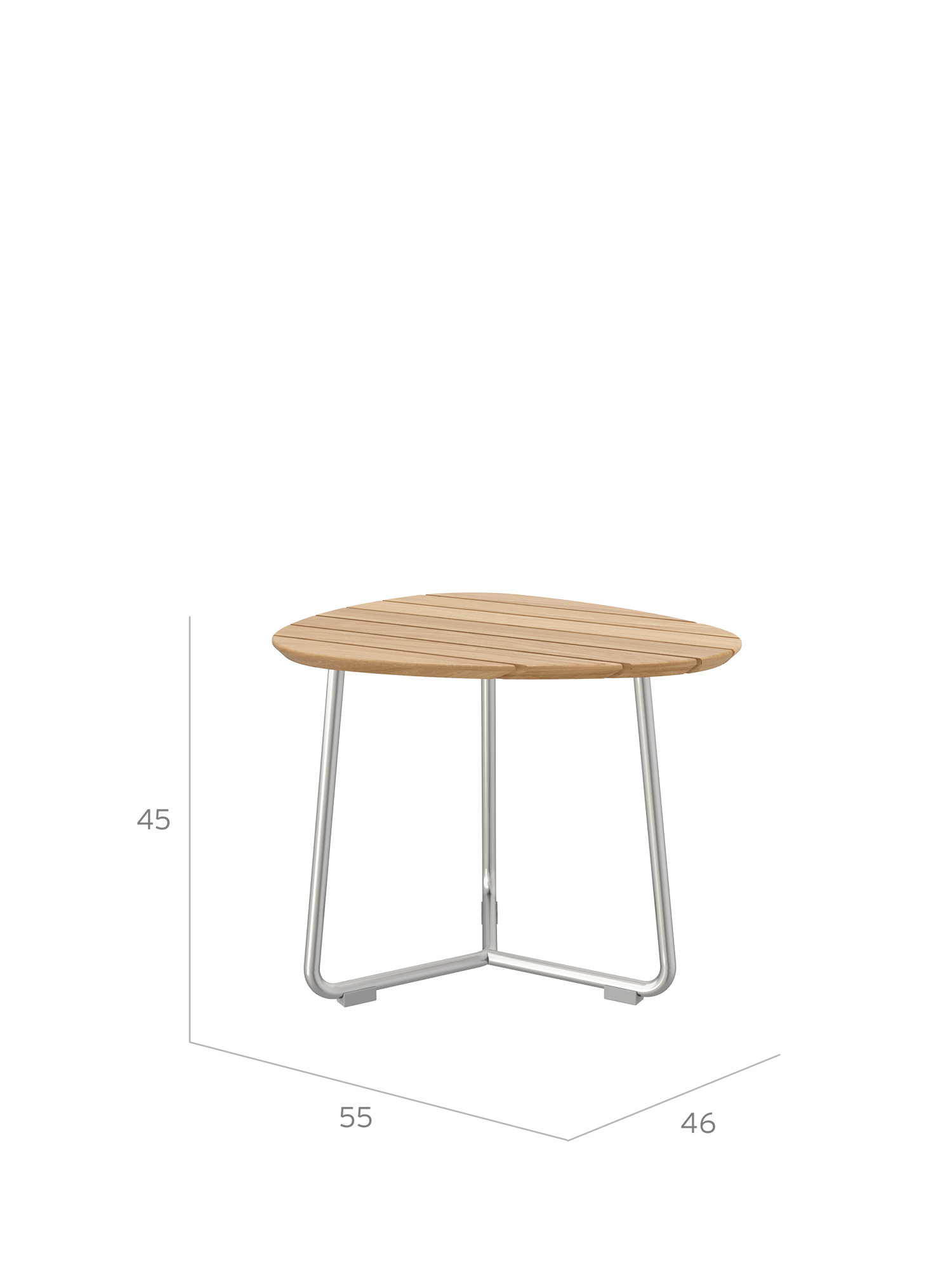 Der Amari Beistelltisch fügt sich mit seiner asymmetrisch gerundeten Form harmonisch in das Bild der Amari Lounge. Etwas kleiner in der Fläche als die beiden Loungetische, wartet der Beistelltisch aus Teak auf seinen Einsatz in der Garten- oder Terrassenlandschaft.
