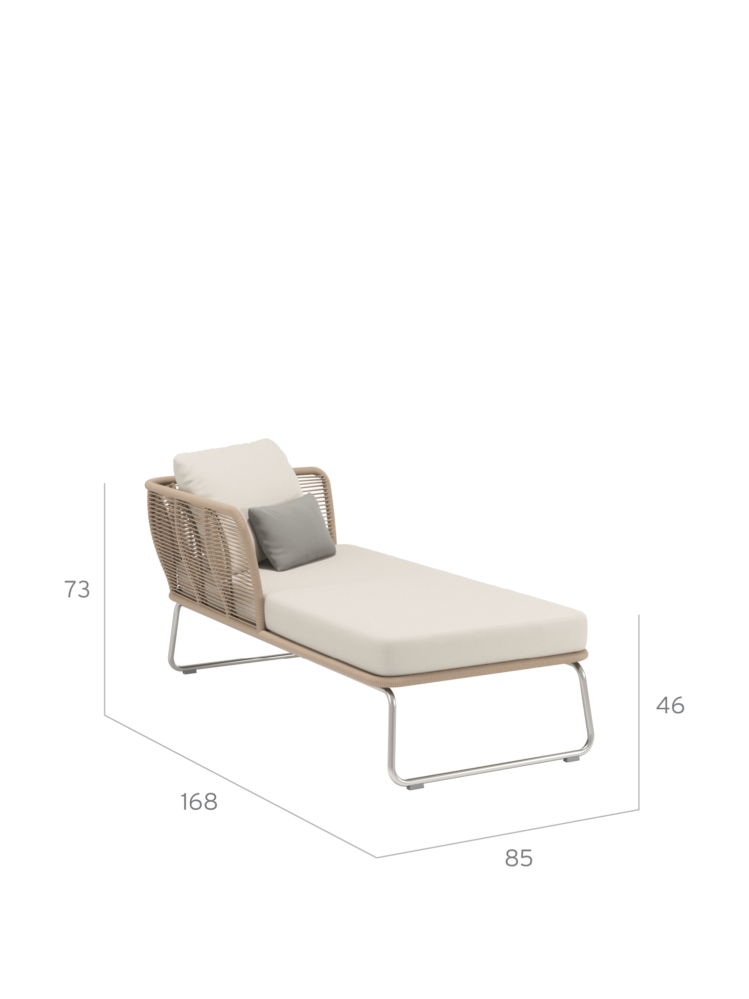 Rücken- und Seitenteil der bequemen Chaiselongue verlaufen auf gleicher Höhe und bieten angenehmen Rückhalt. Durch das lineare Flechtmuster im doppelwandig gearbeiteten Polyethylen-Geflecht fällt das Licht, während das schlanke Gestell aus gebürstetem Edelstahl Stabilität gewährleistetet und ein Dekokisssen im kontrastierenden Dessin für zusätzlichen Komfort sorgt. Die Chaiselongue empfiehlt sich für stimmige Kombinationen mit den Beistelltischen der Amari Kollektion.