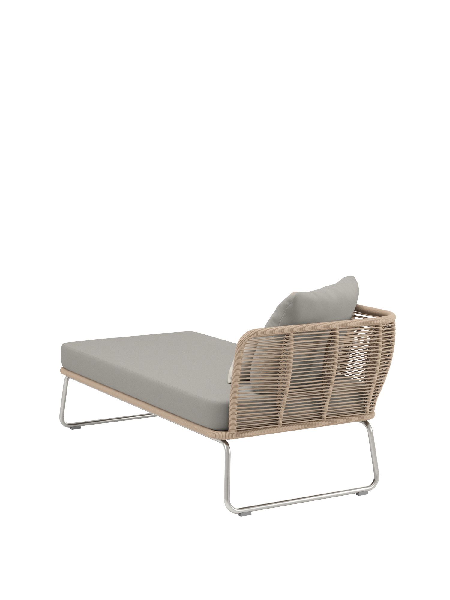 Rücken- und Seitenteil der bequemen Chaiselongue verlaufen auf gleicher Höhe und bieten angenehmen Rückhalt. Durch das lineare Flechtmuster im doppelwandig gearbeiteten Polyethylen-Geflecht fällt das Licht, während das schlanke Gestell aus gebürstetem Edelstahl Stabilität gewährleistetet und ein Dekokissen im kontrastierenden Dessin für zusätzlichen Komfort sorgt. Die Chaiselongue empfiehlt sich für stimmige Kombinationen mit den Beistelltischen der Amari Kollektion.