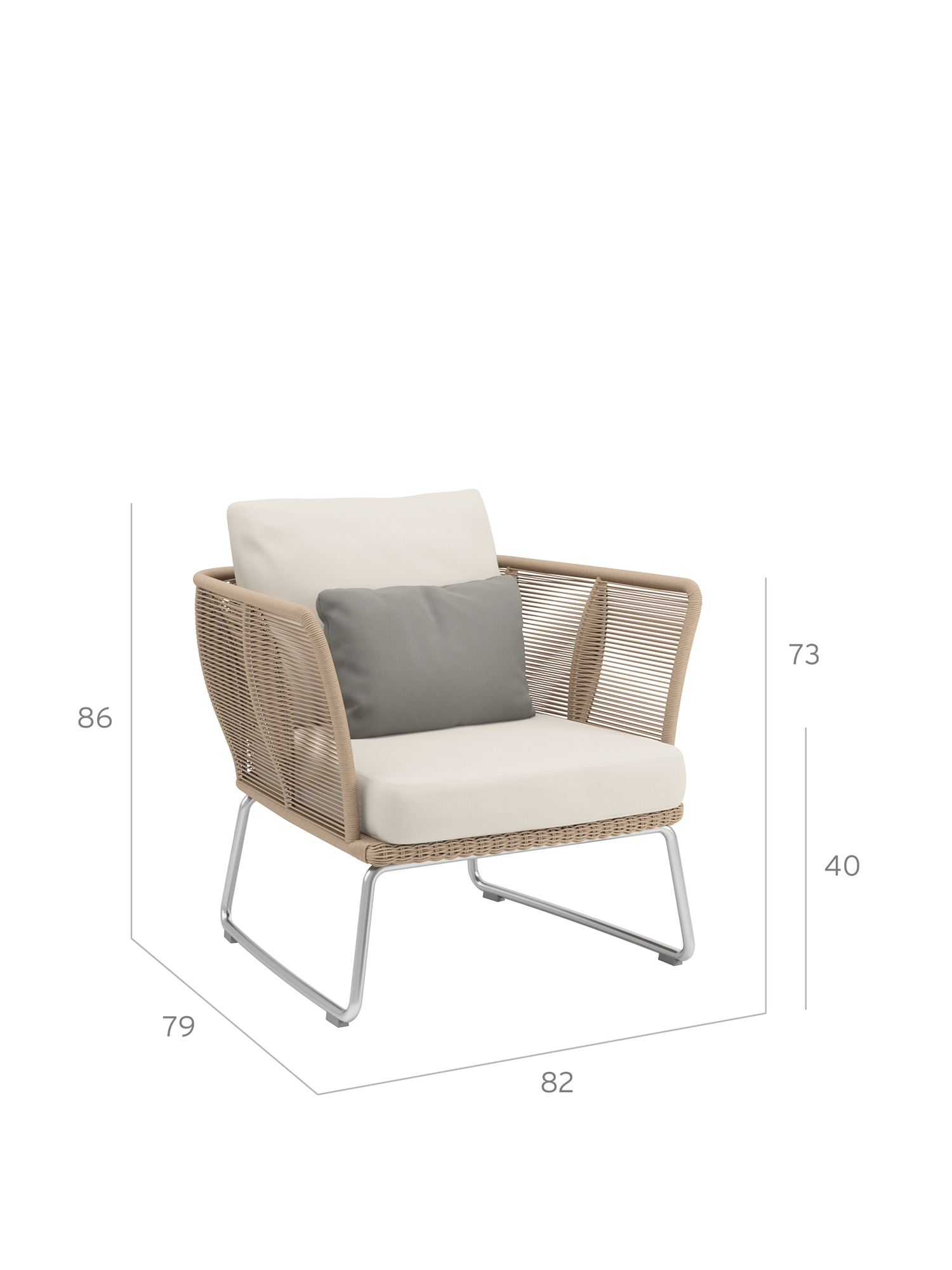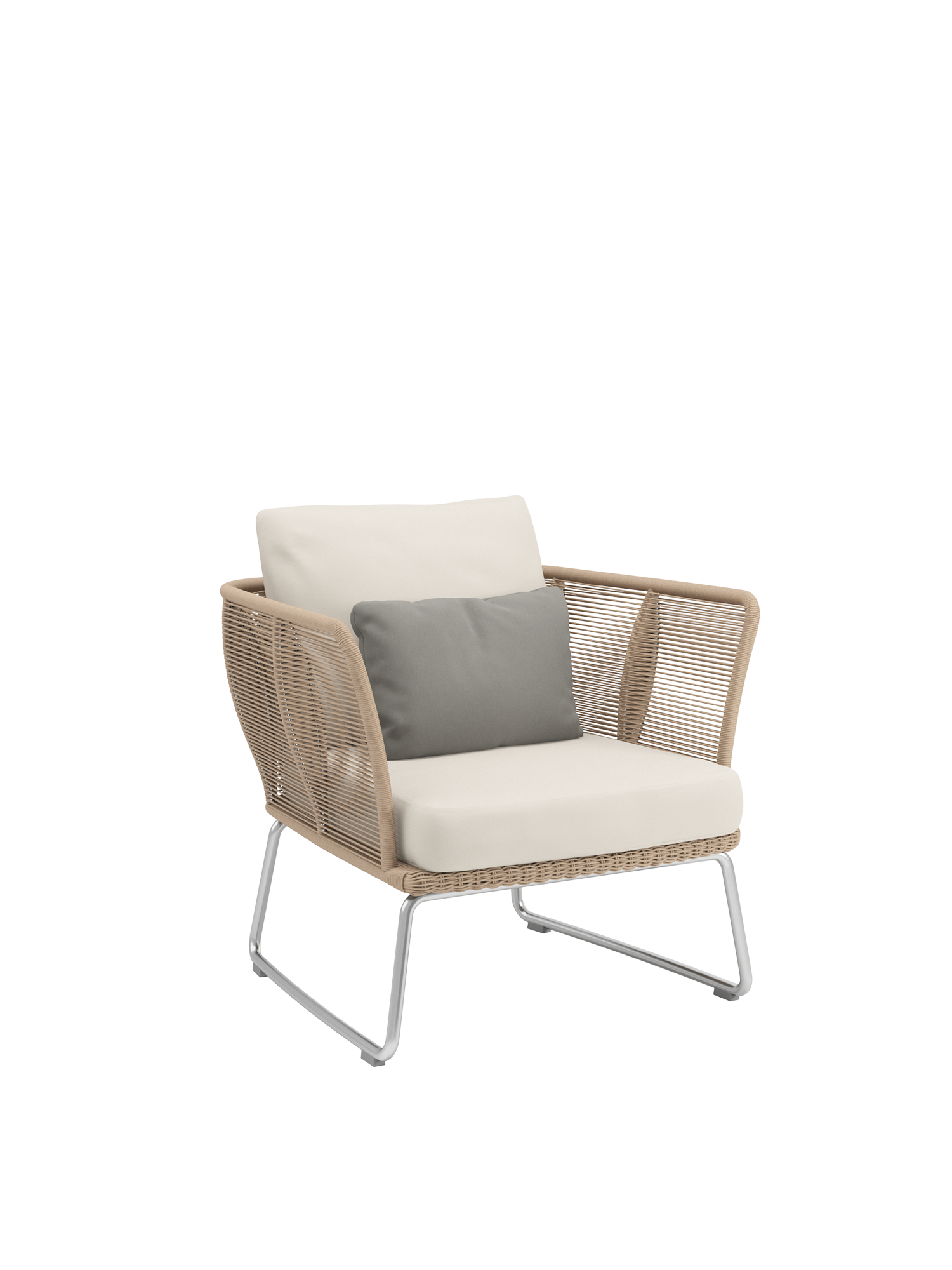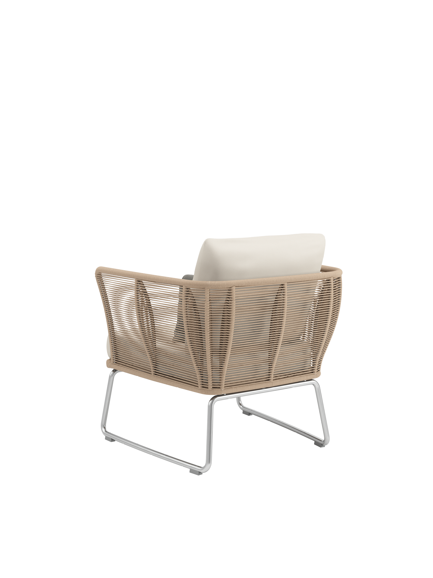 Eine Kombination aus witterungsbeständigem Kordelgeflecht und Edelstahl sorgt für Transparenz und Stabilität zugleich. Das geradlinige Flechtmuster der Loungemöbel lässt das Licht durchscheinen. Die auf gleicher Höhe verlaufenden Rücken- und Seitenteile des komfortablen Sessels sind doppellagig gearbeitet und bieten angenehmen Rückhalt. Schlanke, geschwungene Edelstahlkufen verleihen dem Design besondere Eleganz und zuverlässigen Halt.