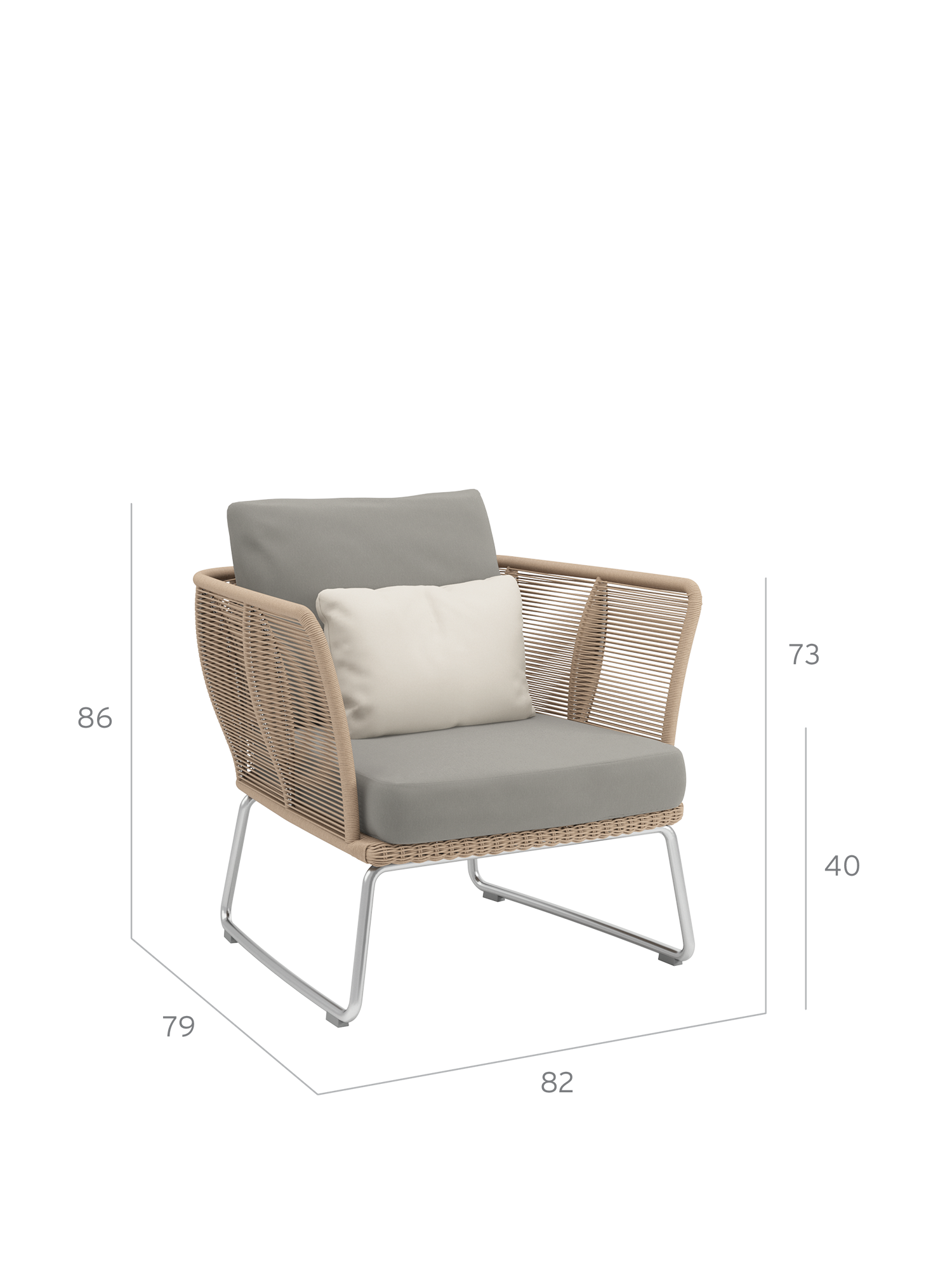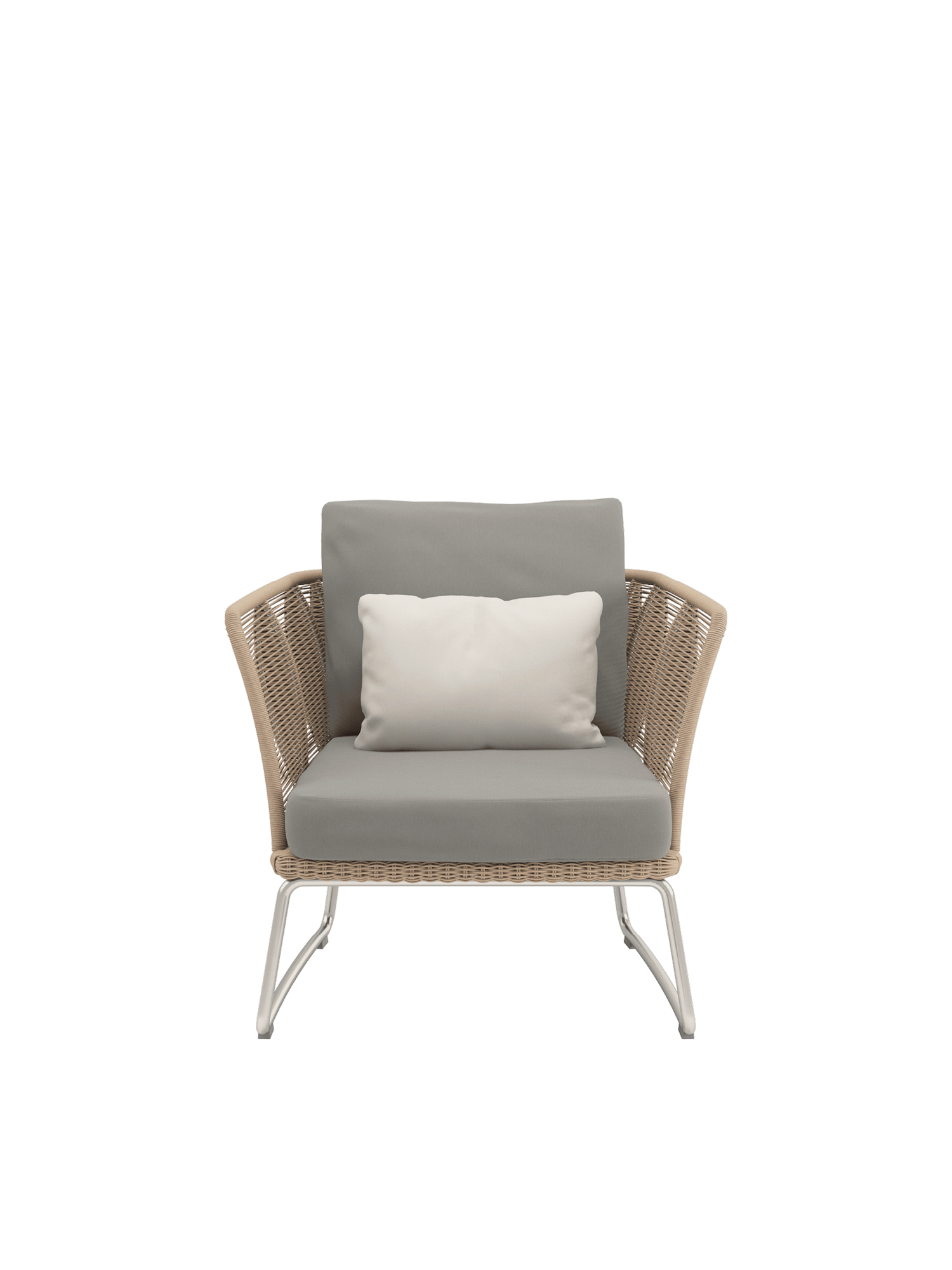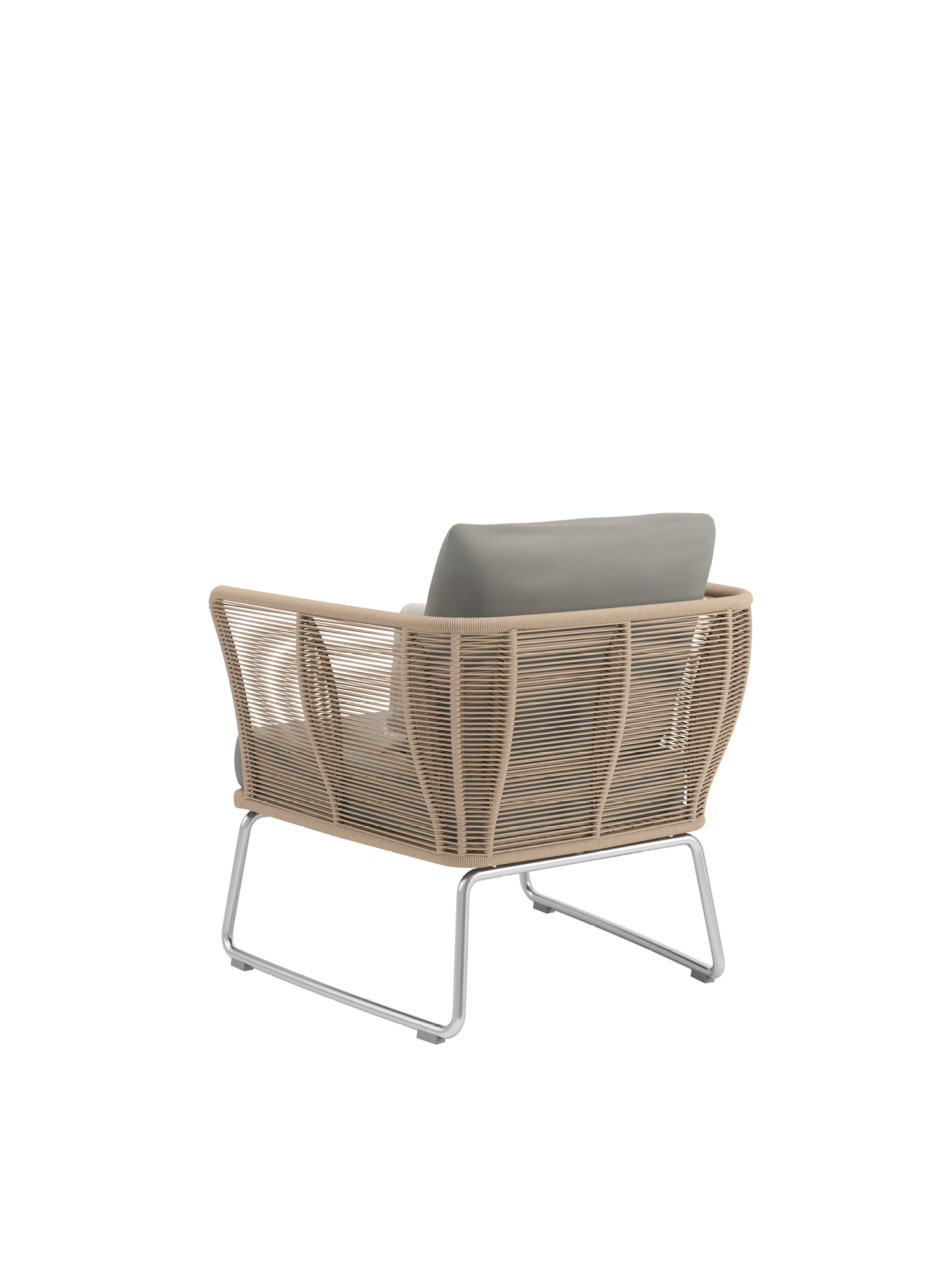 Eine Kombination aus witterungsbeständigem Kordelgeflecht und Edelstahl sorgt für Transparenz und Stabilität zugleich. Das geradlinige Flechtmuster der Loungemöbel lässt das Licht durchscheinen. Die auf gleicher Höhe verlaufenden Rücken- und Seitenteile des komfortablen Sessels sind doppellagig gearbeitet und bieten angenehmen Rückhalt. Schlanke, geschwungene Edelstahlkufen verleihen dem Design besondere Eleganz und zuverlässigen Halt.