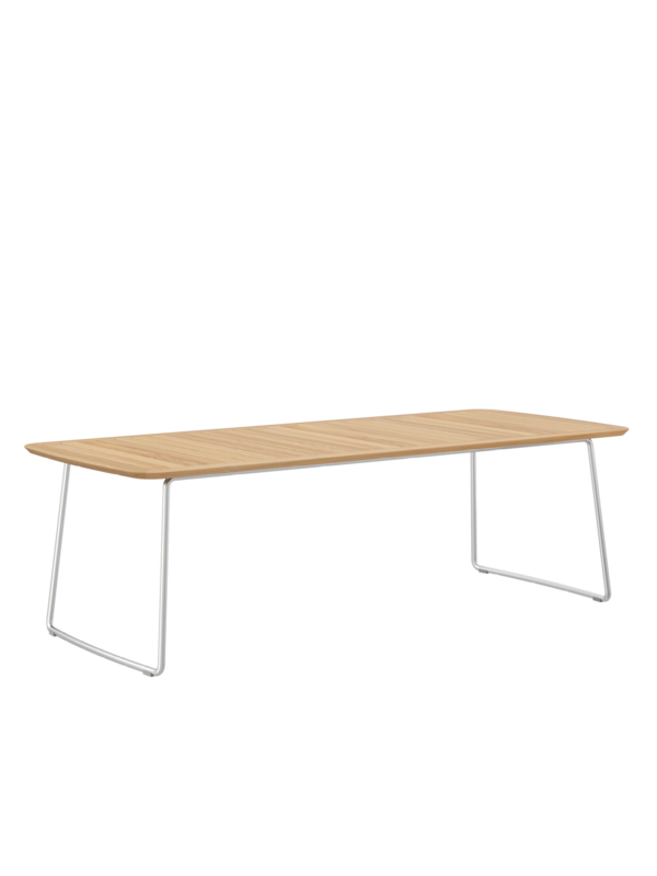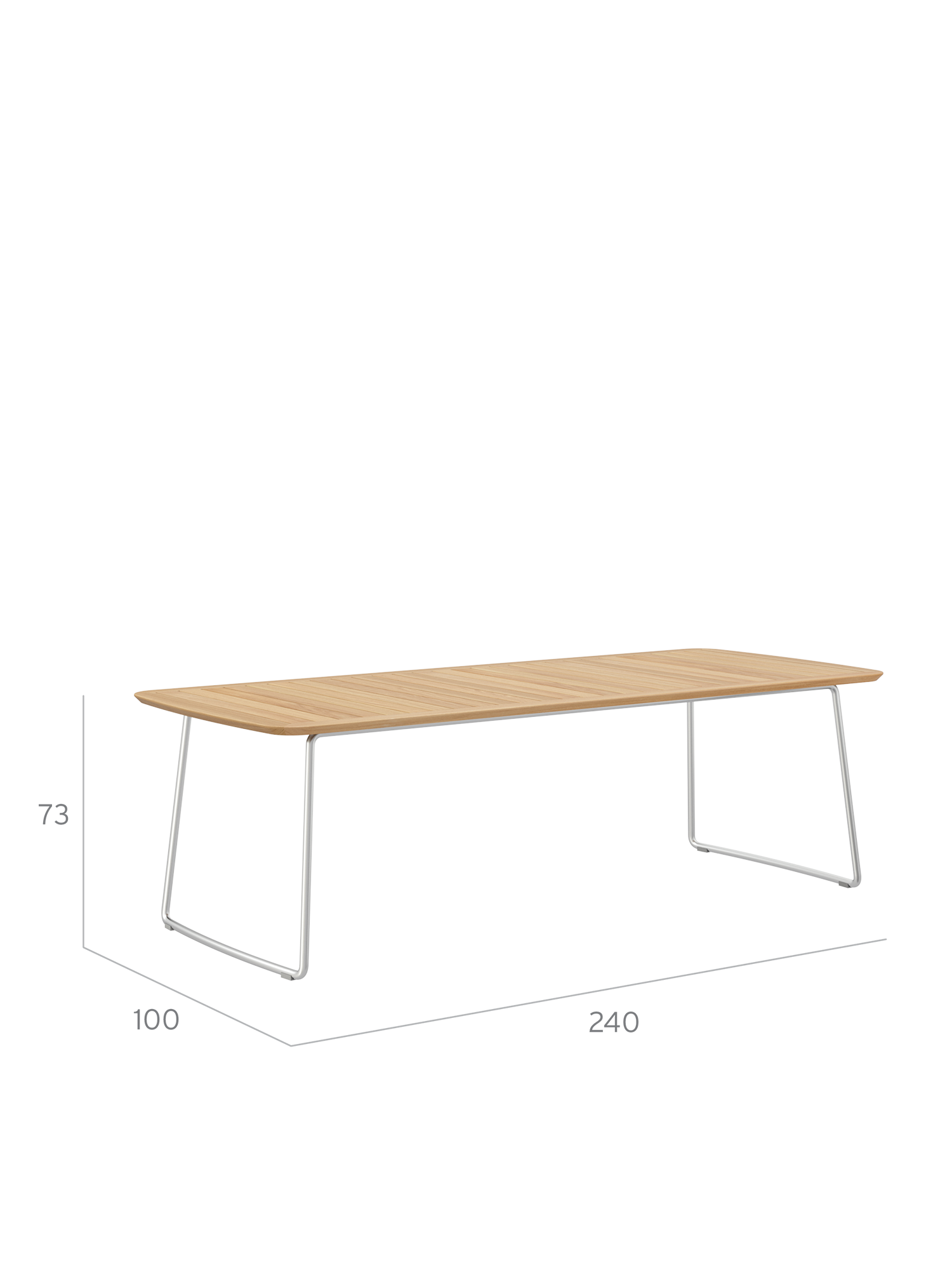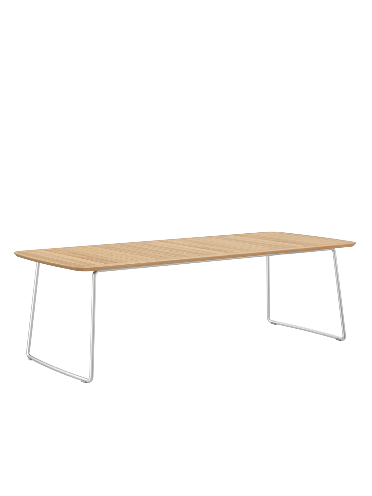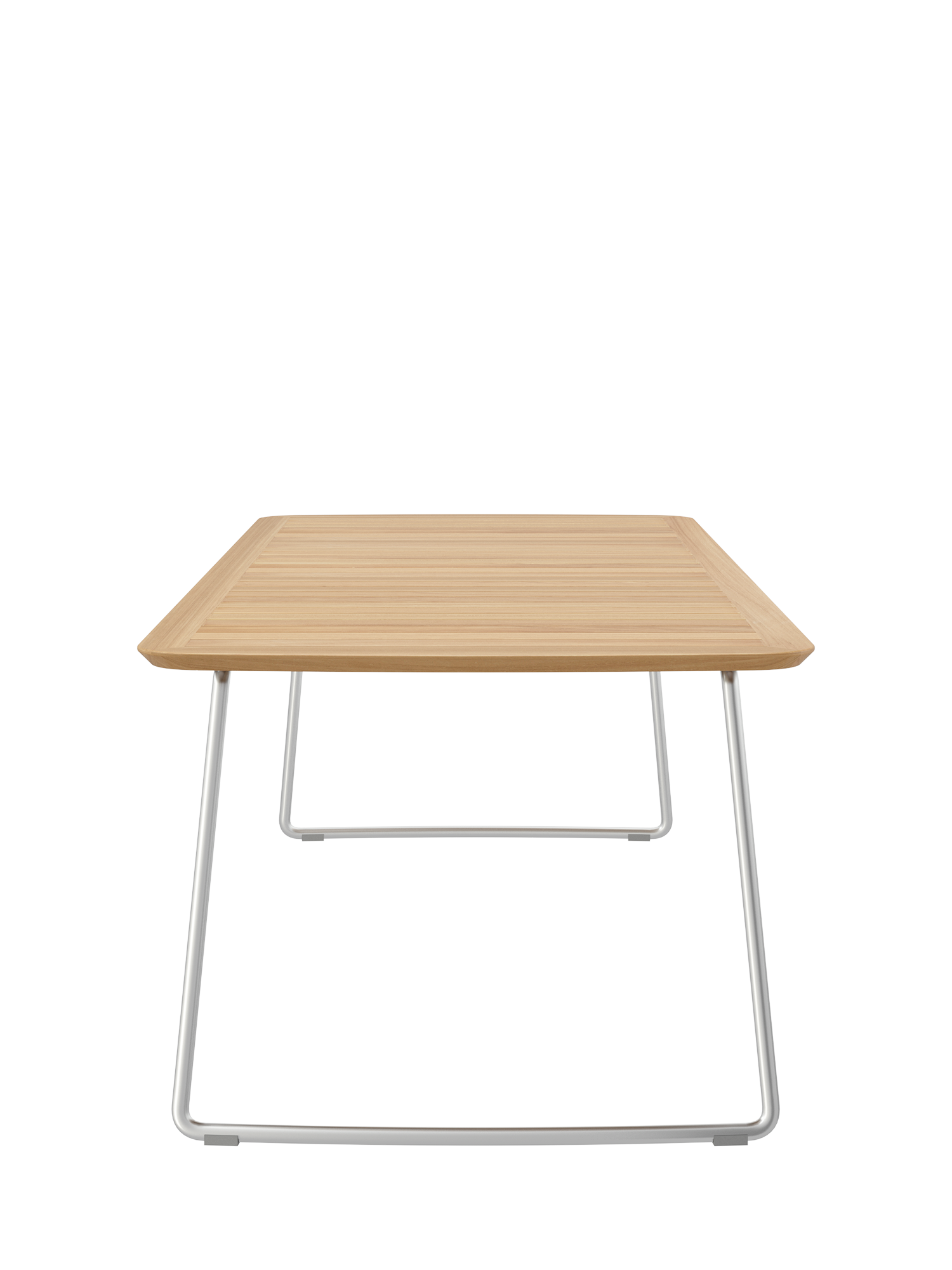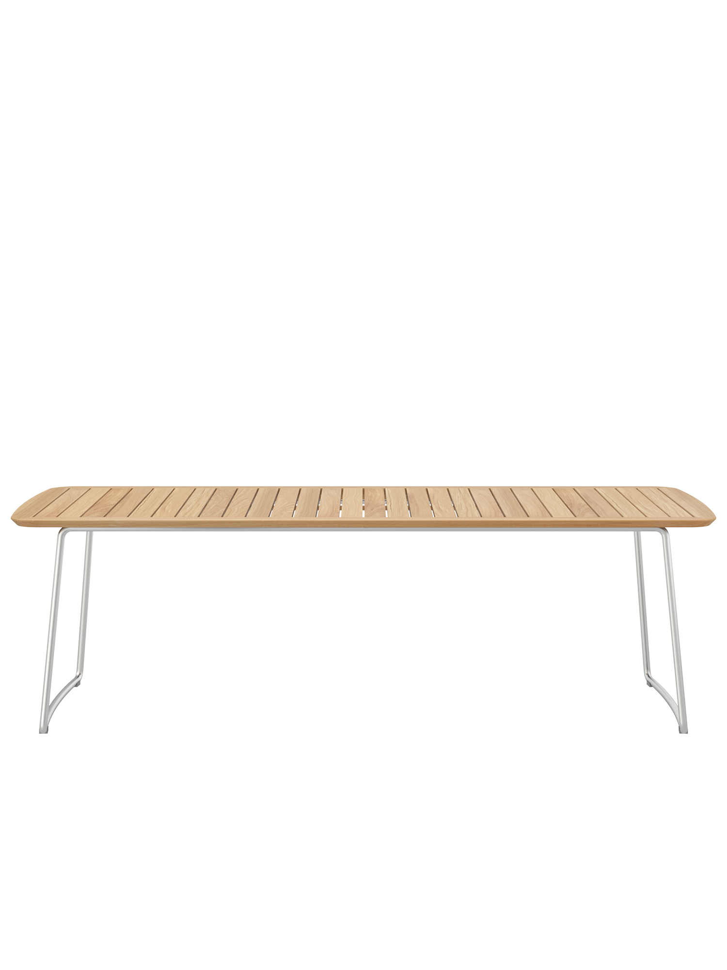 Die schlanke Tischplatte aus eng stehenden Teakholzleisten ist von einem Rahmen mit sorgfältig gerundeten Kanten eingefasst. Auch die geschwungenen Edelstahlkufen des Esstisches fügen sich harmonisch in das Gesamtbild der Amari Serie ein. Die passenden Armlehnstühle können einfach unter den Tisch geschoben werden.