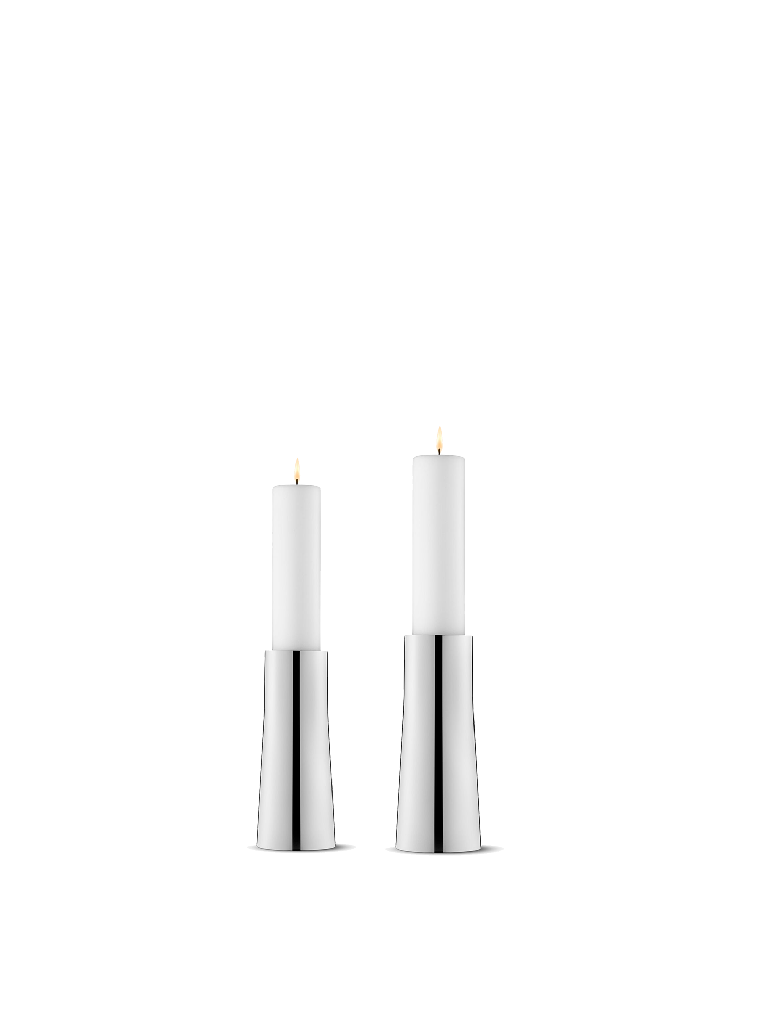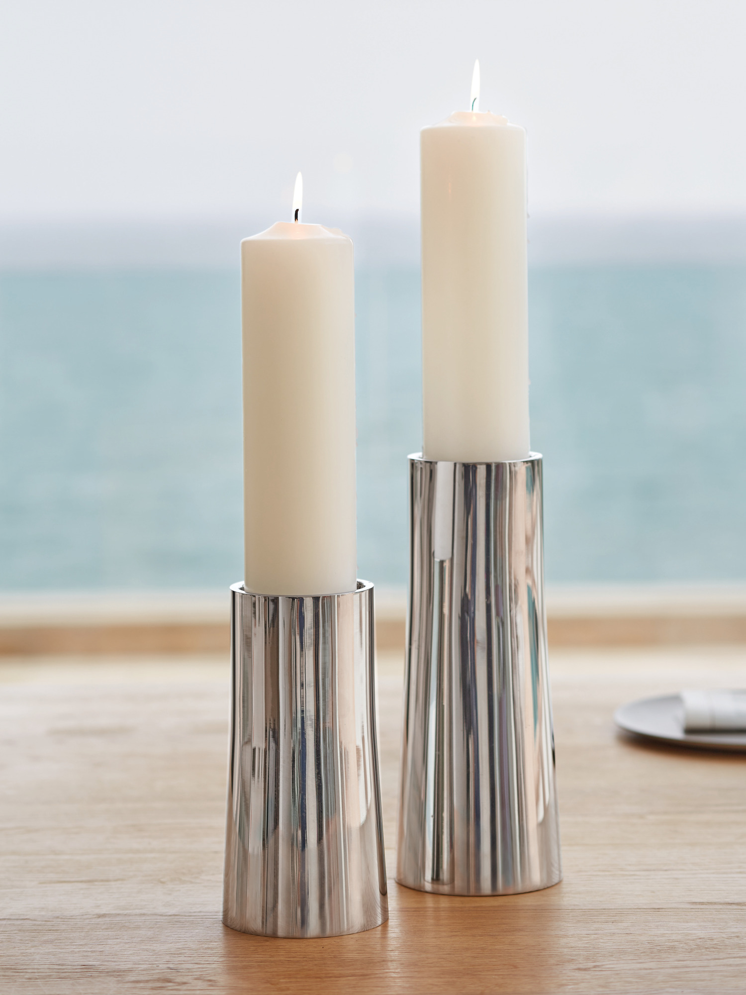 Die puristischen Kerzenleuchter aus Edelstahl verjüngen sich leicht nach oben und streben in zwei Größen festlichen Höhepunkten entgegen. Zum Set gehören auch die passenden Kerzen.