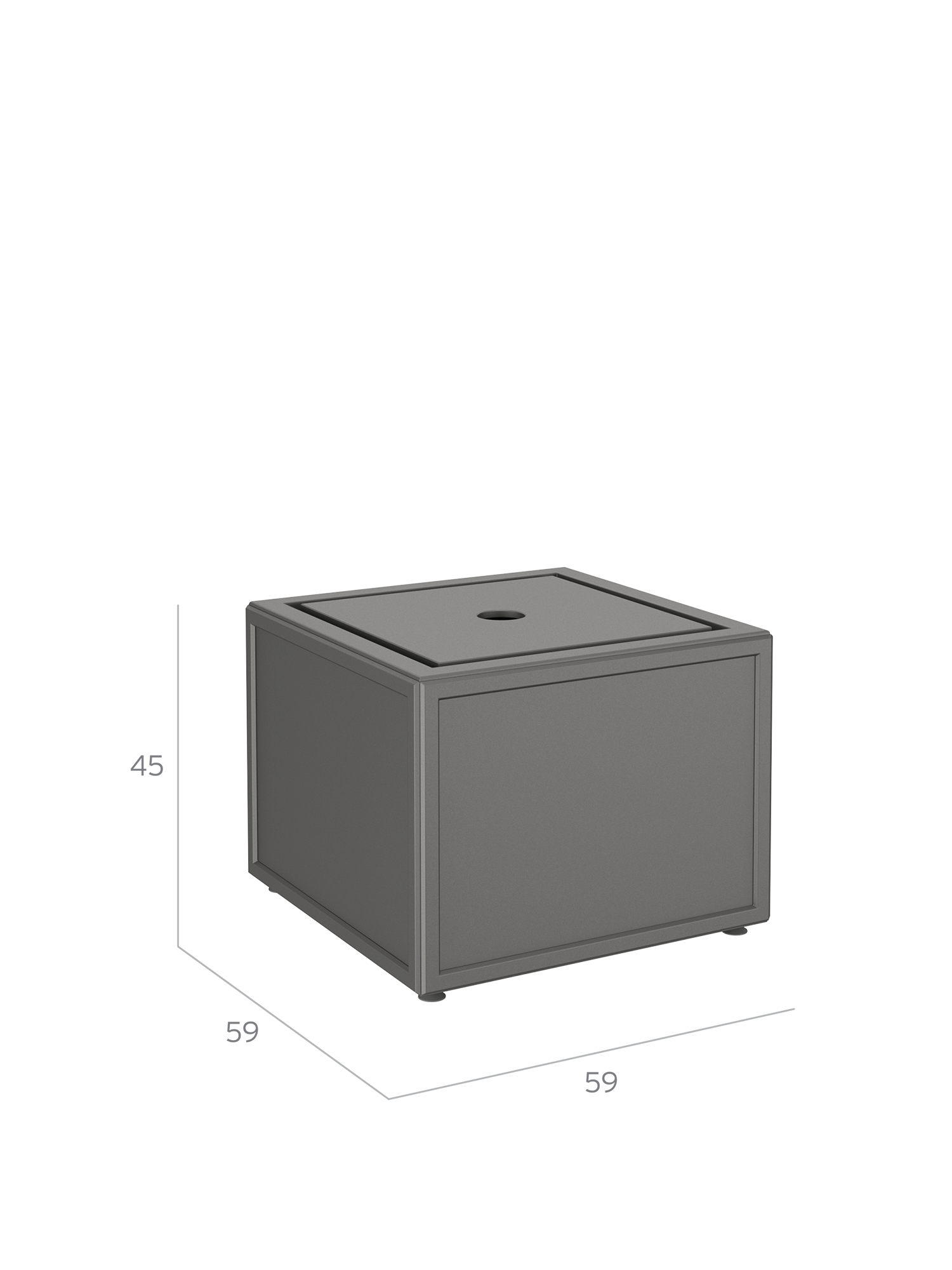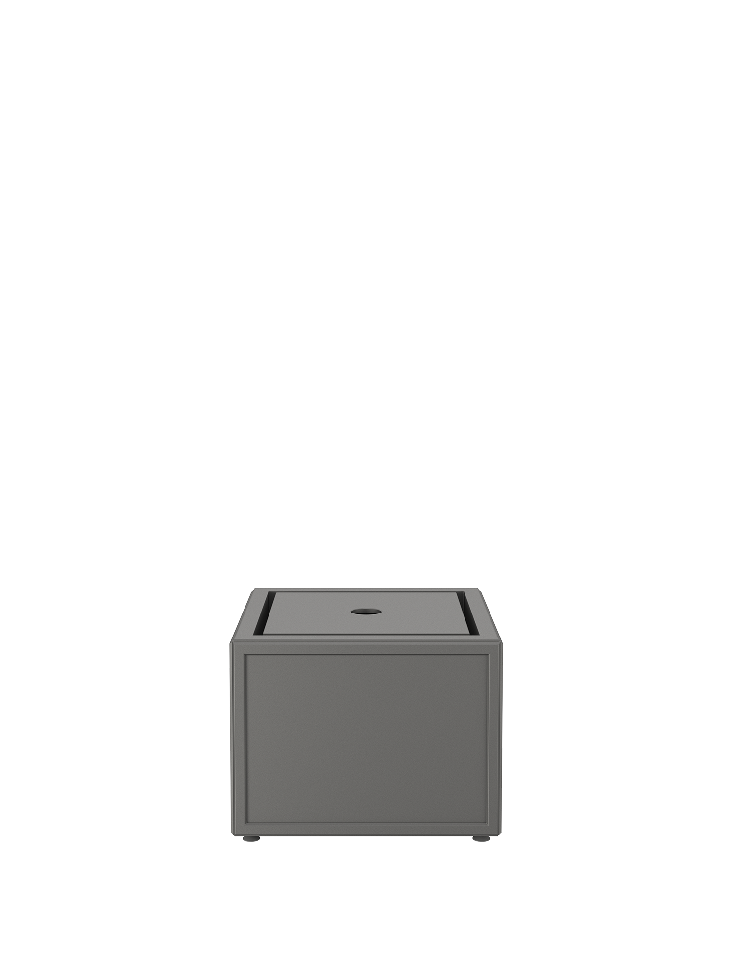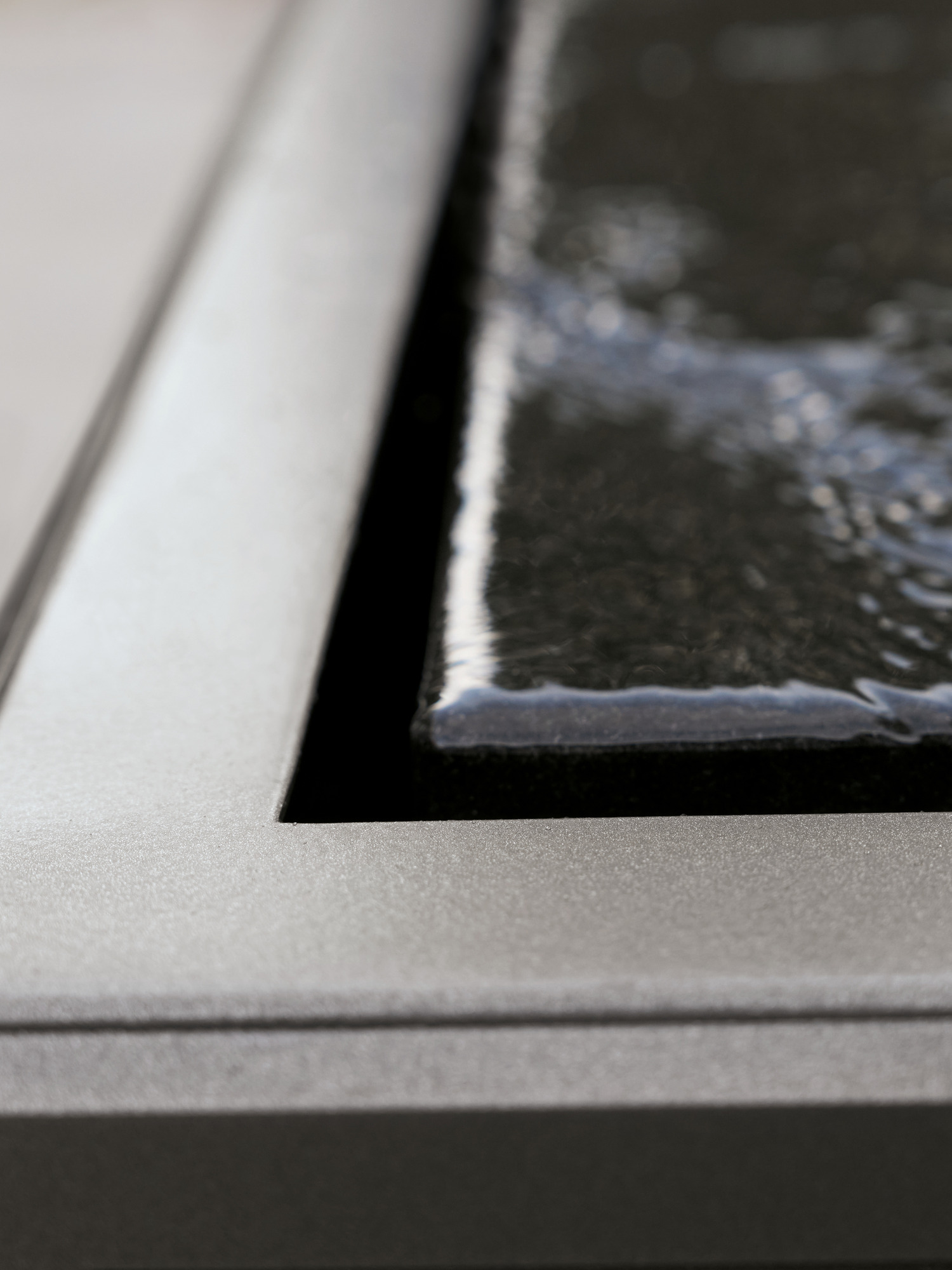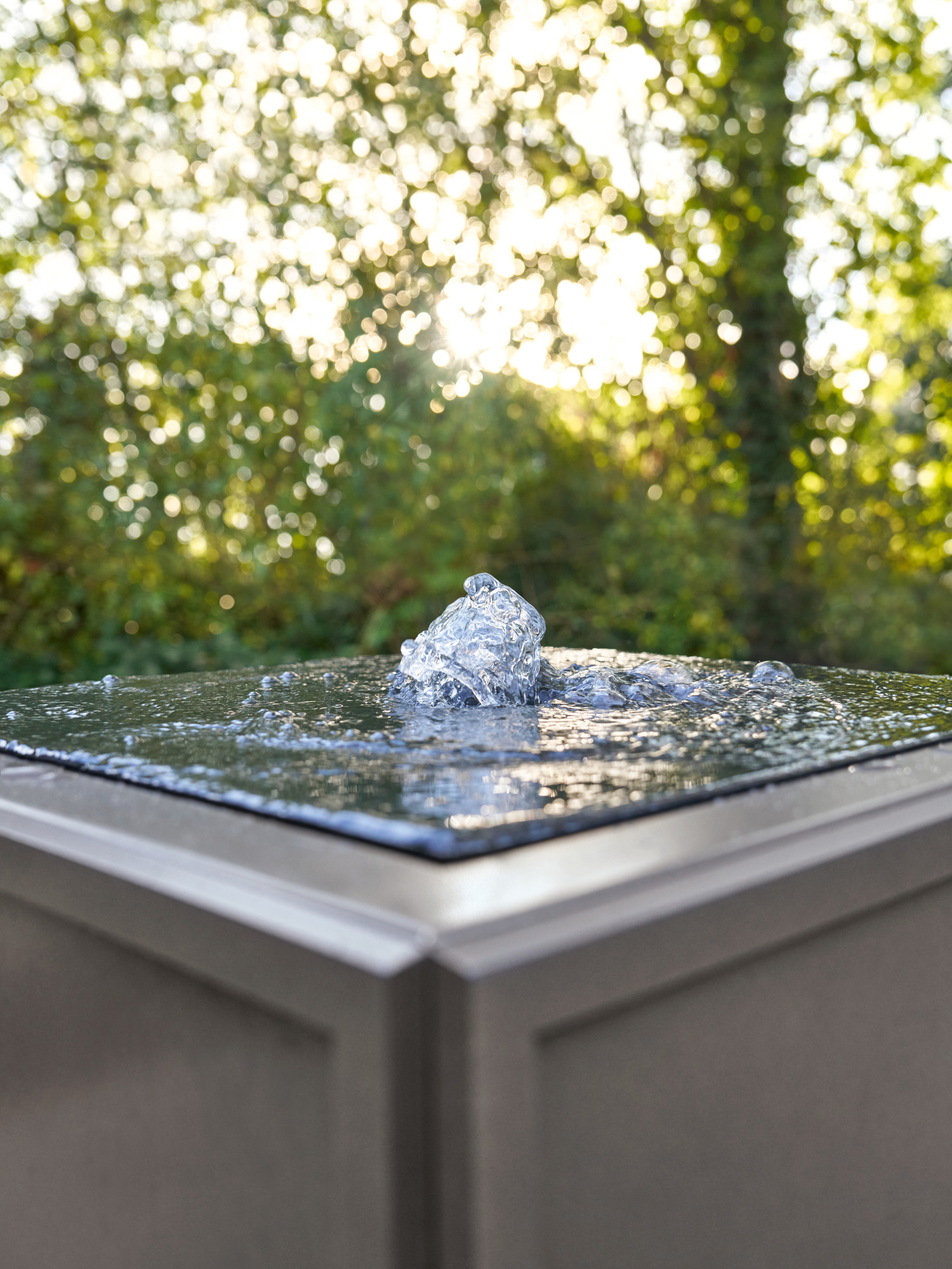 Im quadratischen Brunnen aus pulverbeschichtetem Aluminium sprudelt das Wasser über eine Oberfläche aus wetterfester marmorierter Keramik und fließt an den Seiten nach unten. Angetrieben wird der Kreislauf über eine Pumpe, ein Stromanschluss genügt dafür. Wasserablauf, Kabelauslass und Überlauf gewährleisten eine zuverlässige Funktion. Im Winter muss der Brunnen vollständig entleert werden, die Pumpe entnommen und frostfrei gelagert werden.