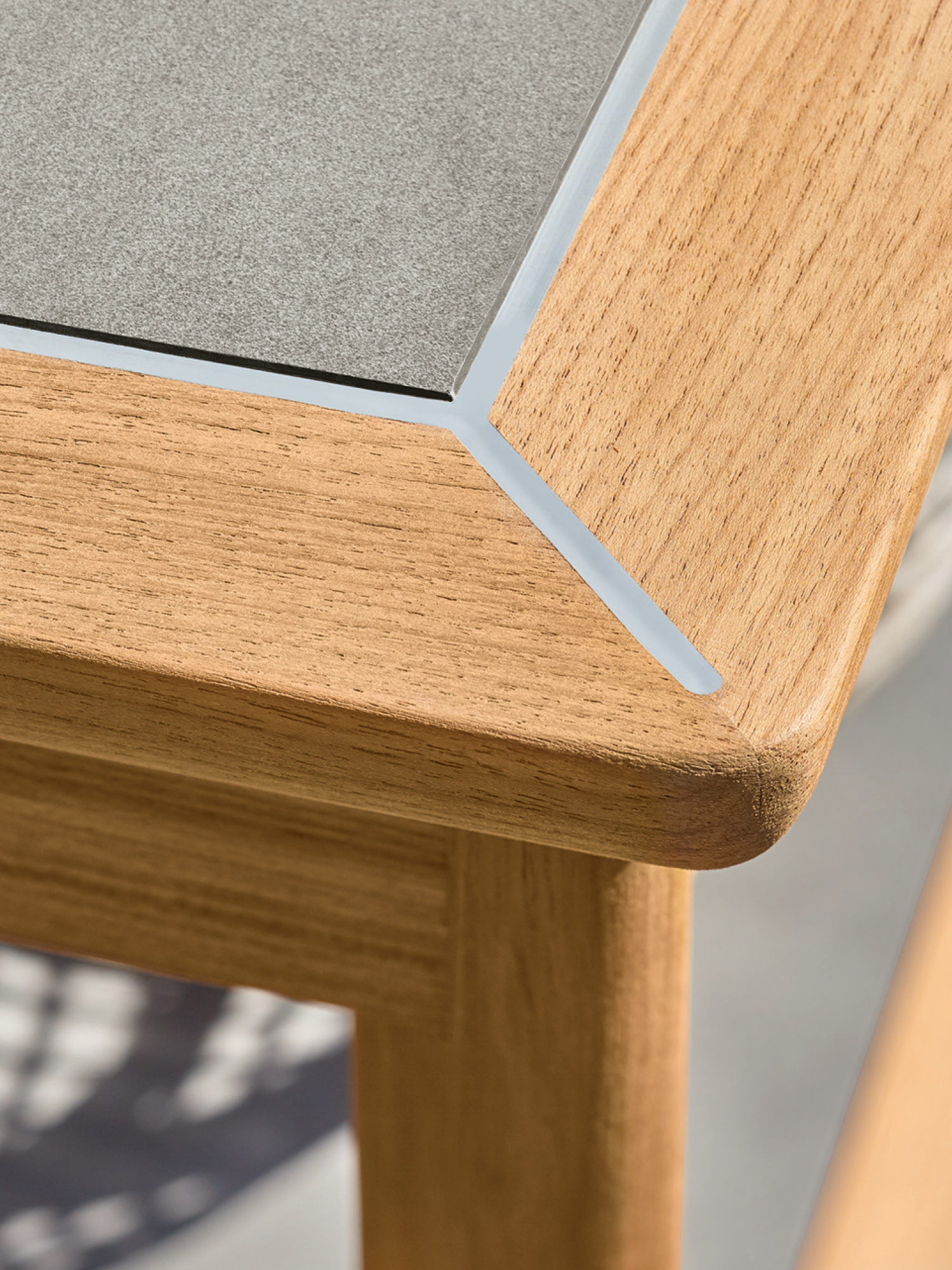 Als Abstellmöglichkeit, Stauraum mit üppiger Tiefe oder Ausstellungsort für dekorative Objekte macht es sich im Garten wie auf dem Balkon nützlich. Das solide Gestell mit der eleganten Bein-Zargen-Konstruktion wird aus Teakholz gefertigt, die Einlegeböden bestehen aus Kunstharz in Steinoptik. Höhenversteller gleichen Unebenheiten des Bodens aus.