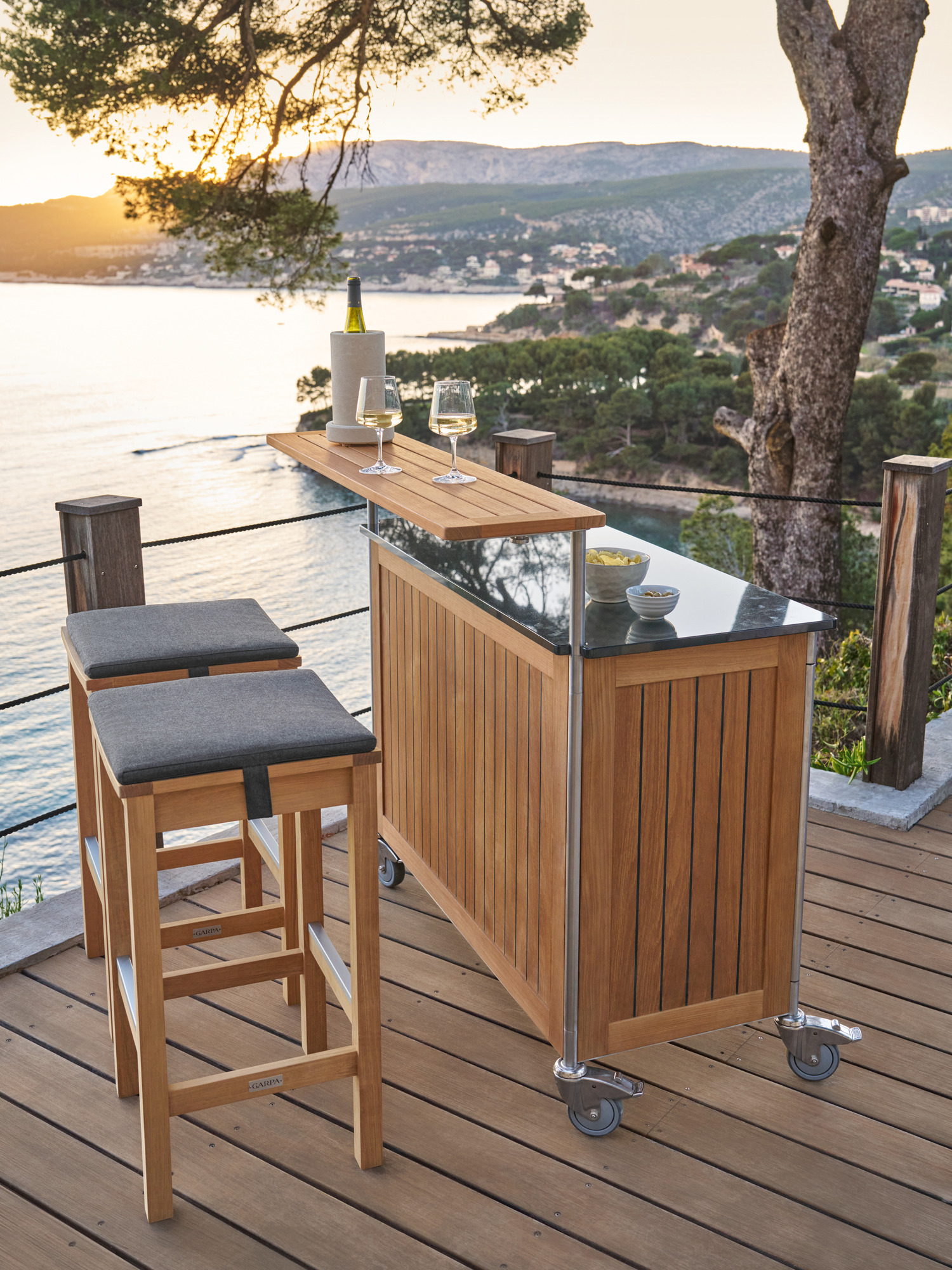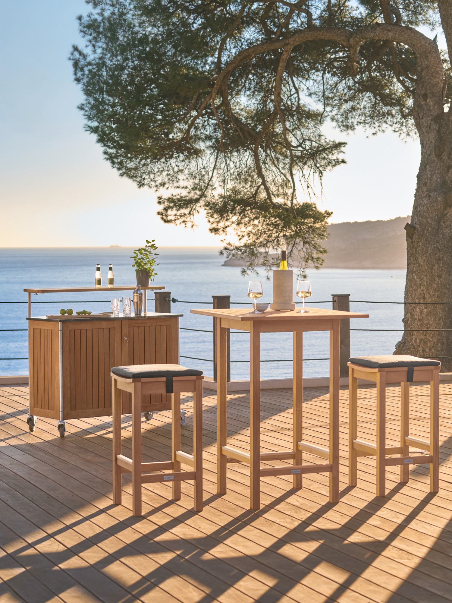 Im reduzierten Design offenbart sich gediegenes Handwerk – starkes Material, ergonomisch geformte Leisten, solide Verbindungen. Ob schneller Imbiss oder gesellige Happy Hour: Das Ensemble aus wetterfestem Teak lädt ein zum legeren Treff auf Balkon oder Terrasse. Die Stege an Tisch und Hocker werden durch Aluminiumprofile geschützt und geben den Füßen Halt. Passende Auflagen in Anthrazit finden Sie unter "Auflagen".