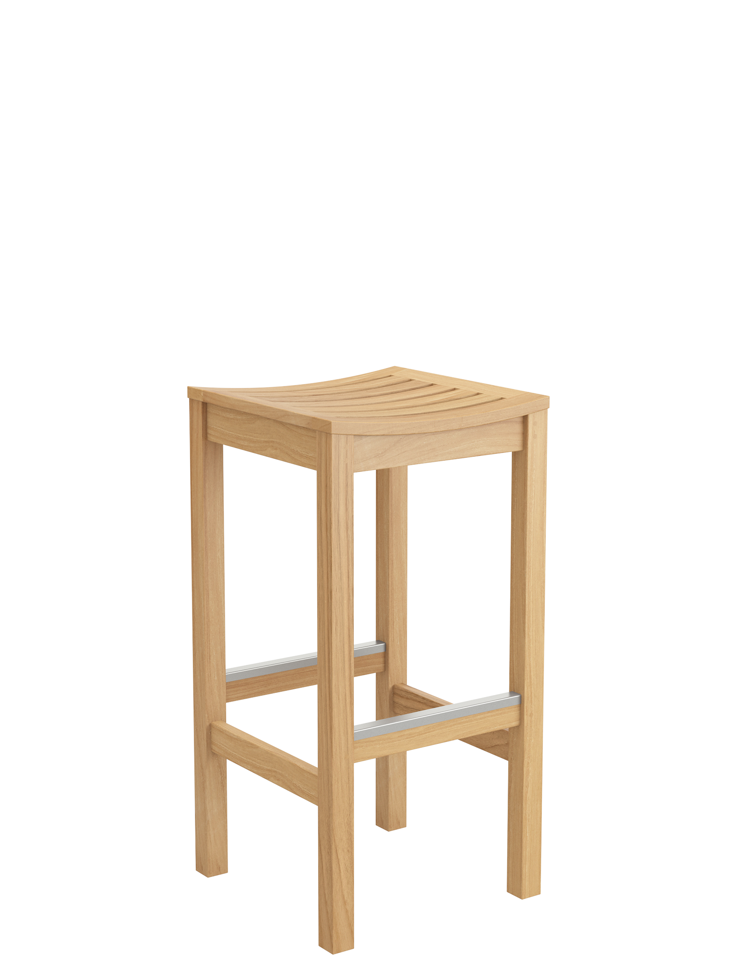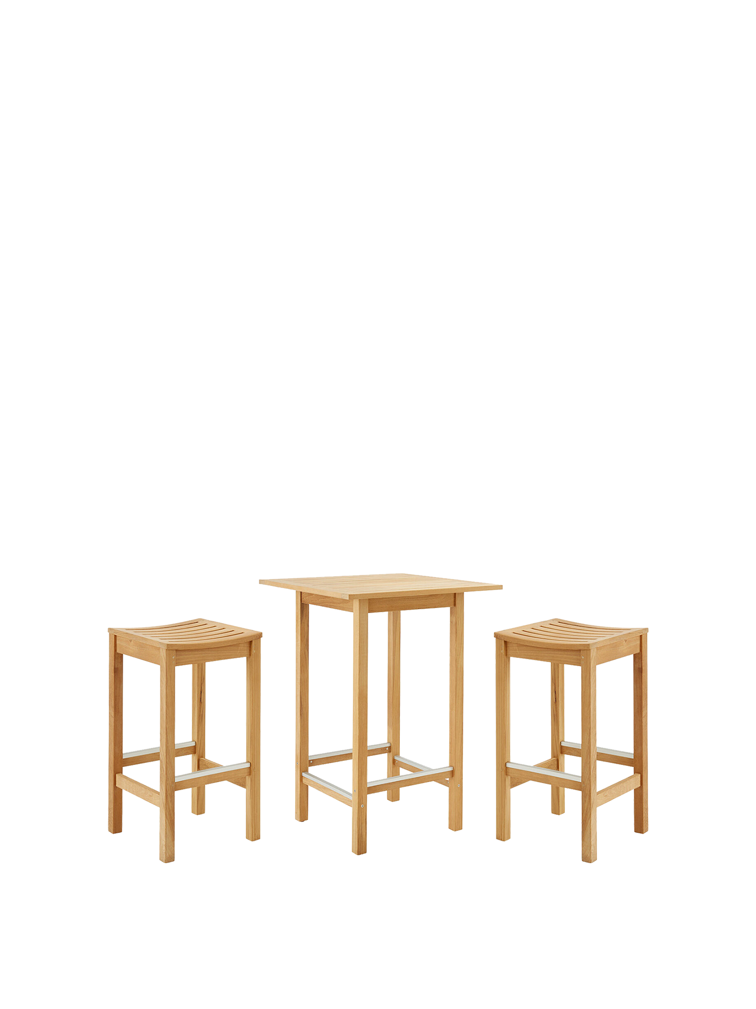 Ob schneller Imbiss oder gesellige Happy Hour: Das Trio aus wetterfestem Teak lädt ein zum legeren Treff auf Balkon oder Terrasse. Die Stege an Tisch und Hocker werden durch Aluminiumprofile geschützt und geben den Füßen Halt.