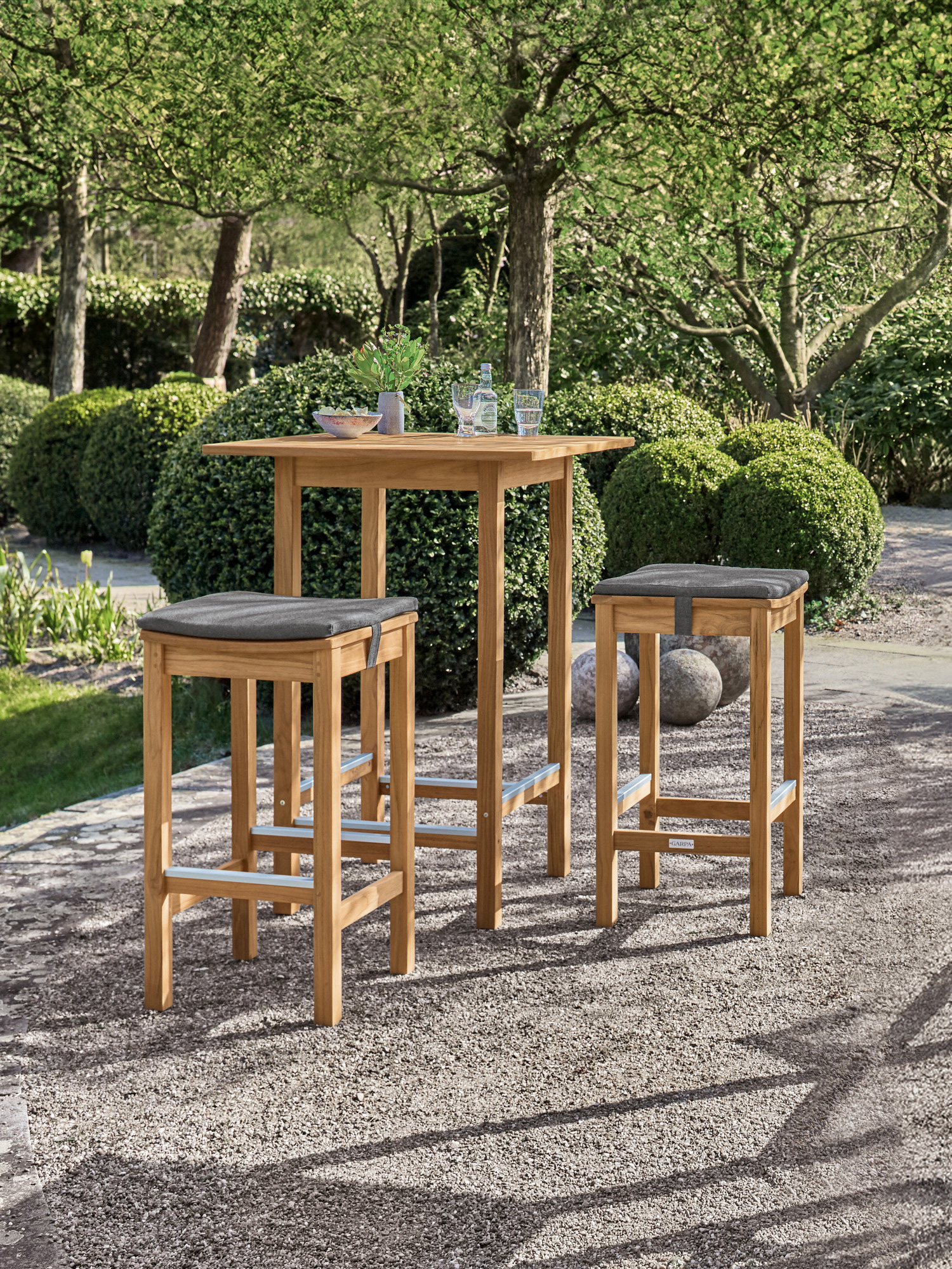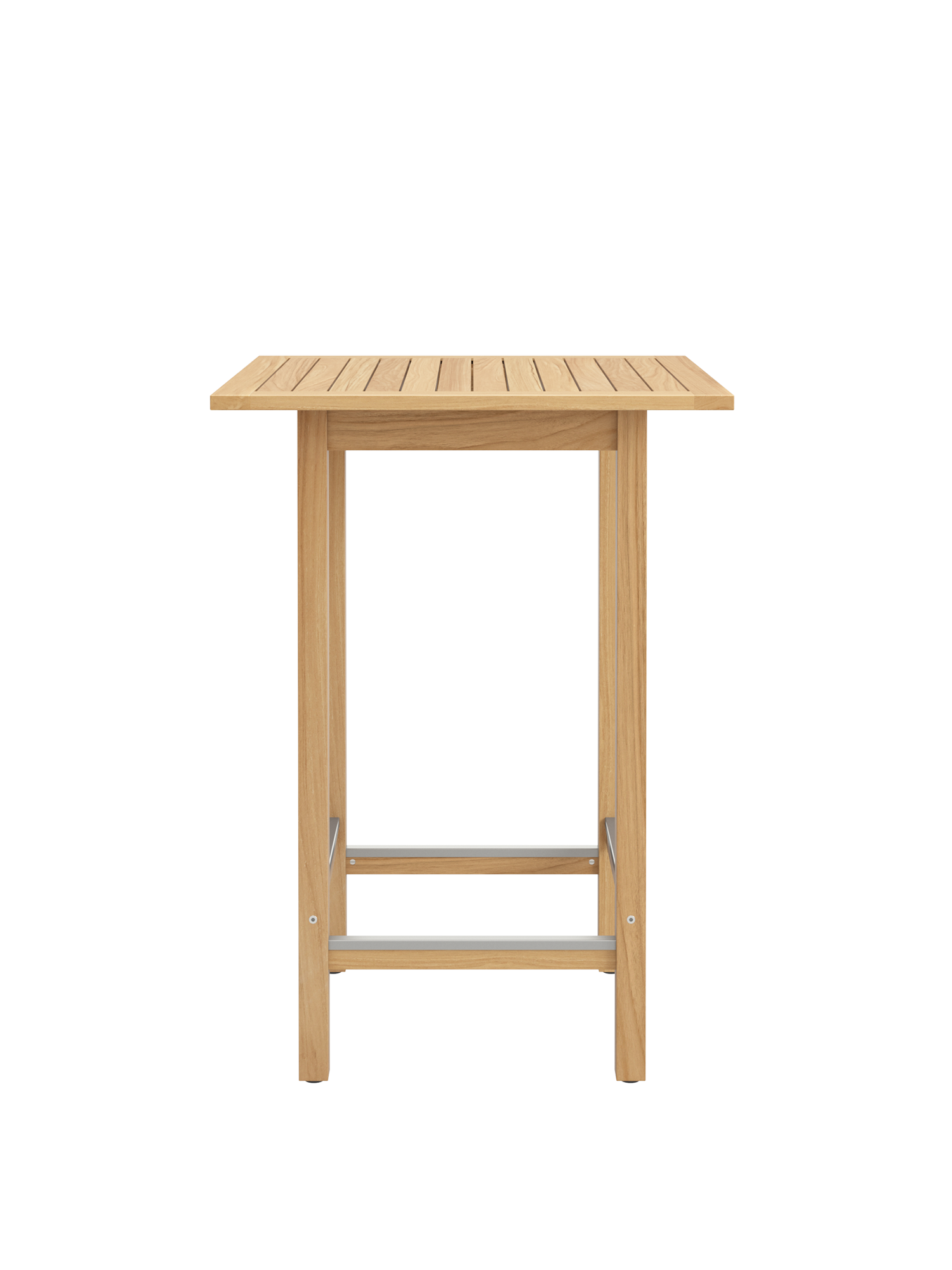 Im reduzierten Design offenbart sich gediegenes Handwerk – starkes Material, ergonomisch geformte Leisten, solide Verbindungen. Ob schneller Imbiss oder gesellige Happy Hour: Der hohe Bartisch aus wetterfestem Teak lädt ein zum legeren Treff auf Balkon oder Terrasse. Die Stege an Tisch und passendem Hocker werden durch Aluminiumprofile geschützt und geben den Füßen Halt.