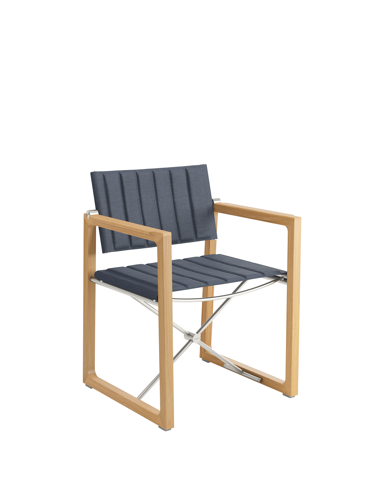 Die modernen Armlehnstühle verbreiten ein unbeschwertes Lebensgefühl. Geradlinige Teakholzwangen rahmen Sitz- und Rückenpolster; ein Edelstahlkreuz verbindet die puristische, dabei äusserst komfortable Konstruktion. Aus satiniertem Edelstahl sind auch die Gelenke, die die Rückenlehne in die bequemste Position bringen.