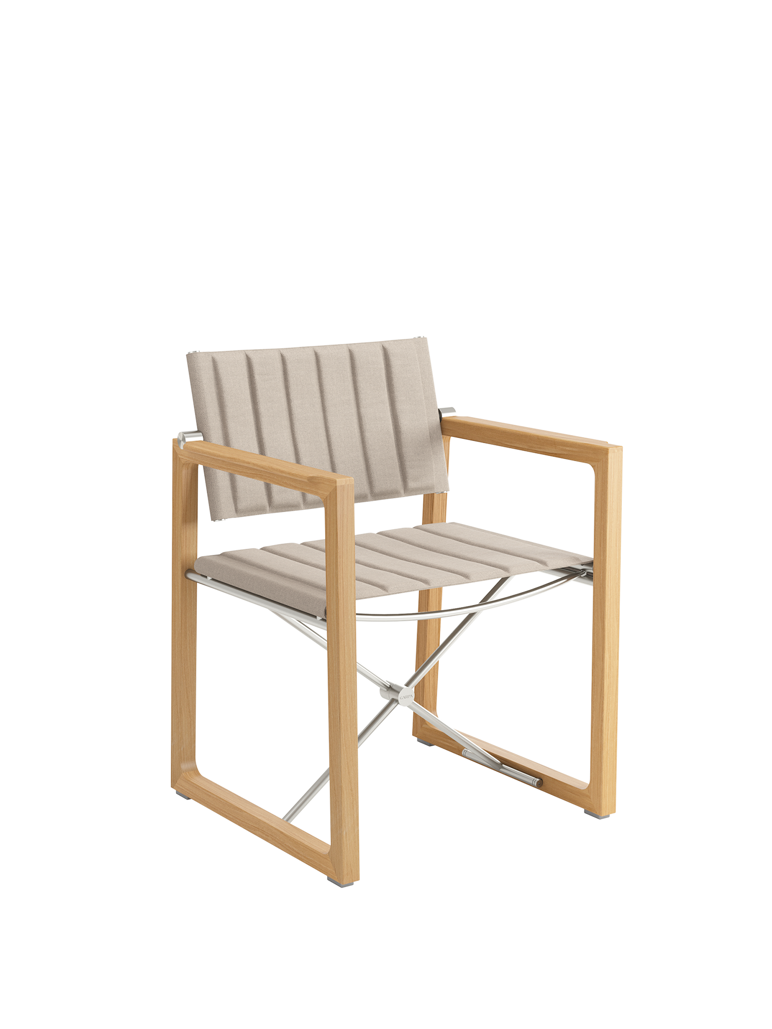 Die modernen Armlehnstühle verbreiten ein unbeschwertes Lebensgefühl. Geradlinige Teakholzwangen rahmen Sitz- und Rückenpolster; ein Edelstahlkreuz verbindet die puristische, dabei äusserst komfortable Konstruktion. Aus satiniertem Edelstahl sind auch die Gelenke, die die Rückenlehne in die bequemste Position bringen.