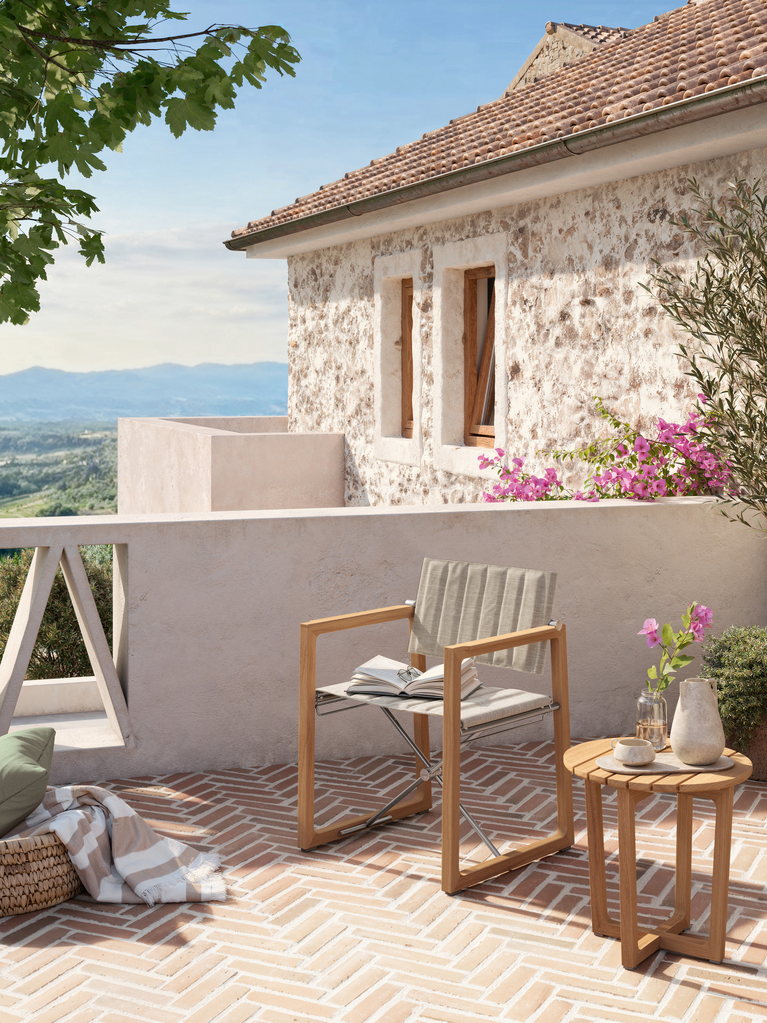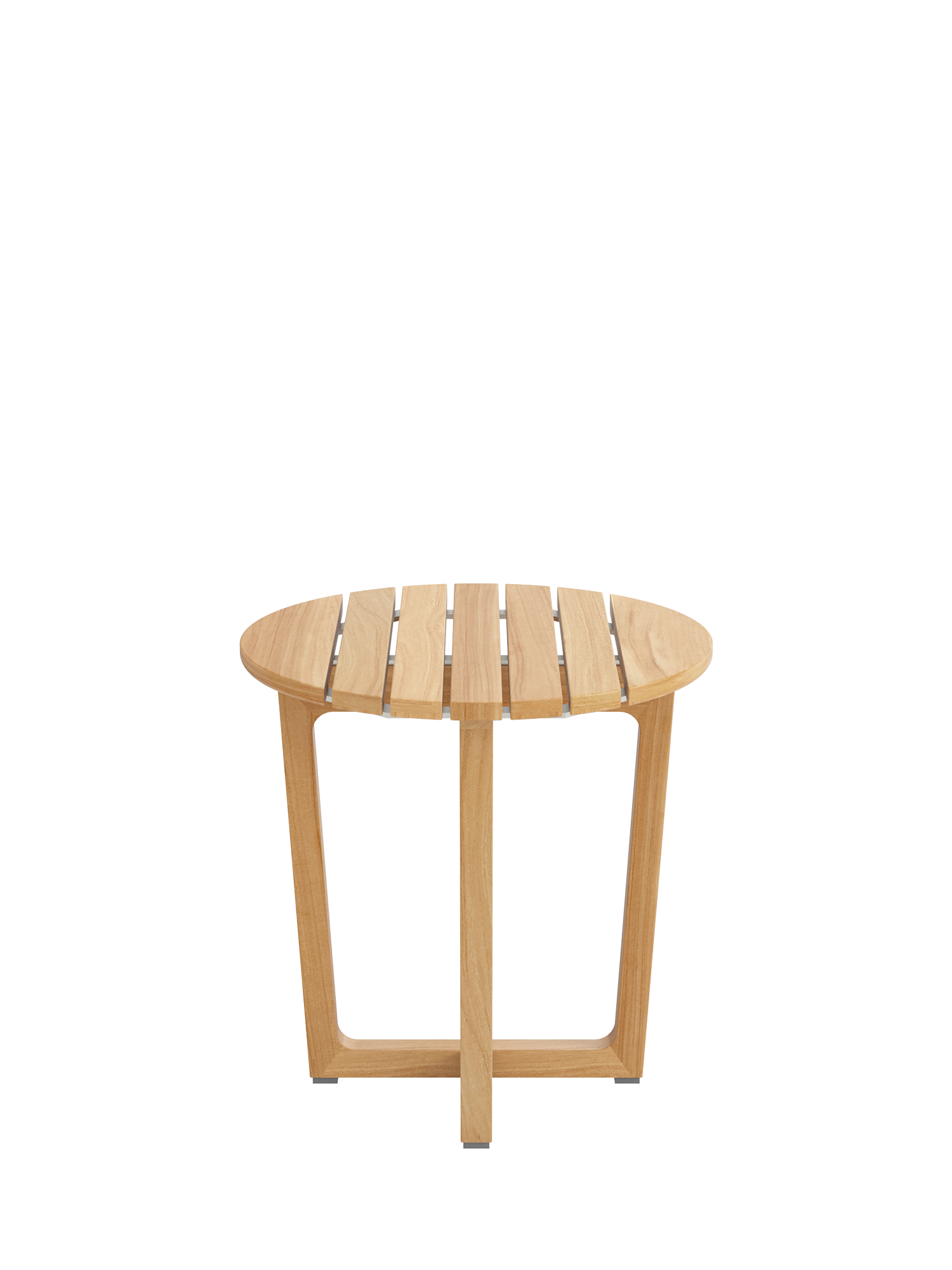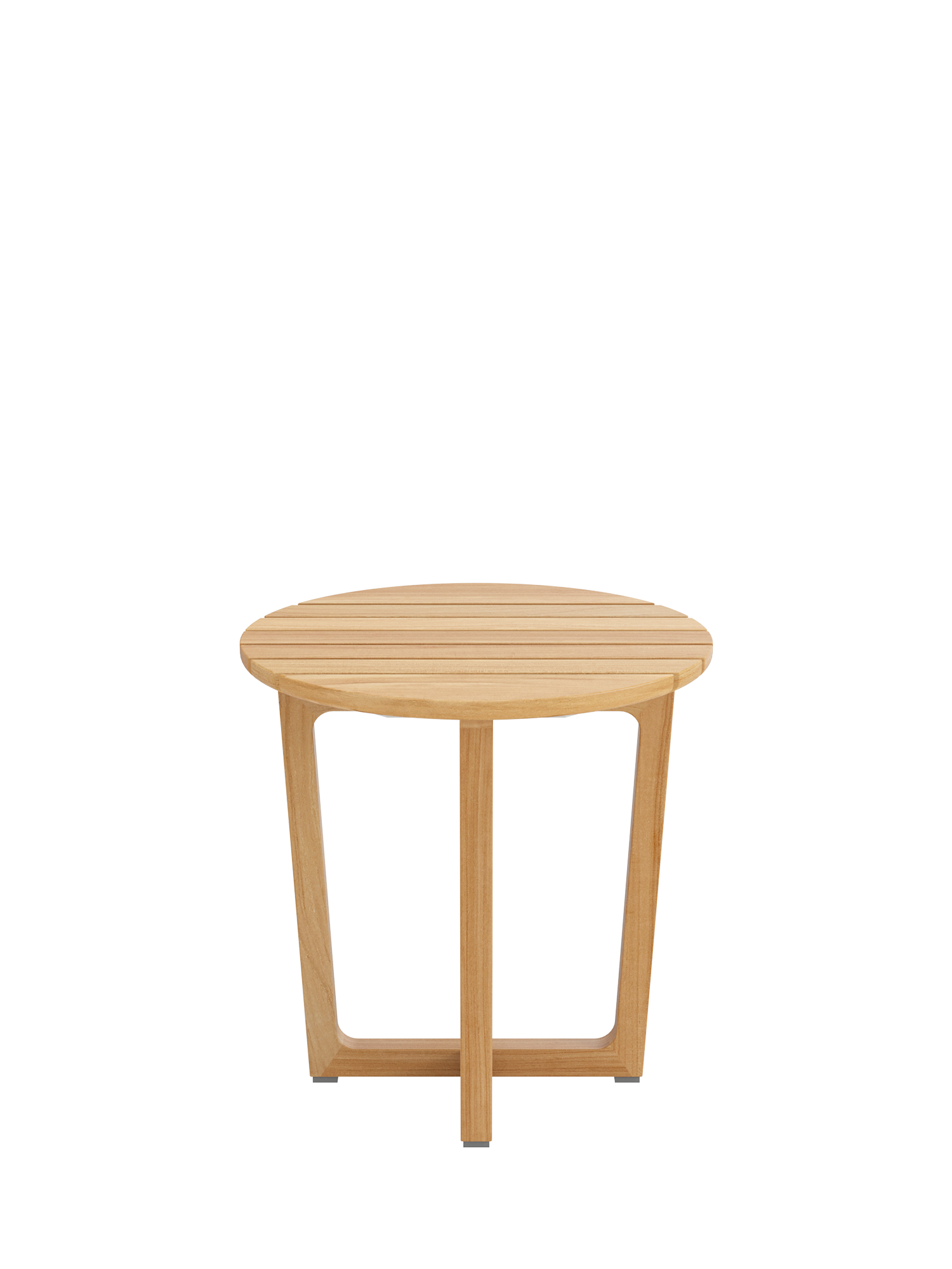 Teakholzwangen und eine an der Unterseite sanft gerundete Platte aus hochwertigen Teakleisten prägen das Design der Benton Beistelltische. Sie sind schnell dazugestellt und halten Snacks und Lektüre direkt neben der Sitzgruppe bereit.