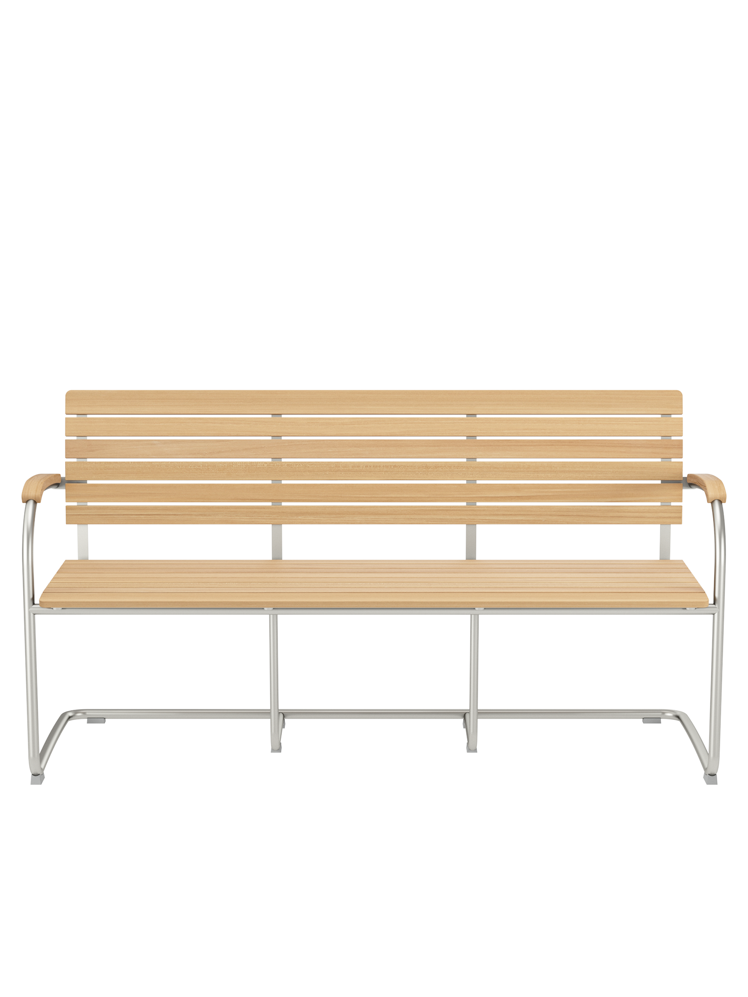Für die Befestigung von Sitz- und Rückenflächen wurde statt eines Rundrohrs ein flacher Edelstahlrahmen gewählt. Er schmiegt sich den breiten Teakleisten an und hält sie selbst bei großen Schwingungen dauerhaft fest. Unter dem Gestell befinden sich auswechselbare Gleiter aus Kunststoff, die empfindliche Böden schützen.