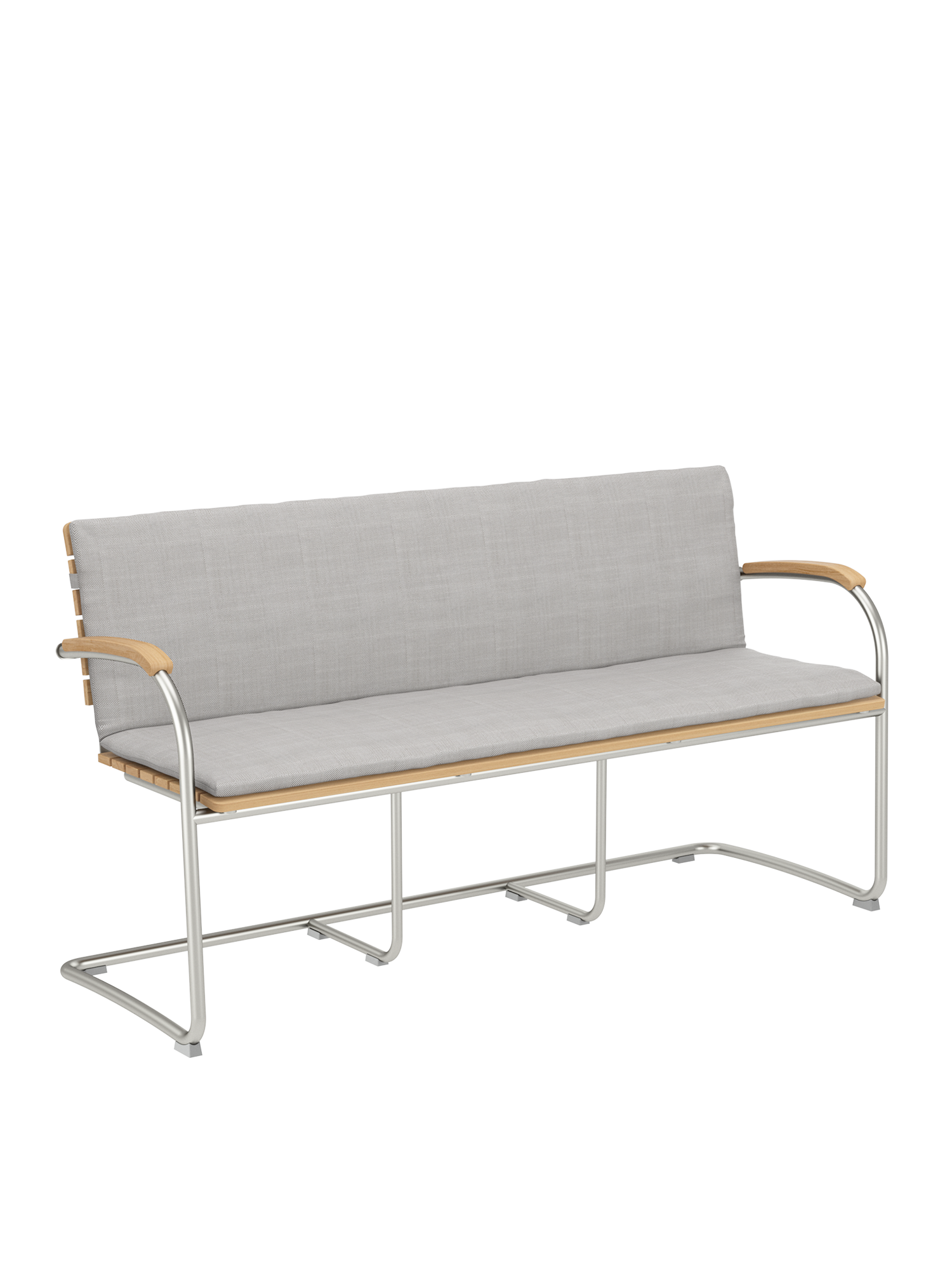 In den vom Bauhaus inspirierten Möbeln der Serie Bolero ergänzen sich edles Metall und warmes Teakholz in idealer Weise. Sitz- und Rückenflächen der Bank aus Teak sind ergonomisch geformt und sorgen für besonderen Komfort. Das Rohrgestell aus satiniertem Edelstahl trotzt allen Wetterlaunen, die gewölbten Armlehnen aus Teak passen sich seinem Profil an und schmeicheln den Händen. Auflagen in verschiedenen Farbtönen erhöhen noch die Bequemlichkeit der Möbel und setzen feine Akzente.