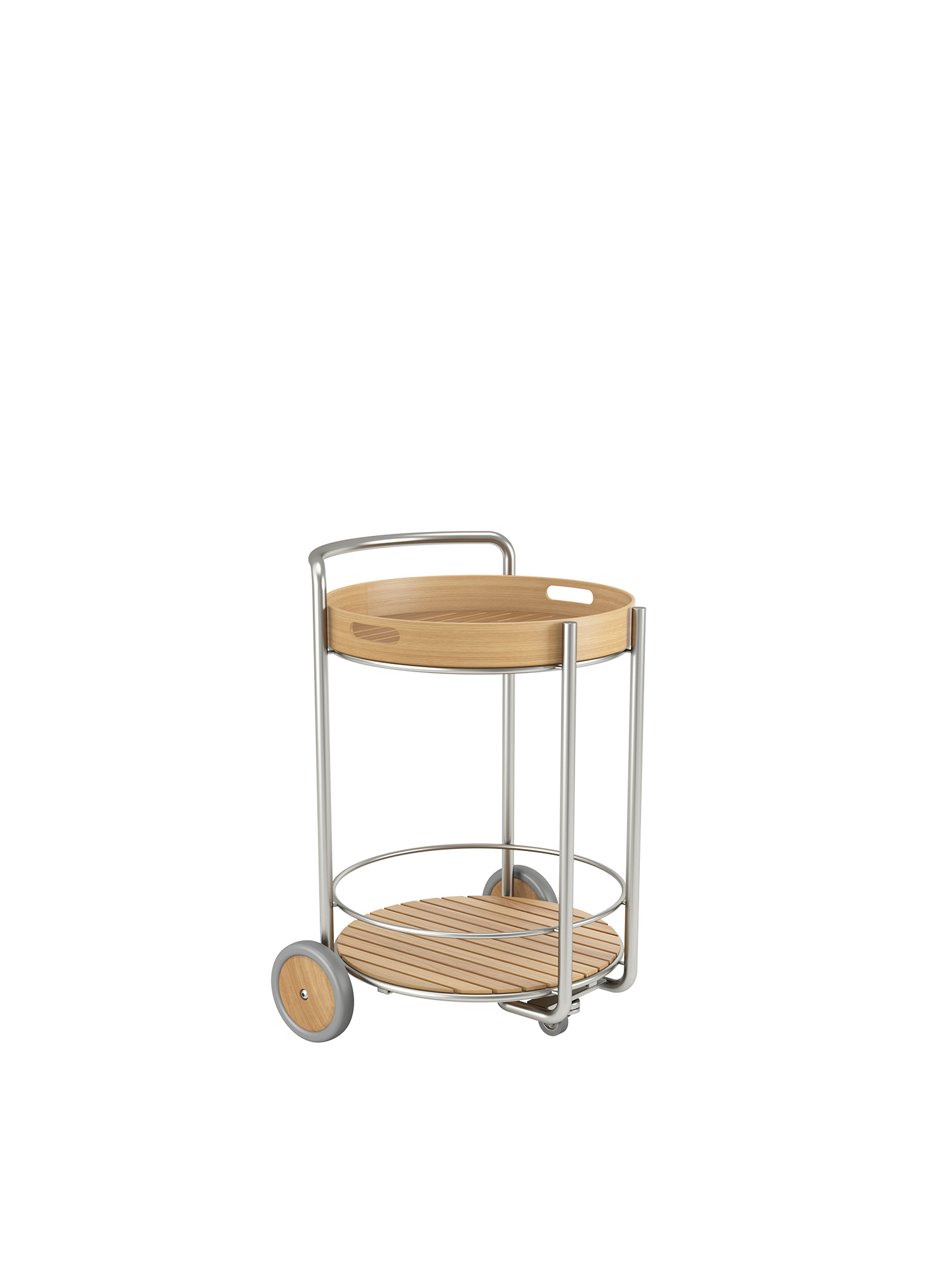 Inspiriert von den Grundformen des Bauhaus-Designs, erweitert der Barwagen den Spielraum der Bolero Kollektion aus Teak und Edelstahl. Das obere Tablett ist abnehmbar, die untere Reling schützt Flaschen und Geschirr. Zwei große Teakräder sowie eine bewegliche Lenkrolle machen ihn mobil. Das runde Tablett ist auch einzeln (Ref. 2620) erhältlich.