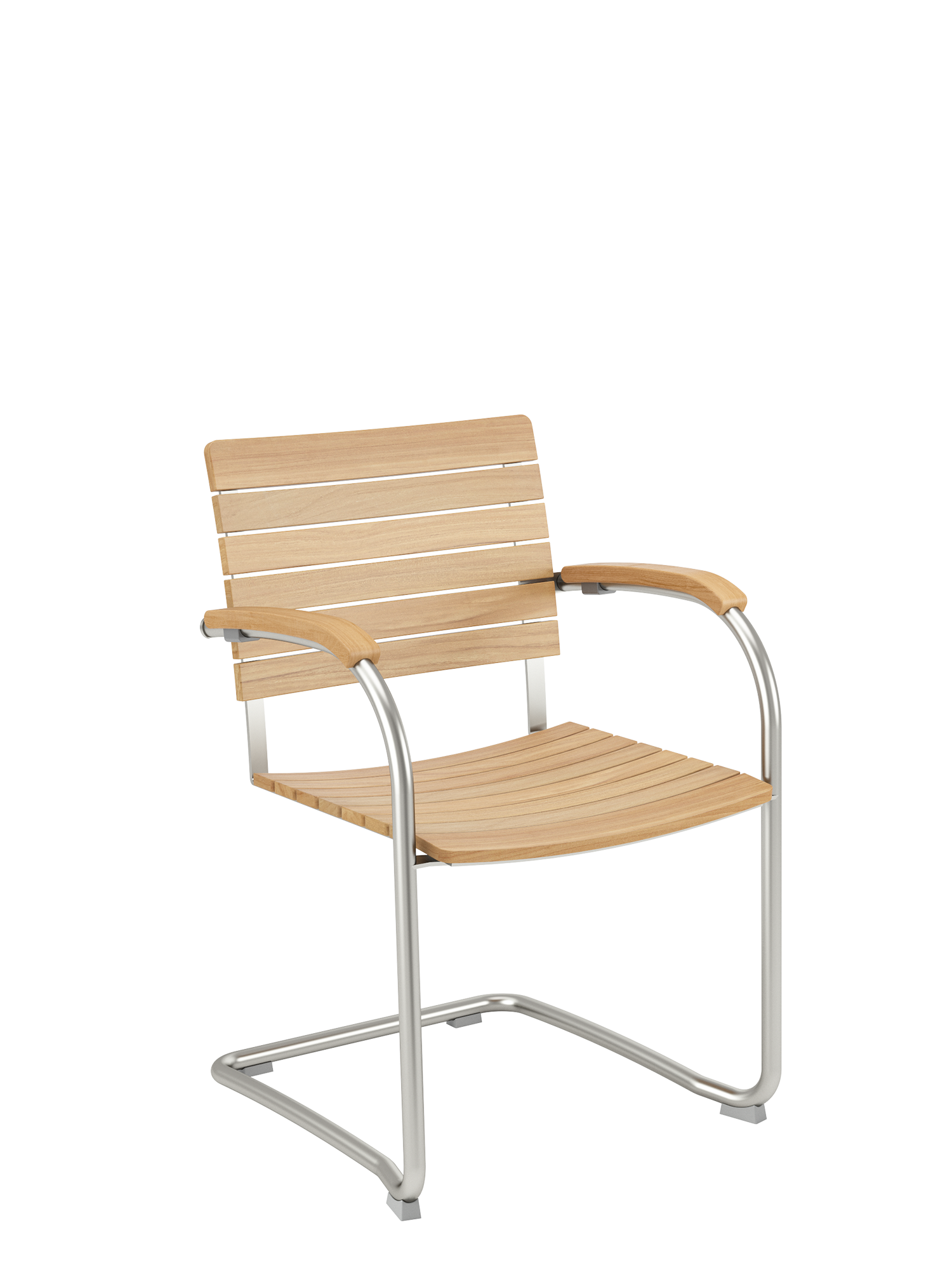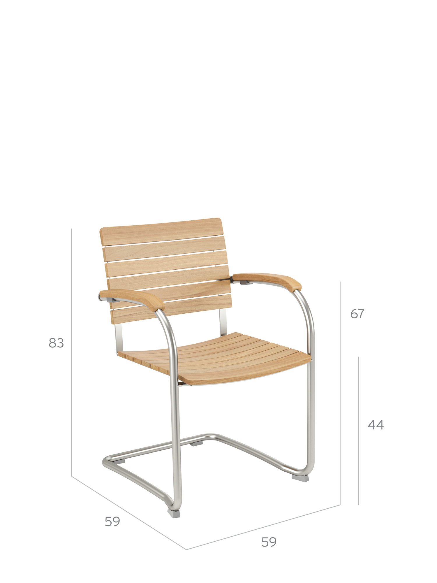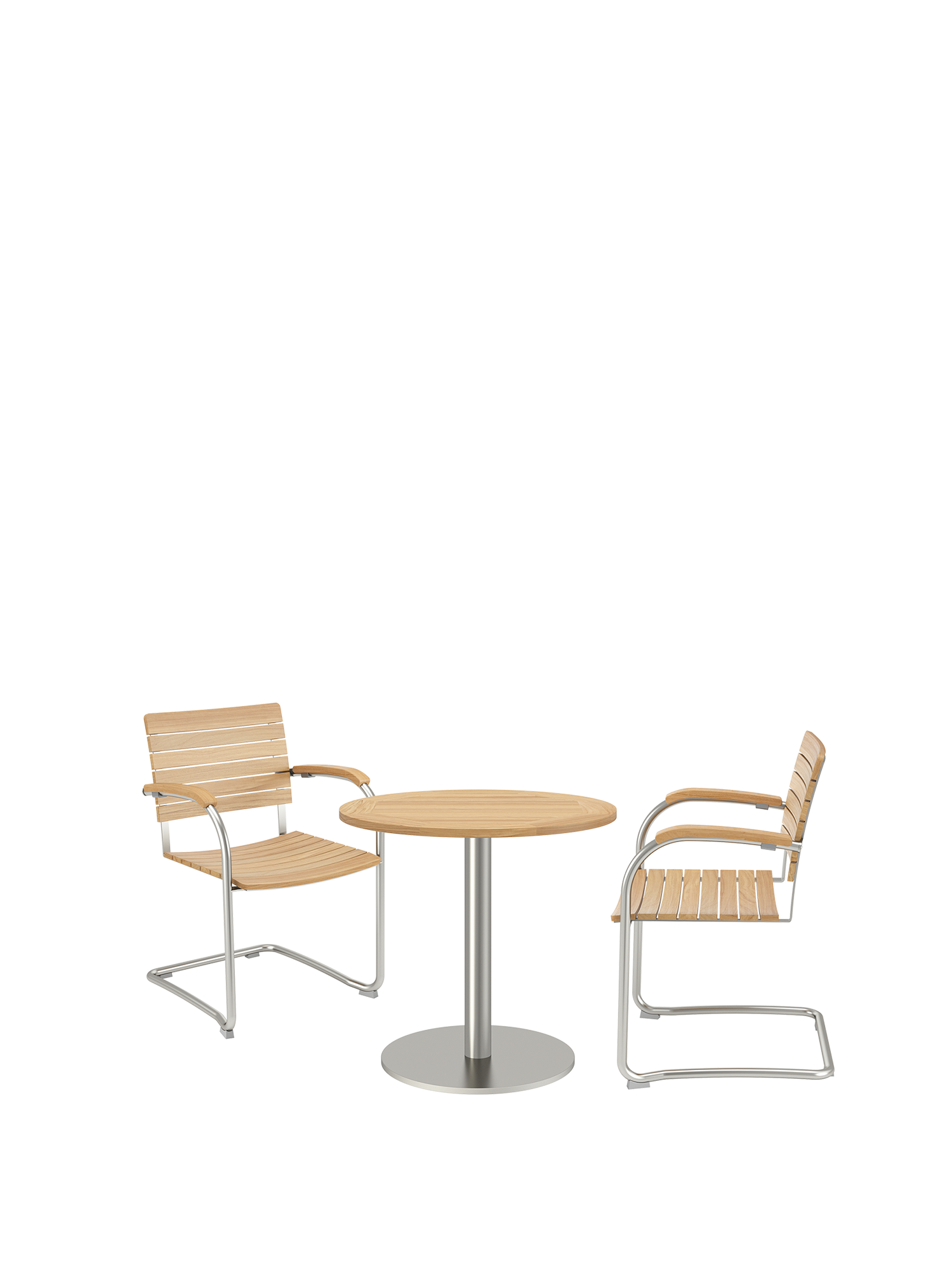 Der stapelbare Freischwinger hat ergonomisch geformte Sitz- und Rückenflächen aus Teak. Das Rohrgestell aus satiniertem Edelstahl trotzt allen Wetterlaunen, die gewölbten Armlehnen aus Teak schmeicheln den Händen. Der Ronda Mittelfußtisch in der gleichen Materialkombination schafft angenehmen Freiraum für die Beine und bietet bis zu vier Personen Platz.