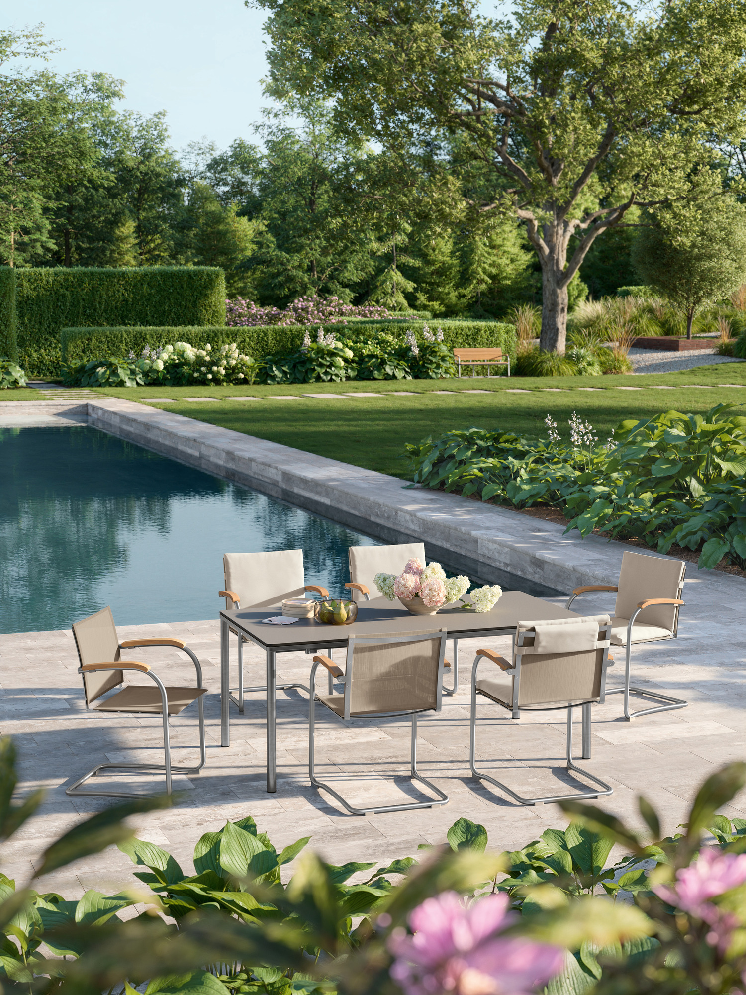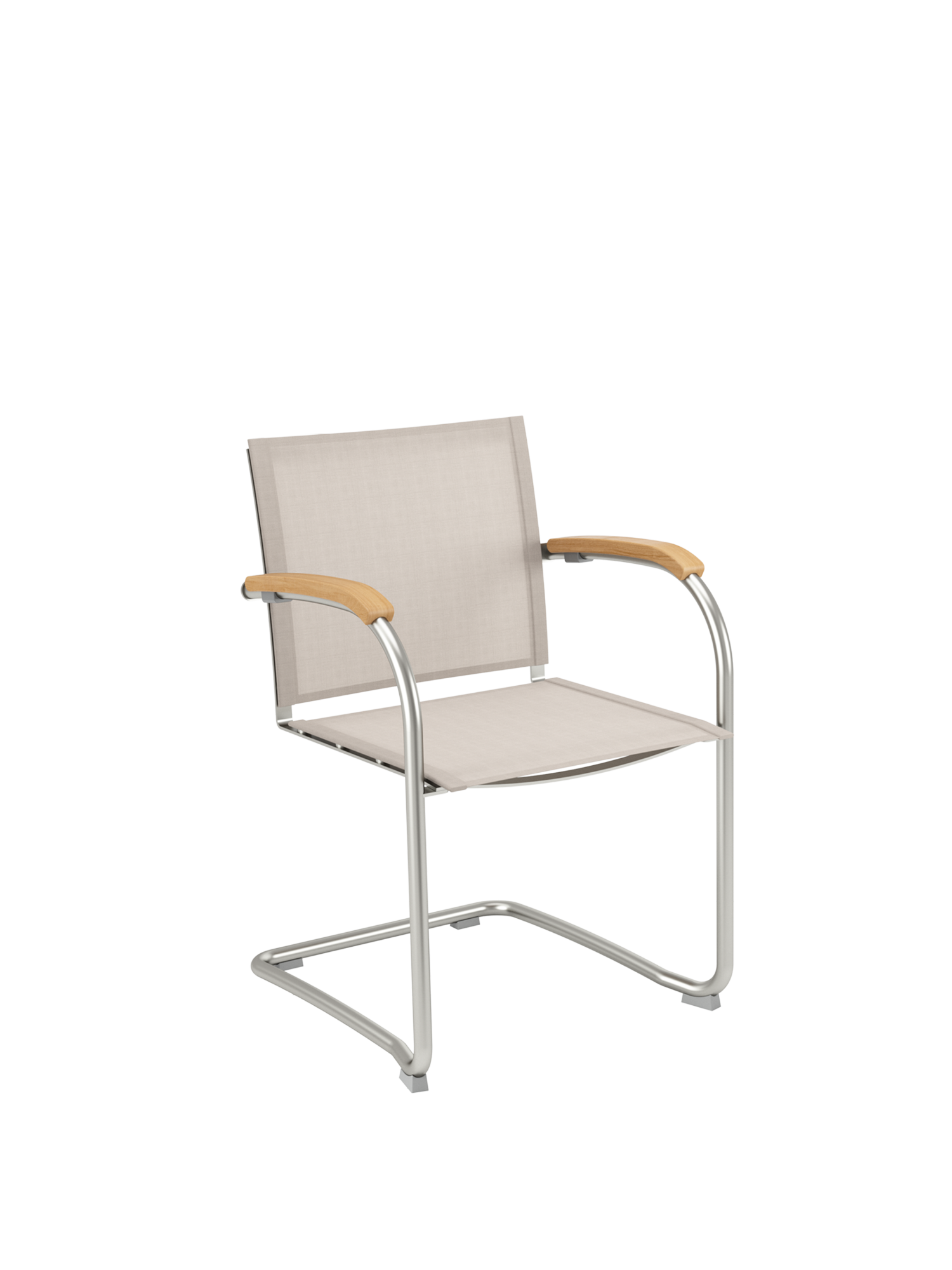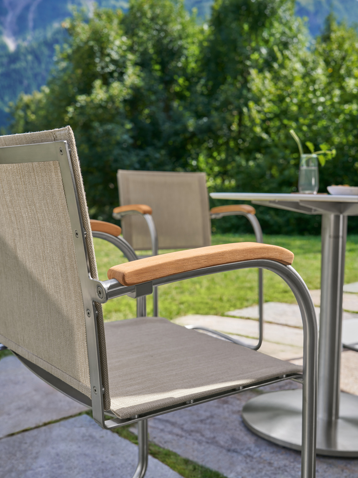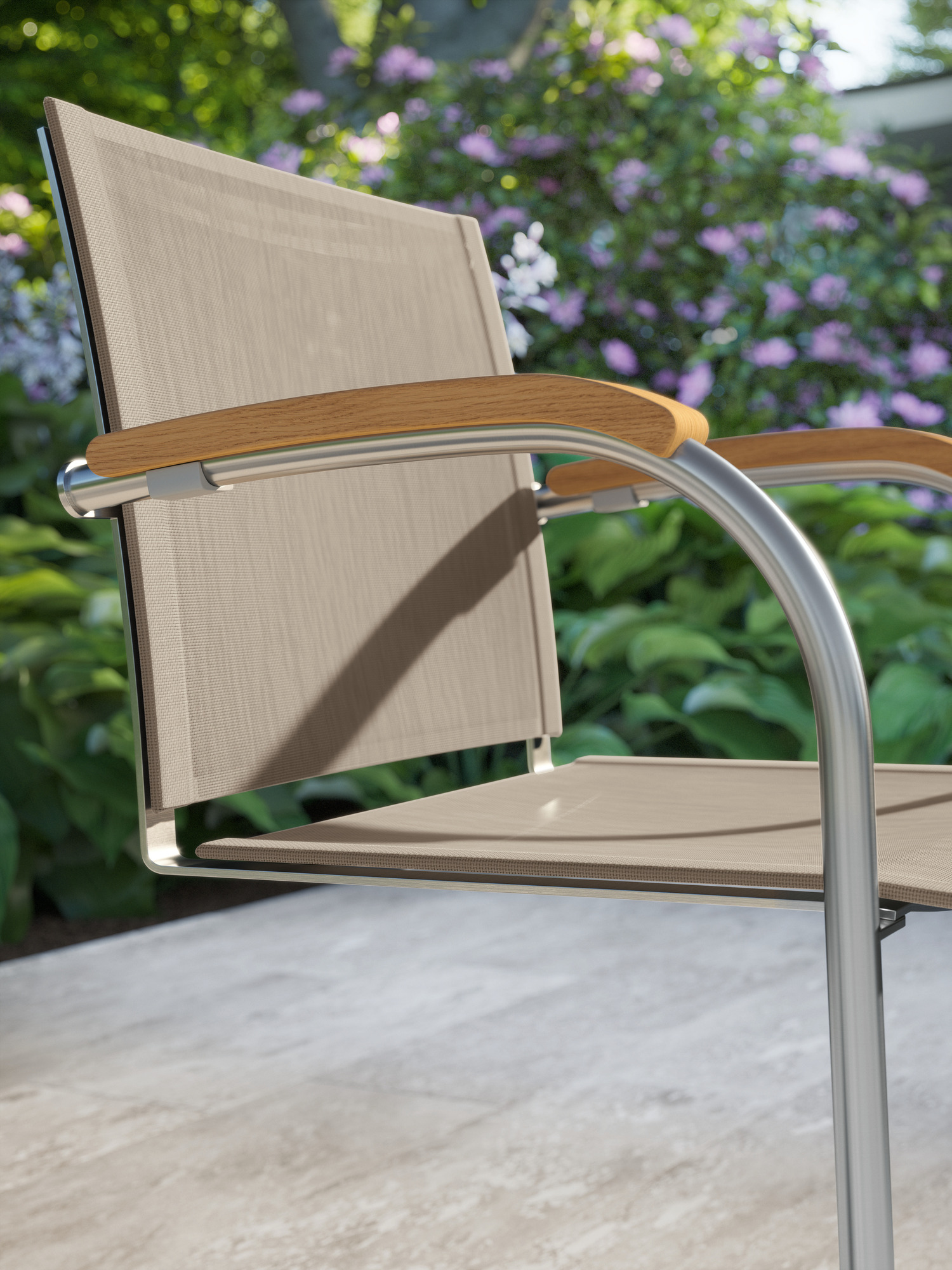 Das Gewebe des Freischwingers zeichnet sich durch eine angenehm natürliche, textile Haptik aus. Anschmiegsam und straff zugleich, empfiehlt es sich mit oder ohne Polster für unbeschwertes Sitzen. Der natürliche Farbton, eine Melange zwischen zartem Braun und hellem Beige, unterstreicht die Eleganz der Möbel. Das Rohrgestell aus satiniertem Edelstahl trotzt allen Wetterlaunen, die gewölbten Armlehnen aus Teak passen sich seinem Profil an und schmeicheln den Händen. Auflagen in verschiedenen Farbtönen erhöhen noch die Bequemlichkeit der Möbel und setzen feine Akzente.