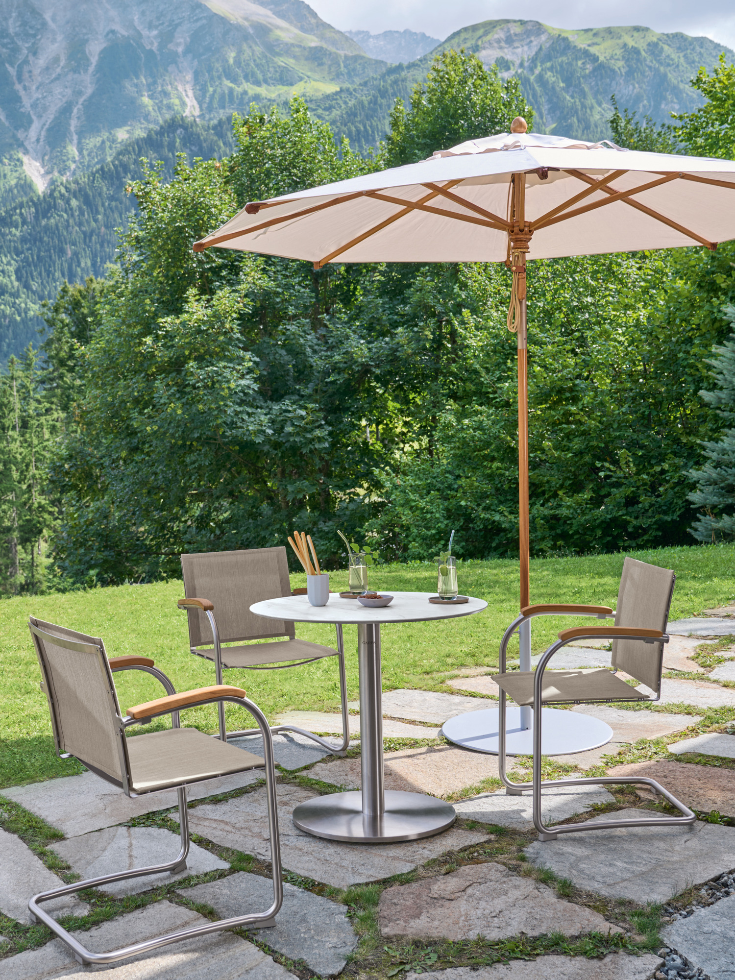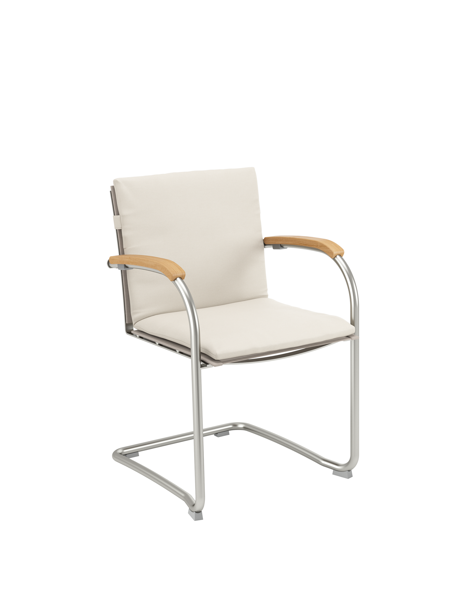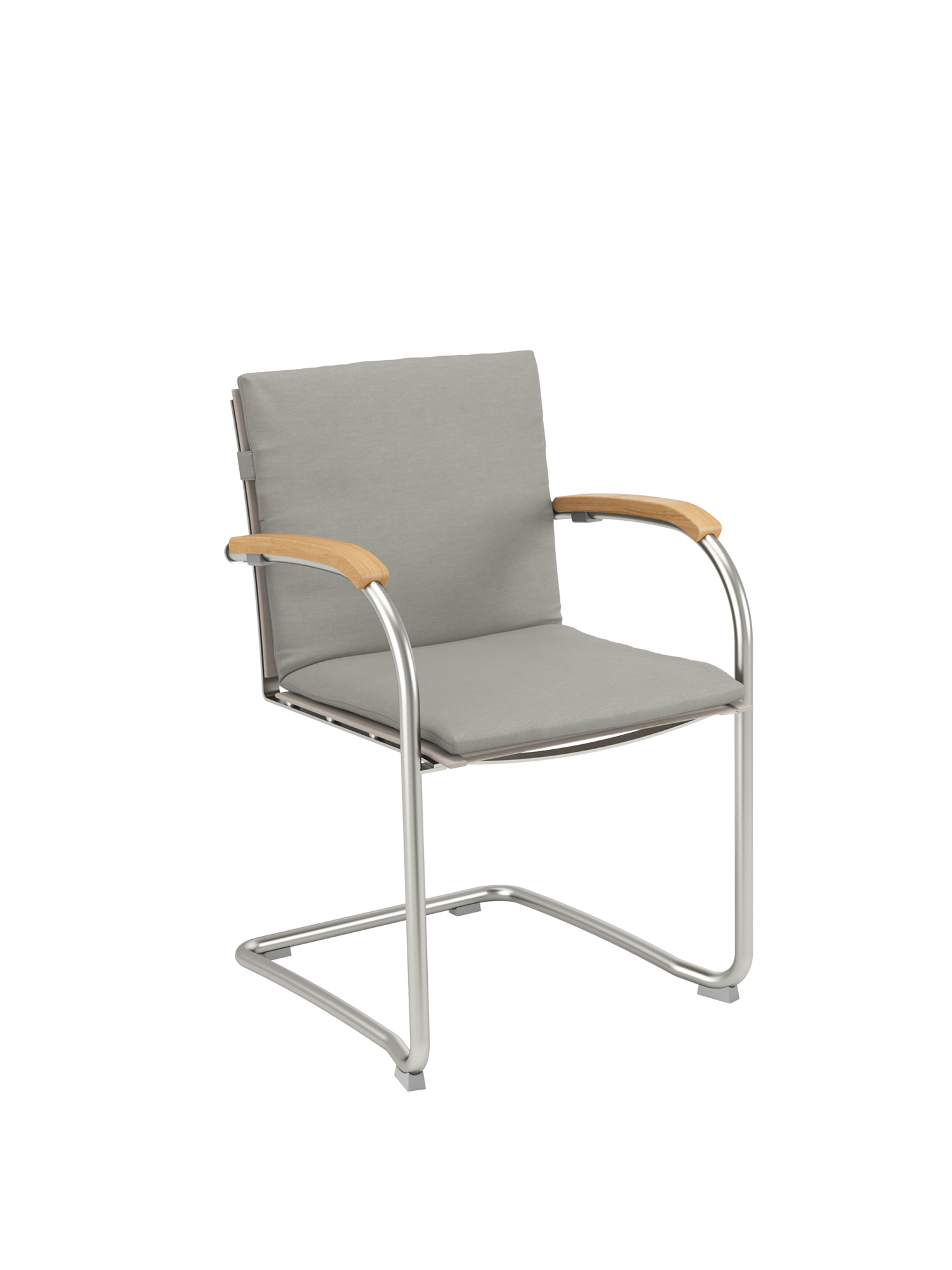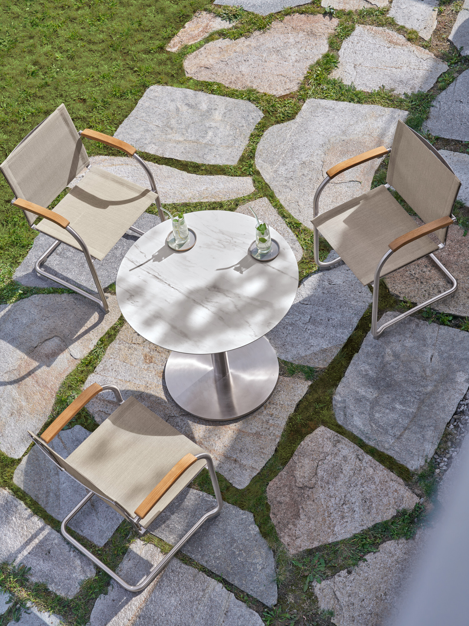 Das Gewebe des Freischwingers zeichnet sich durch eine angenehm natürliche, textile Haptik aus. Anschmiegsam und straff zugleich, empfiehlt es sich mit oder ohne Polster für unbeschwertes Sitzen. Der natürliche Farbton, eine Melange zwischen zartem Braun und hellem Beige, unterstreicht die Eleganz der Möbel. Das Rohrgestell aus satiniertem Edelstahl trotzt allen Wetterlaunen, die gewölbten Armlehnen aus Teak passen sich seinem Profil an und schmeicheln den Händen. Auflagen in verschiedenen Farbtönen erhöhen noch die Bequemlichkeit der Möbel und setzen feine Akzente.