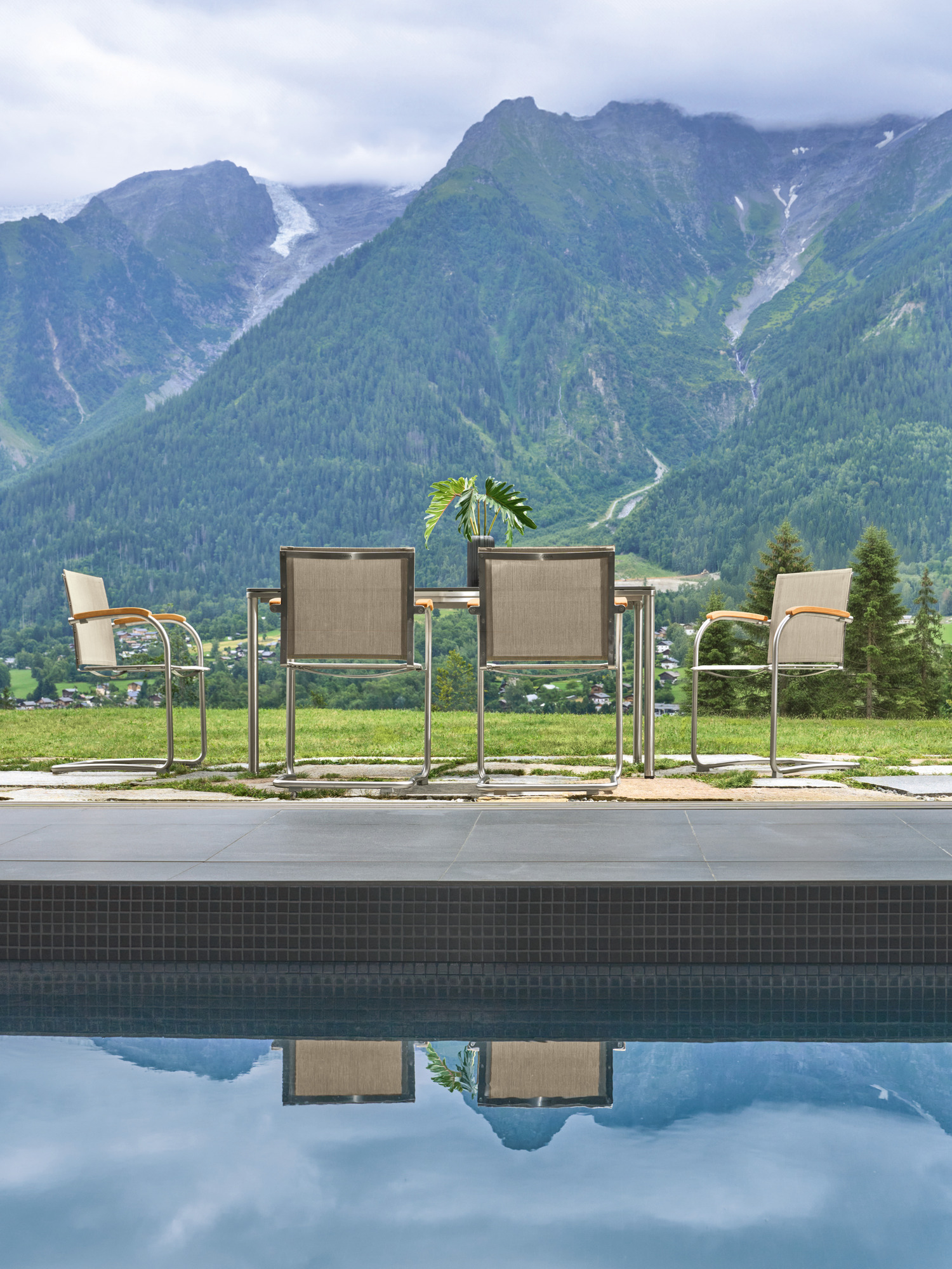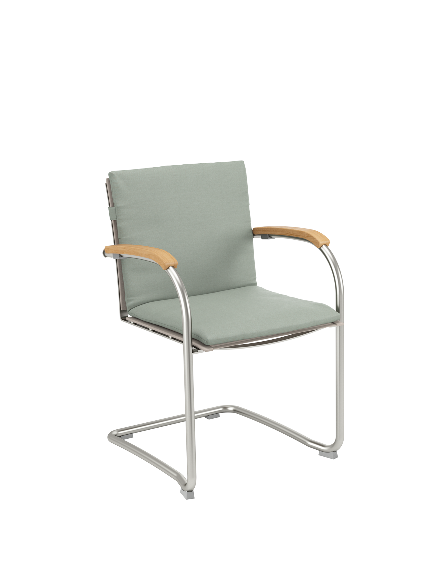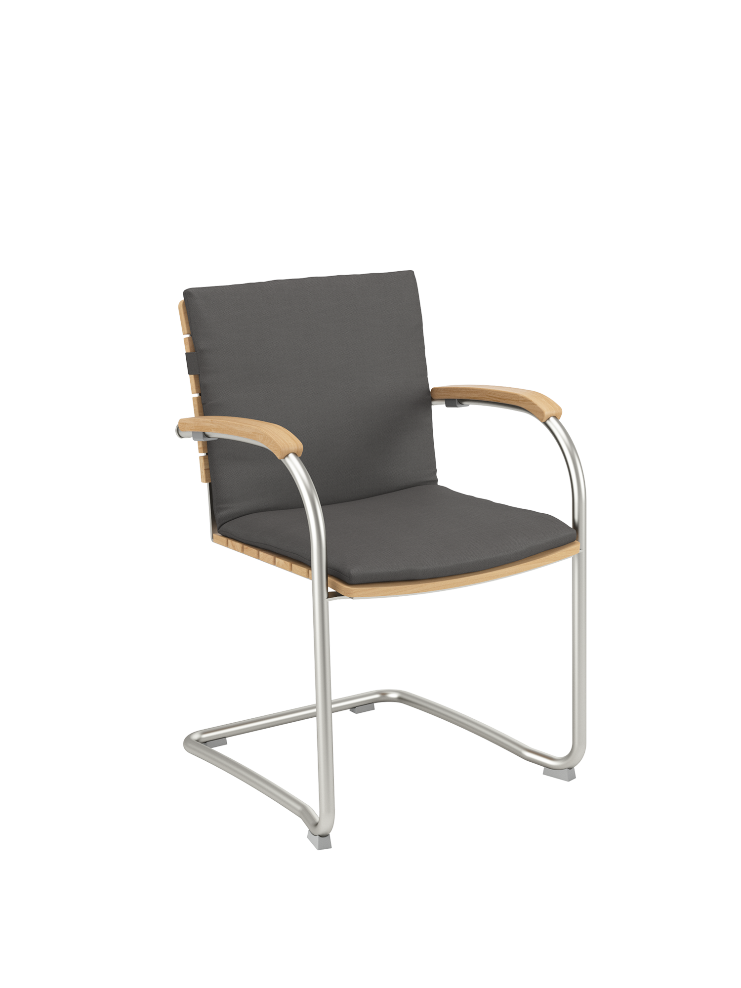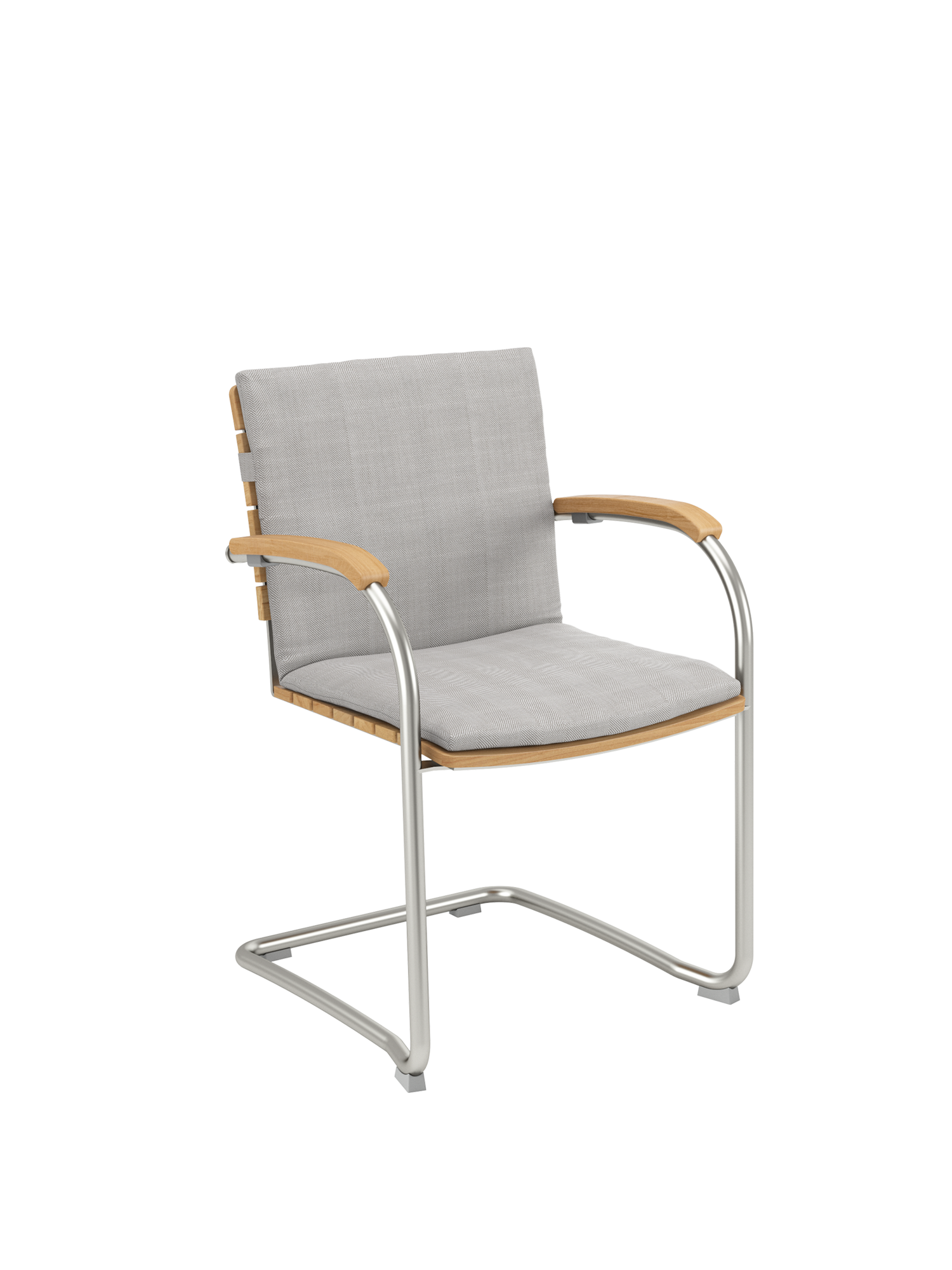 Das Gewebe des Freischwingers zeichnet sich durch eine angenehm natürliche, textile Haptik aus. Anschmiegsam und straff zugleich, empfiehlt es sich mit oder ohne Polster für unbeschwertes Sitzen. Der natürliche Farbton, eine Melange zwischen zartem Braun und hellem Beige, unterstreicht die Eleganz der Möbel. Das Rohrgestell aus satiniertem Edelstahl trotzt allen Wetterlaunen, die gewölbten Armlehnen aus Teak passen sich seinem Profil an und schmeicheln den Händen. Auflagen in verschiedenen Farbtönen erhöhen noch die Bequemlichkeit der Möbel und setzen feine Akzente.