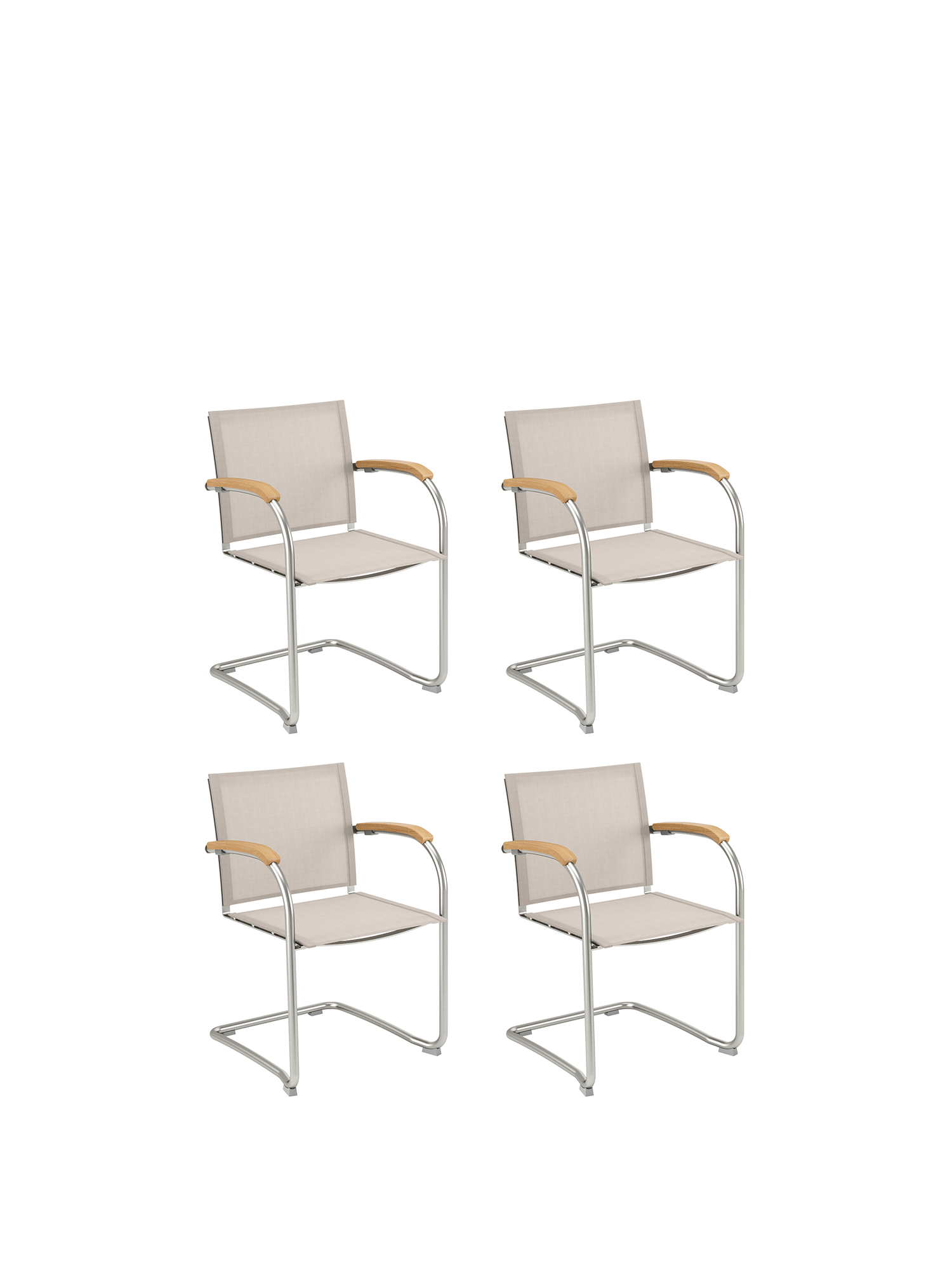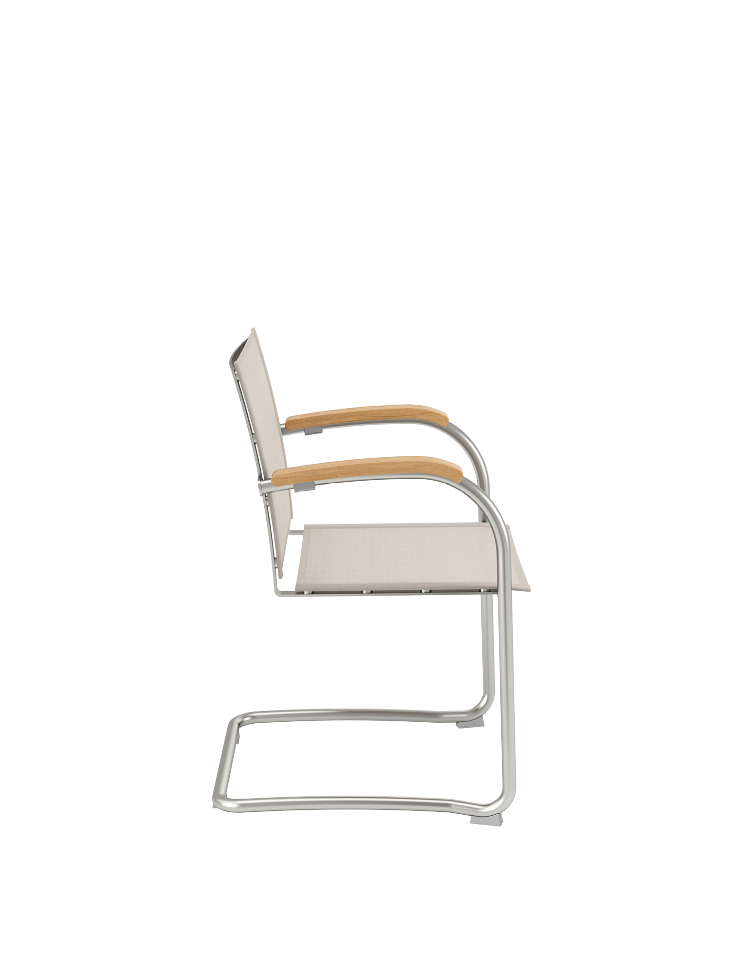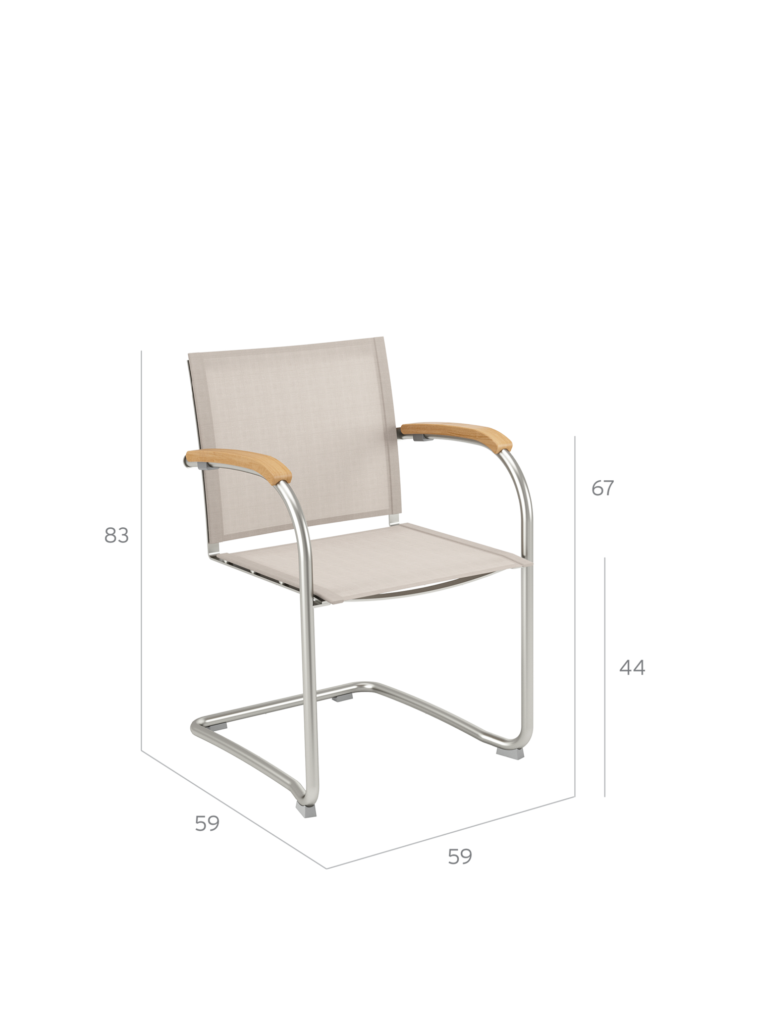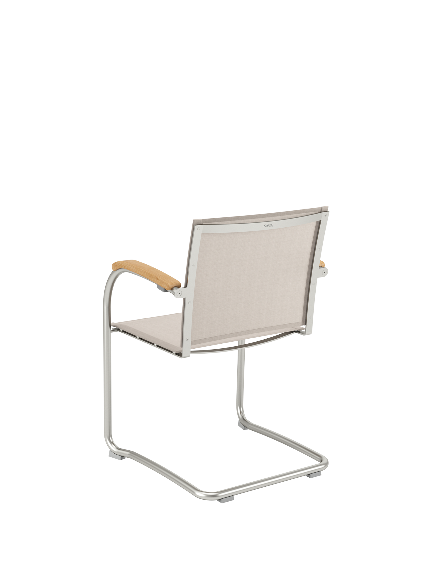 Das Polymergewebe des Freischwingers zeichnet sich durch eine angenehm natürliche, textile Haptik aus. Anschmiegsam und straff zugleich, empfiehlt es sich mit oder ohne Polster für unbeschwertes Sitzen. Das Rohrgestell aus satiniertem Edelstahl trotzt allen Wetterlaunen, die gewölbten Armlehnen aus Teak passen sich seinem Profil an und schmeicheln den Händen. Bolero Freischwinger beanspruchen wenig Platz, denn sie lassen sich, dank kleiner Stopper unter den Armlehnen, reibungslos stapeln. Bis zu vier Stühle passen übereinander.