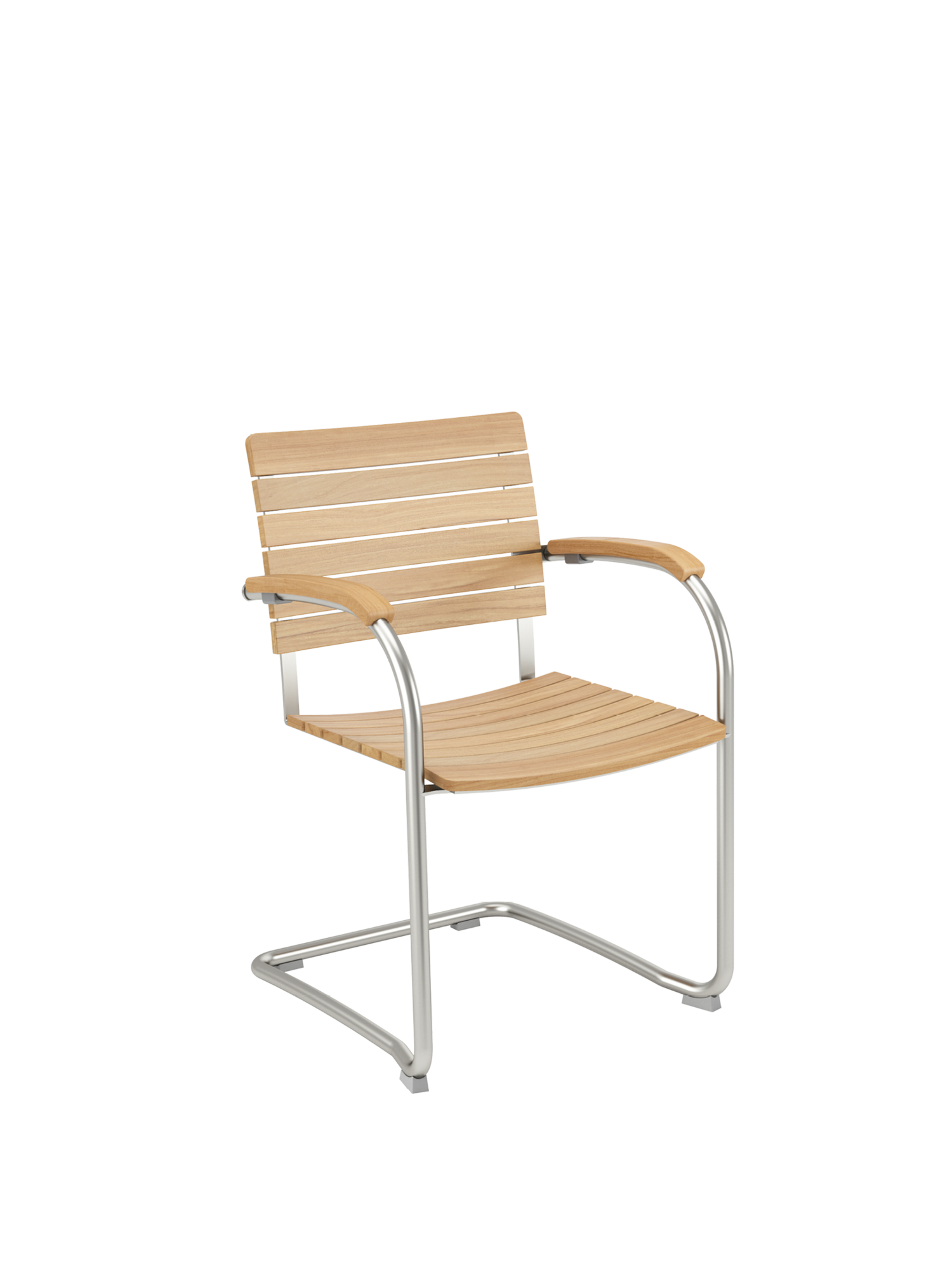 Die Sitz- und Rückenflächen aus Teak sind ergonomisch geformt und sorgen für besonderen Komfort. Das Rohrgestell aus satiniertem Edelstahl trotzt allen Wetterlaunen, die gewölbten Armlehnen aus Teak passen sich seinem Profil an und schmeicheln den Händen.
