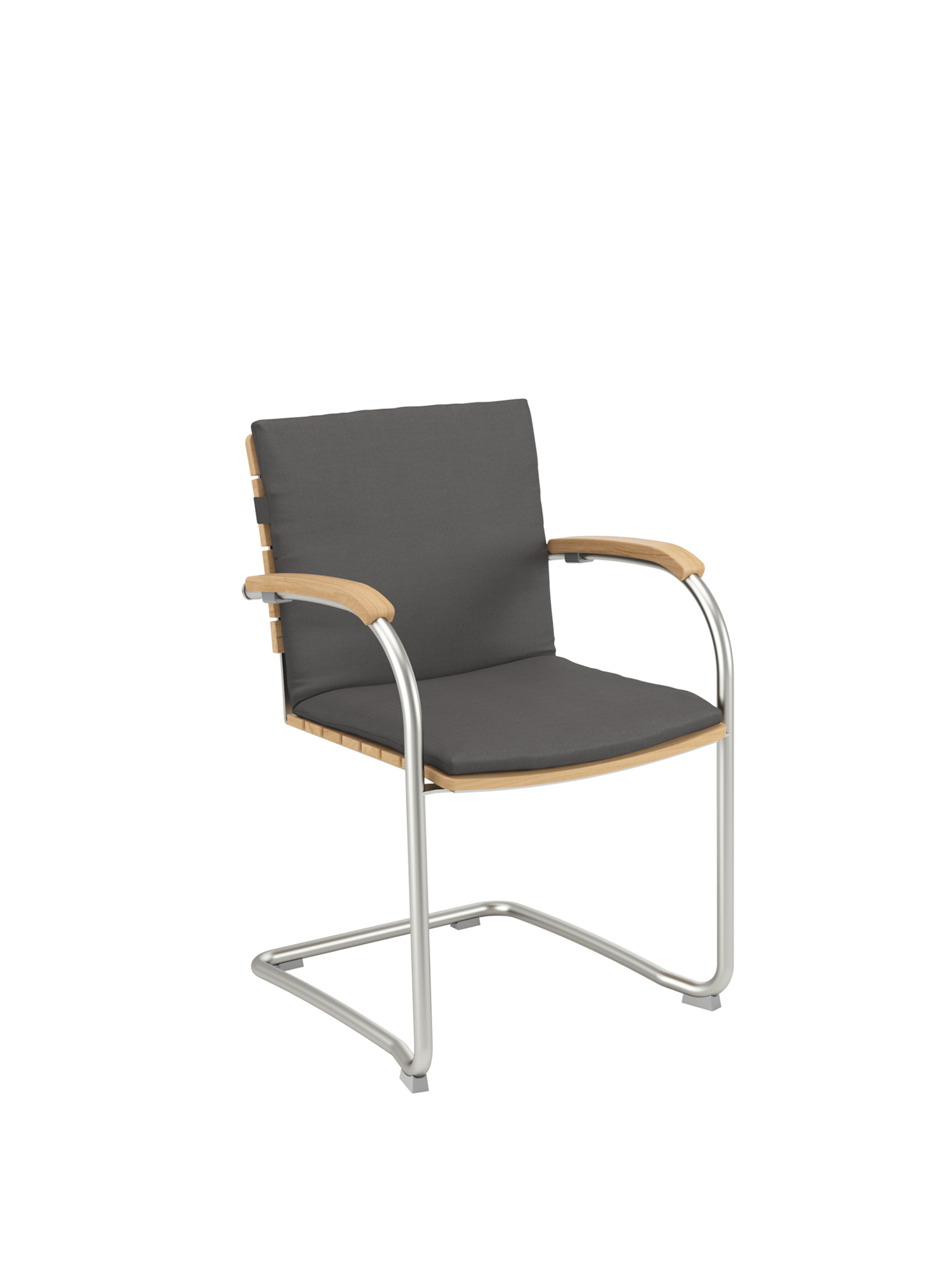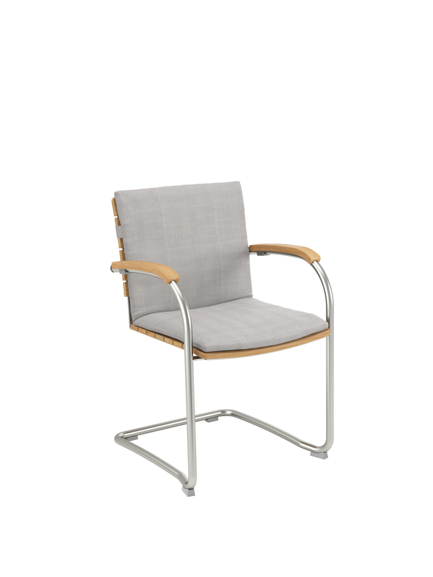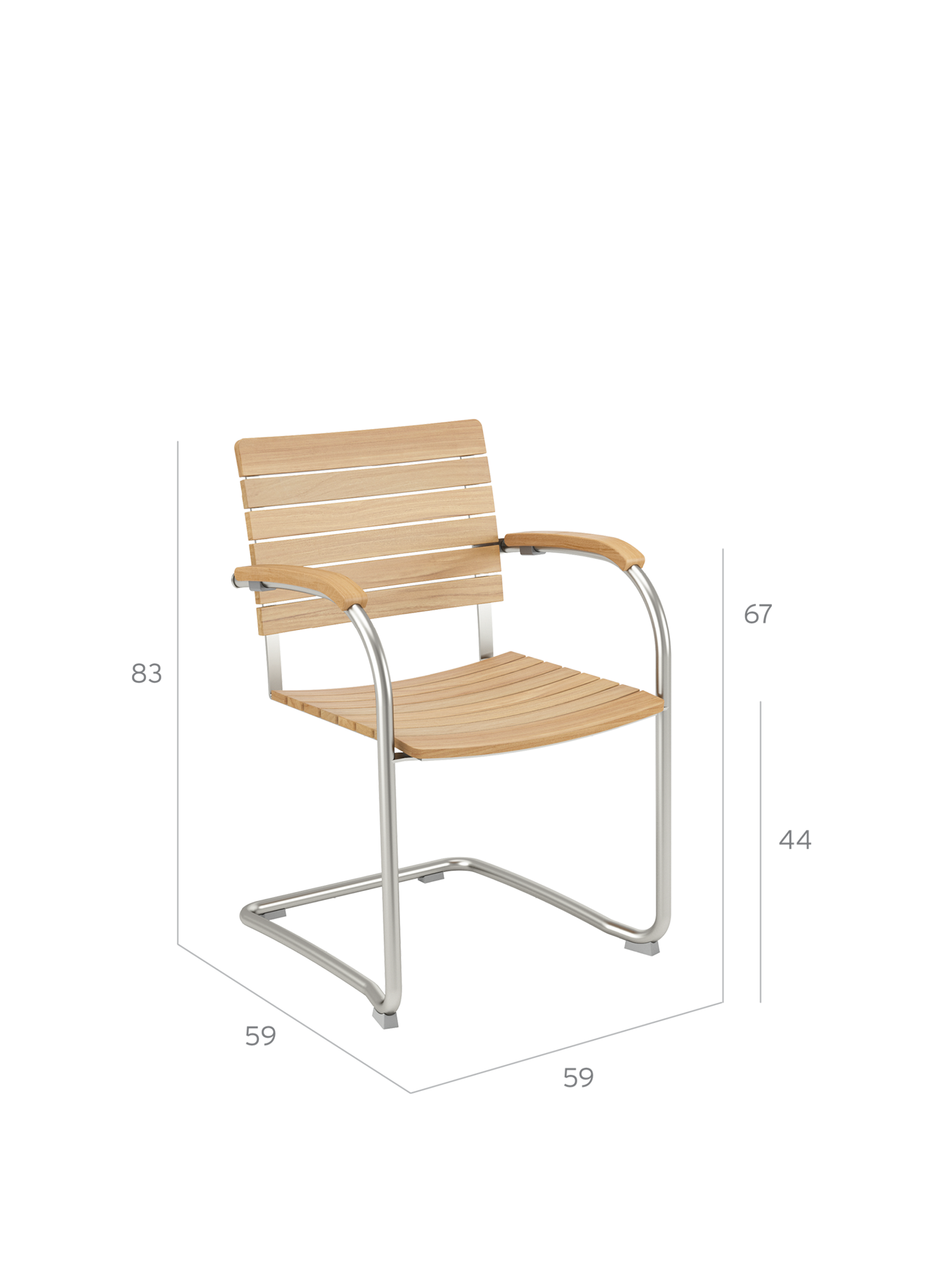 Die Sitz- und Rückenflächen aus Teak sind ergonomisch geformt und sorgen für besonderen Komfort. Das Rohrgestell aus satiniertem Edelstahl trotzt allen Wetterlaunen, die gewölbten Armlehnen aus Teak passen sich seinem Profil an und schmeicheln den Händen. Bolero Freischwinger beanspruchen wenig Platz, denn sie lassen sich, dank kleiner Stopper unter den Armlehnen, reibungslos stapeln. Bis zu vier Stühle passen übereinander.