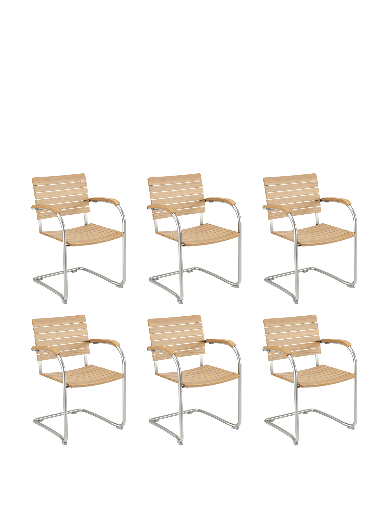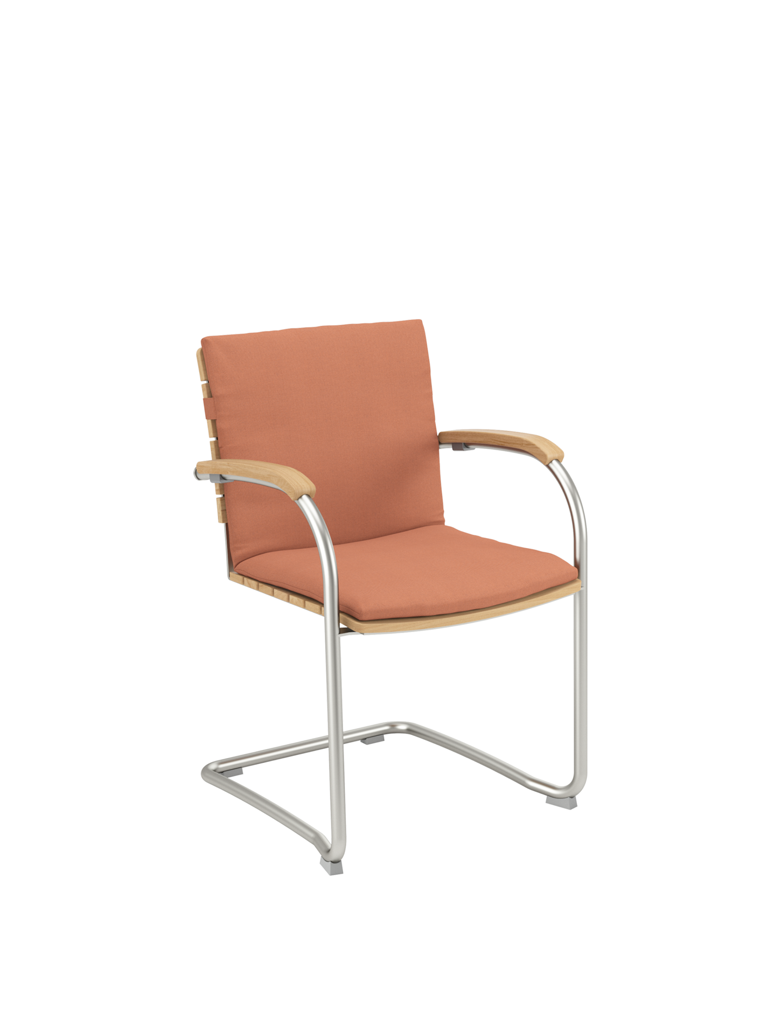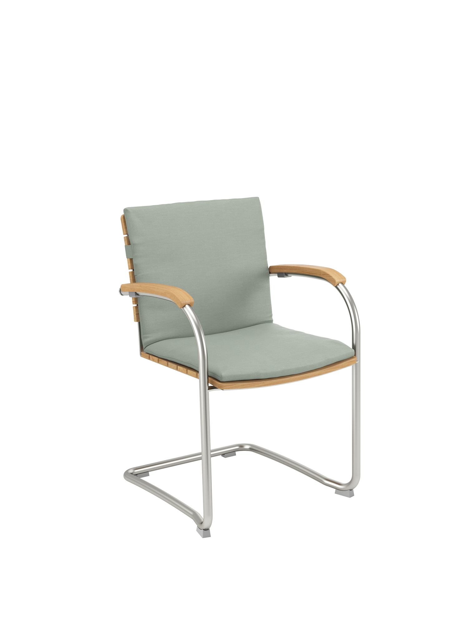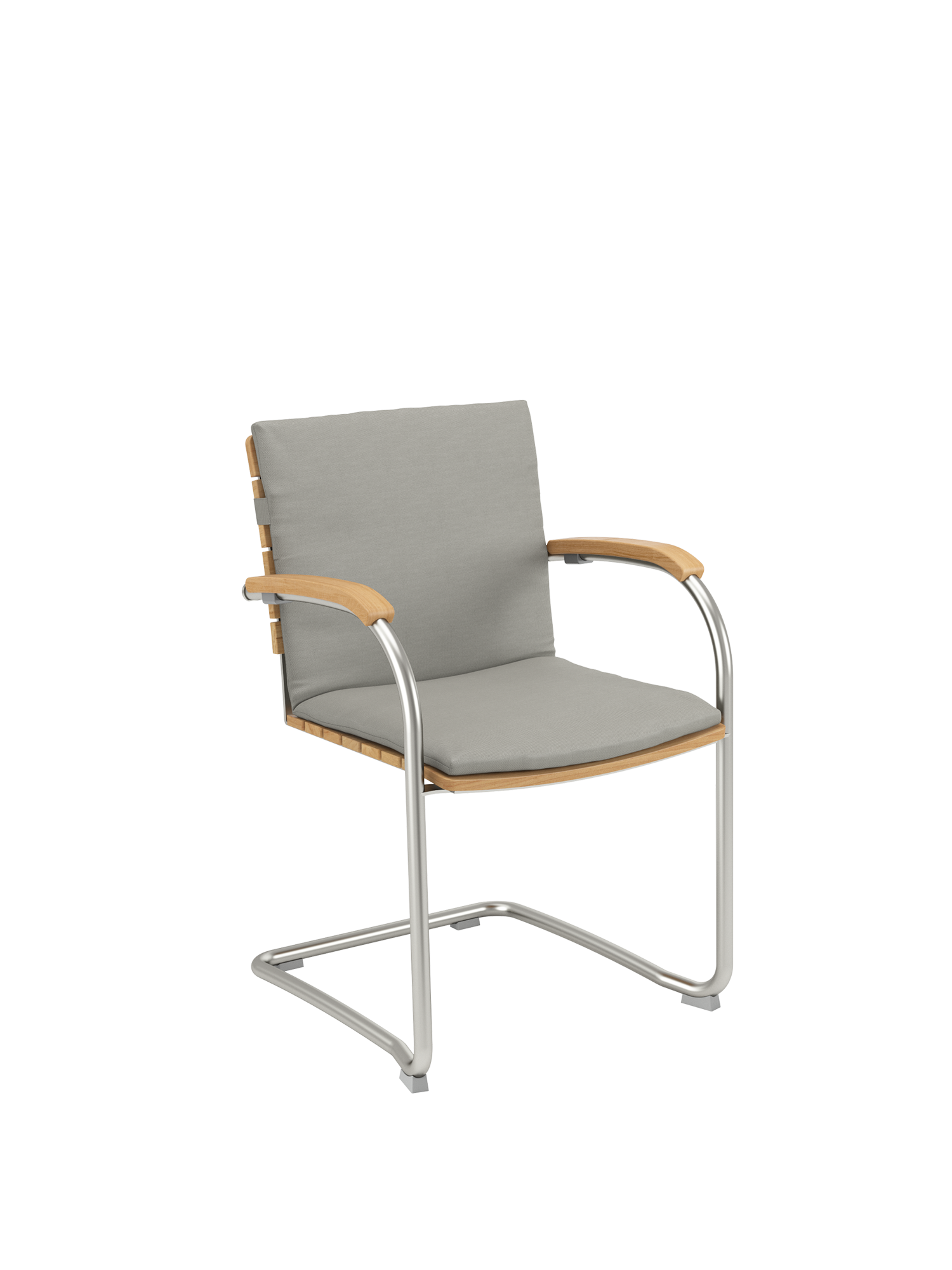 Die Sitz- und Rückenflächen aus Teak sind ergonomisch geformt und sorgen für besonderen Komfort. Das Rohrgestell aus satiniertem Edelstahl trotzt allen Wetterlaunen, die gewölbten Armlehnen aus Teak passen sich seinem Profil an und schmeicheln den Händen. Bolero Freischwinger beanspruchen wenig Platz, denn sie lassen sich, dank kleiner Stopper unter den Armlehnen, reibungslos stapeln. Bis zu vier Stühle passen übereinander.