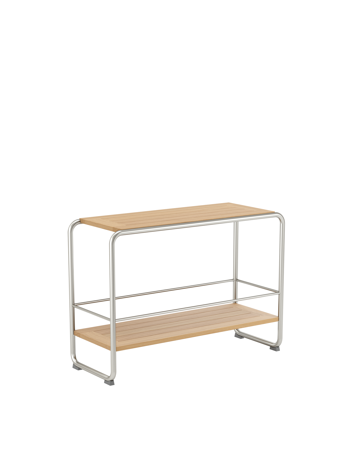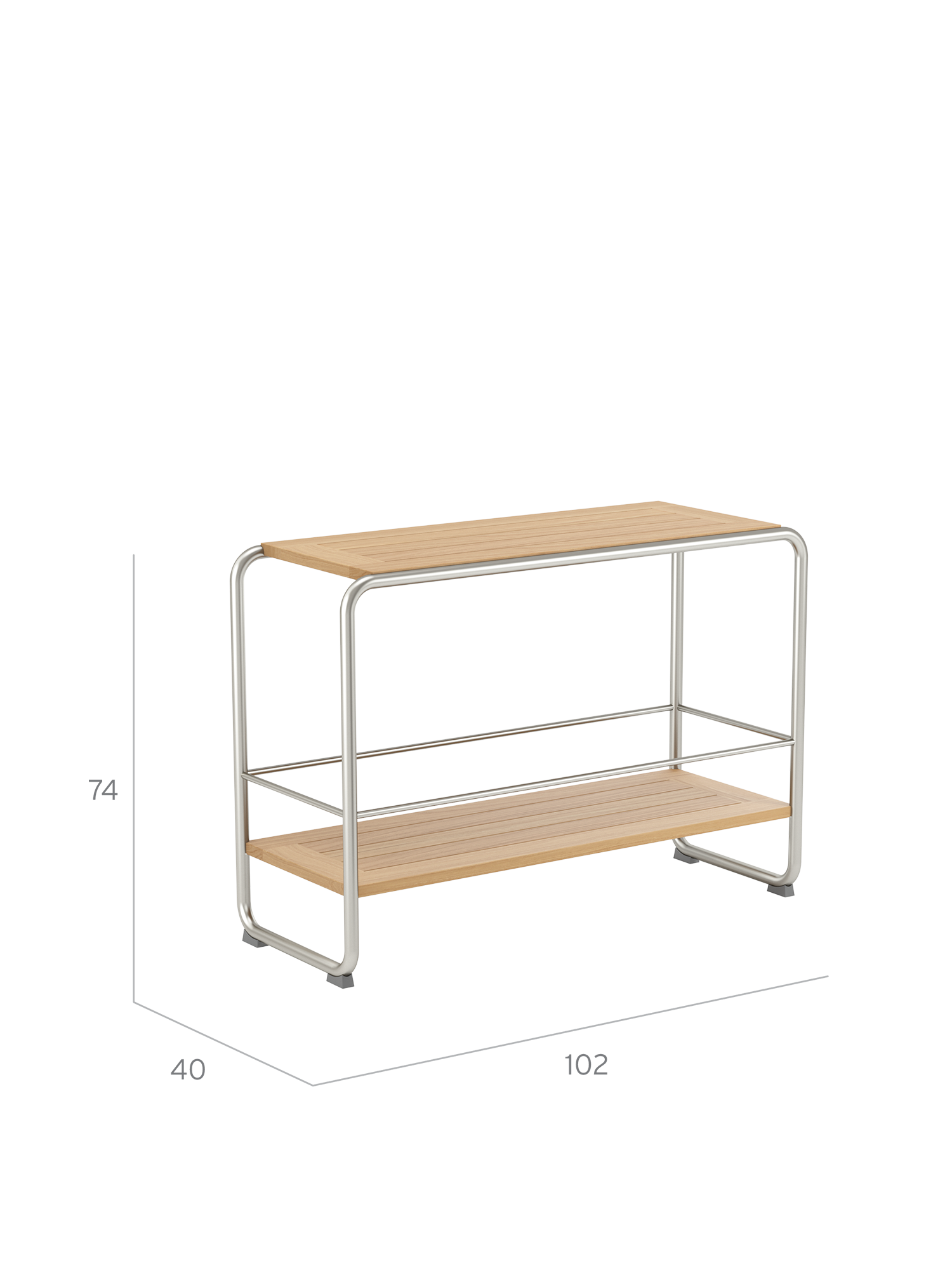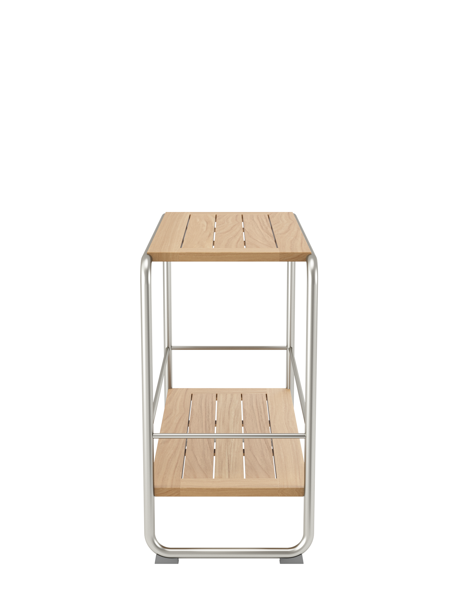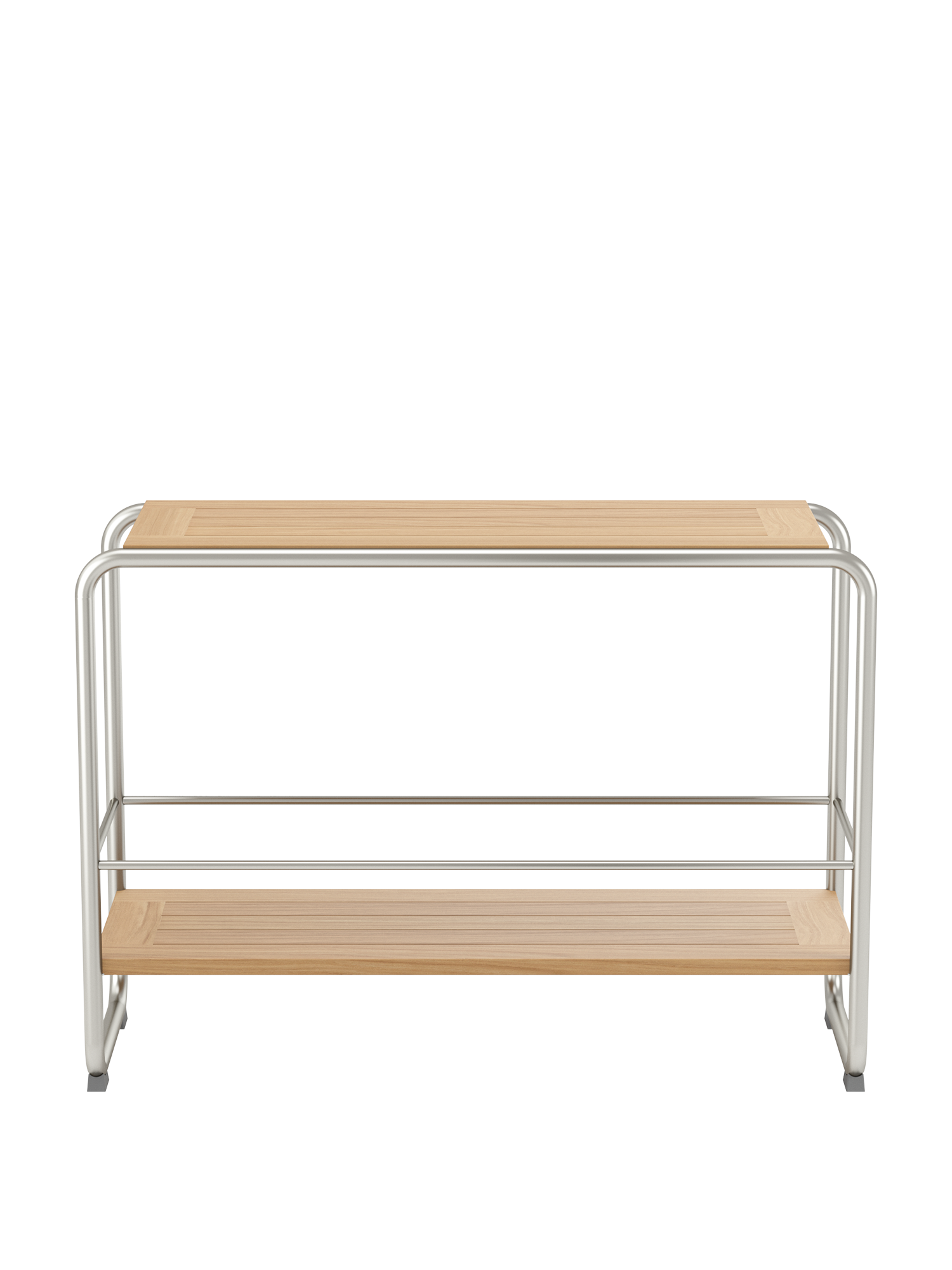 Der Stammbaum ist unverkennbar: Mit den Rundungen seines Rohrgestells aus satiniertem Edelstahl passt sich der Konsoltisch perfekt der Bauhaus-Ästhetik der Bolero Möbel an. Auf den beiden Ebenen aus Teakholz hält er Geschirr oder Getränke jederzeit griffbereit.