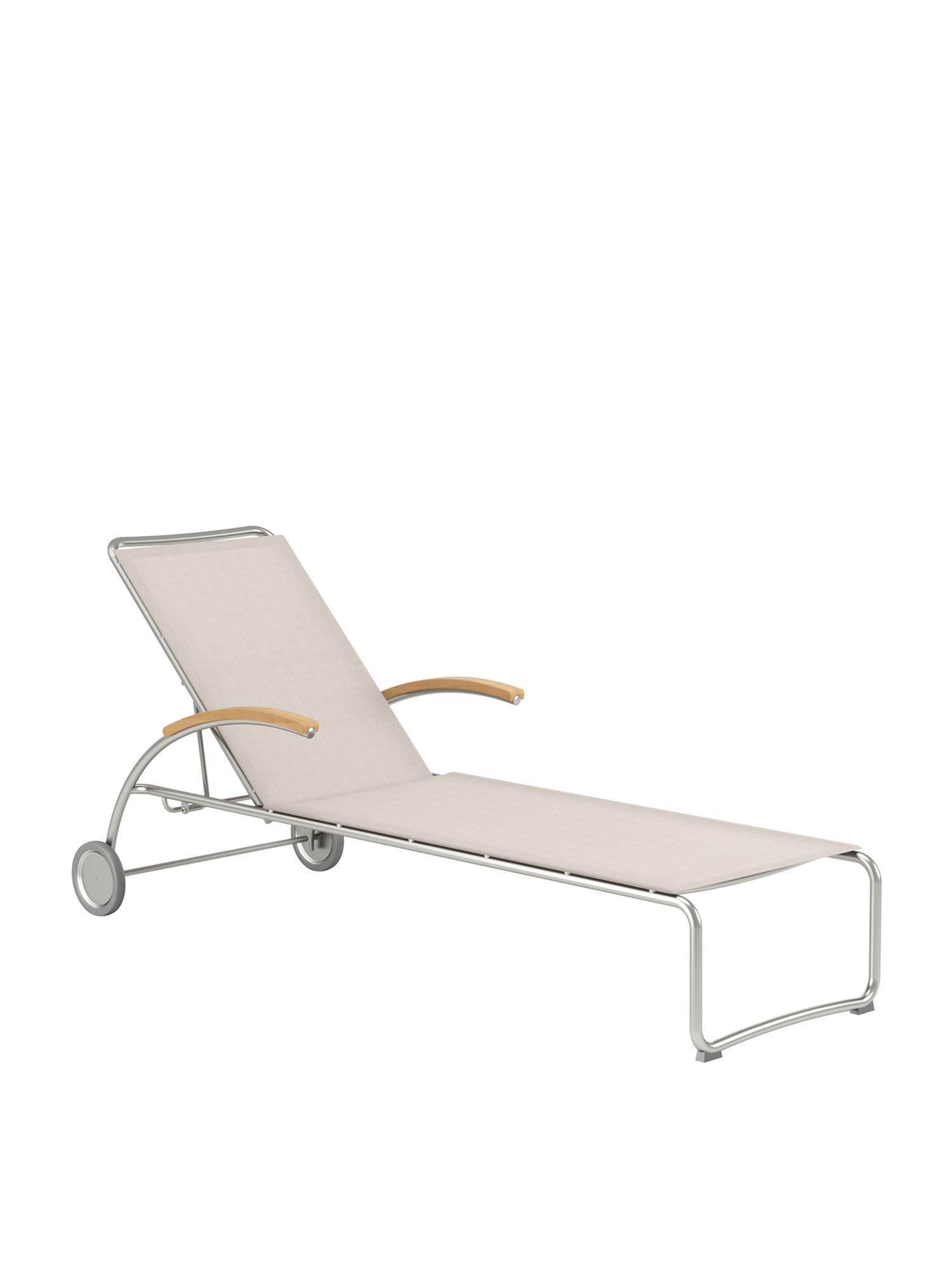 Die Rückenlehne lässt sich stufenweise von der Sitz- in die flache Liegeposition bewegen, die geschwungenen Armlehnen aus Teak passen sich harmonisch dem Edelstahlprofil an und sind eine Wohltat für die Arme. Dank ihrer Räder aus Gummi lässt sich die Liege leicht durch den Garten bewegen. Unter dem Gestell befinden sich auswechselbare Gleiter aus Kunststoff, die empfindliche Böden schützen.