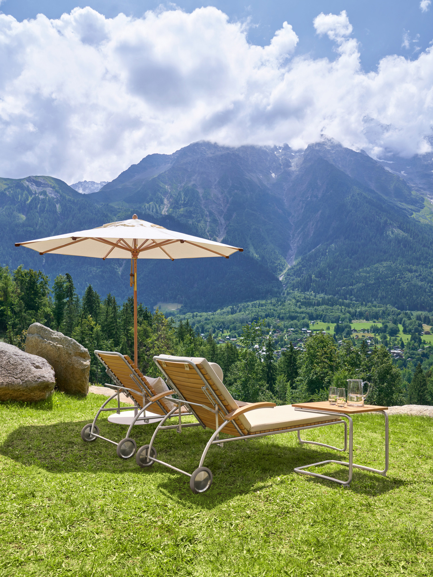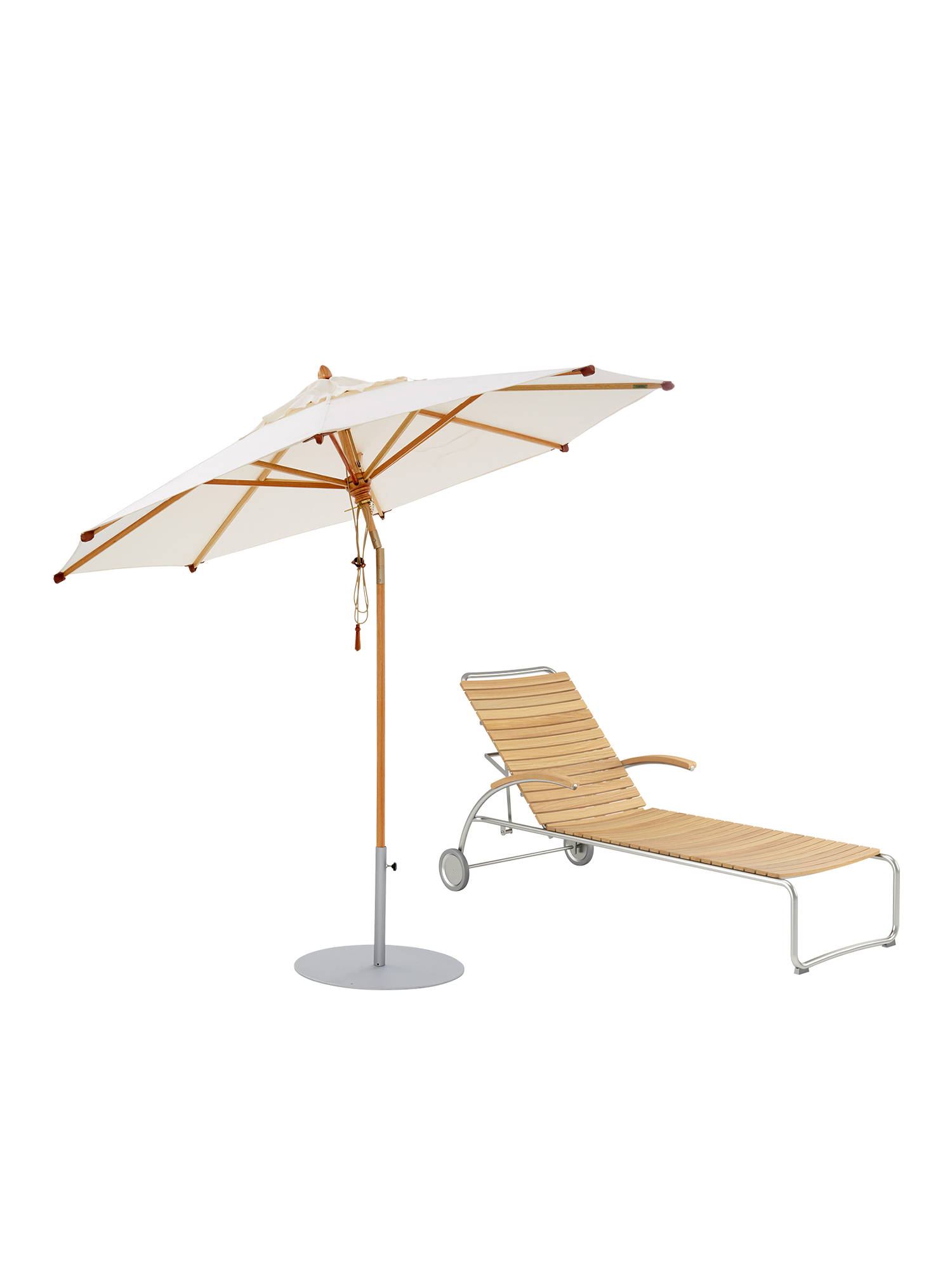 Die Bolero Liege hat eine ergonomisch geformte Liegefläche und eine fünffach verstellbare Rückenlehne. Dank der Räder folgt sie mühelos der Sonne. Auf Wunsch sorgt der Liguria Schirm mit flexiblem Knickgelenk für Schatten. Der passende Schirmständer ist Teil des Sets.