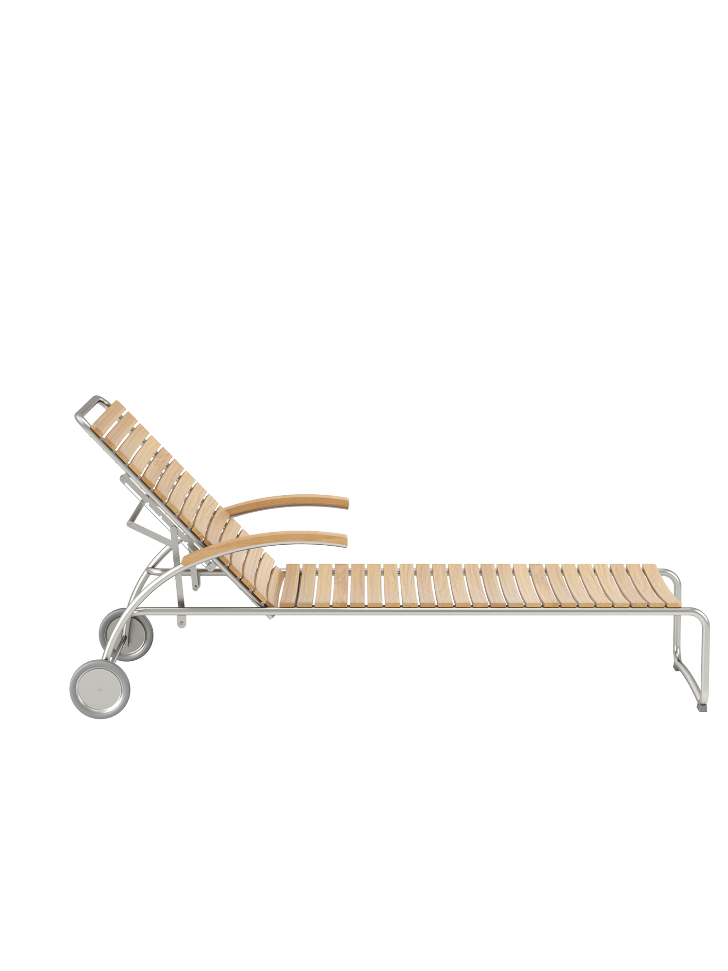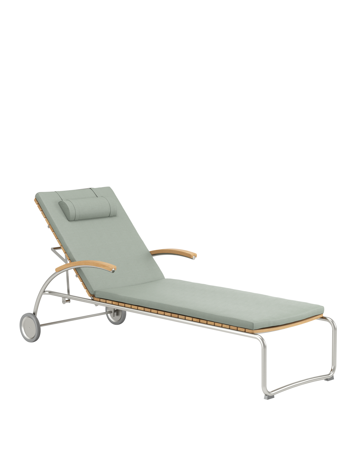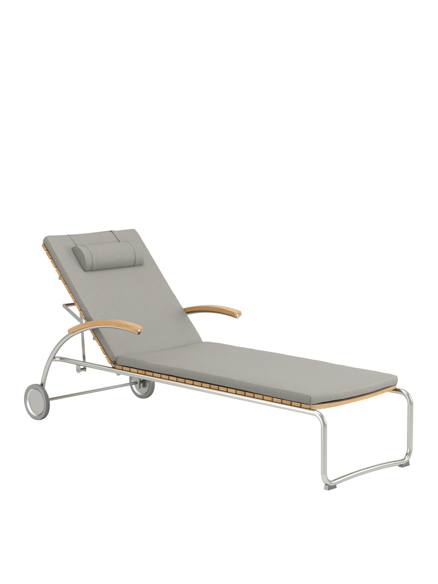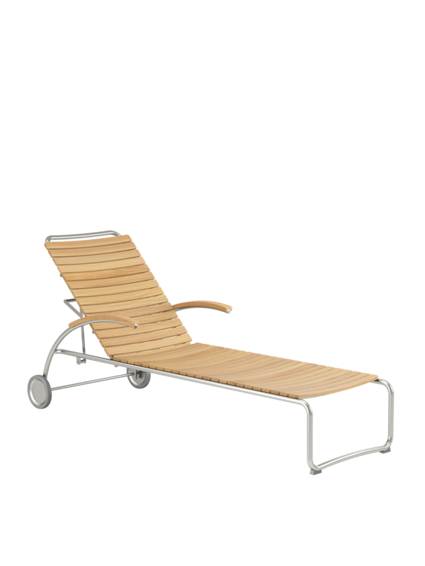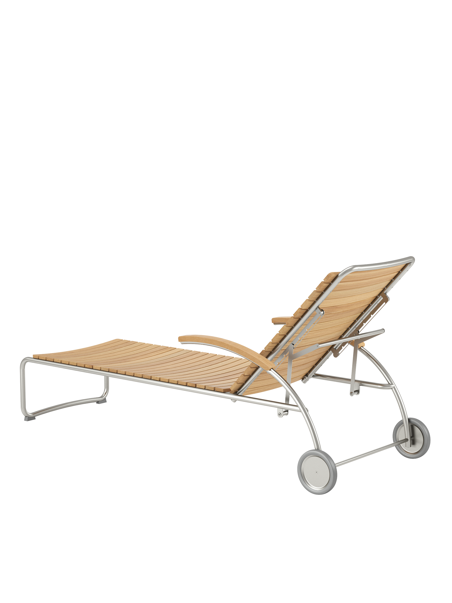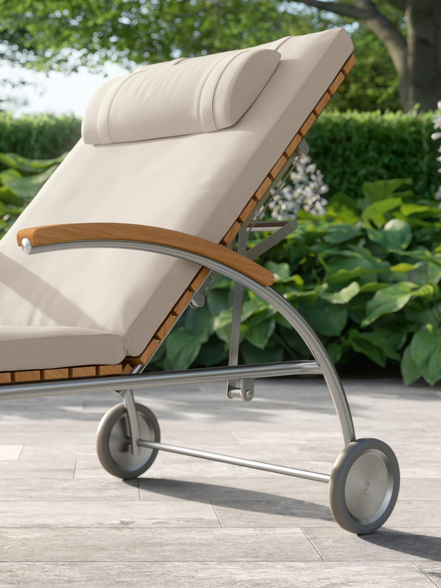 Die Rückenlehne lässt sich stufenweise von der Sitz- in die flache Liegeposition bewegen, die geschwungenen Armlehnen aus Teak passen sich harmonisch dem Edelstahlprofil an und sind eine Wohltat für die Arme. Dank ihrer Räder aus Gummi lässt sich die Liege leicht durch den Garten bewegen. Unter dem Gestell befinden sich auswechselbare Gleiter aus Kunststoff, die empfindliche Böden schützen.