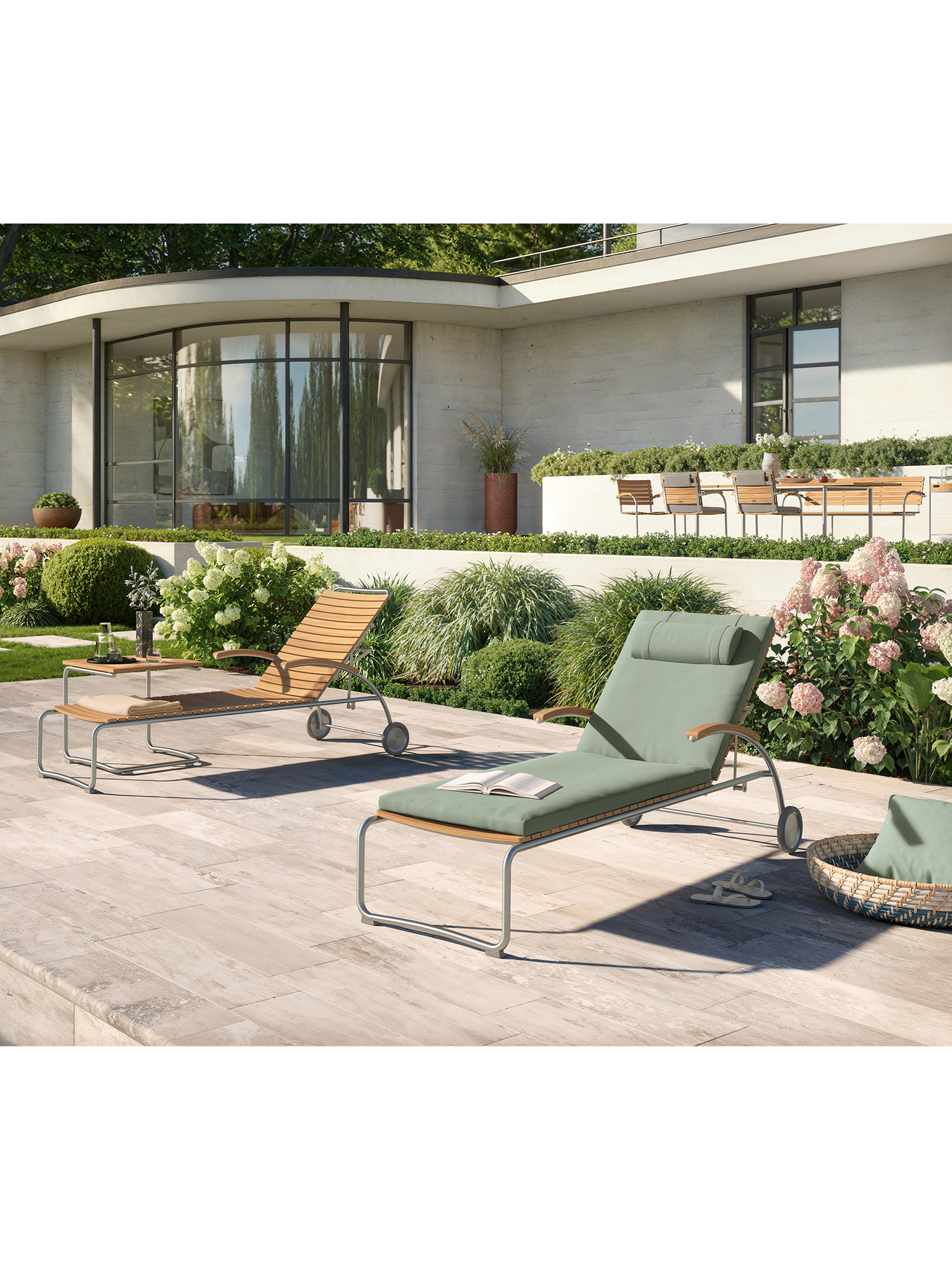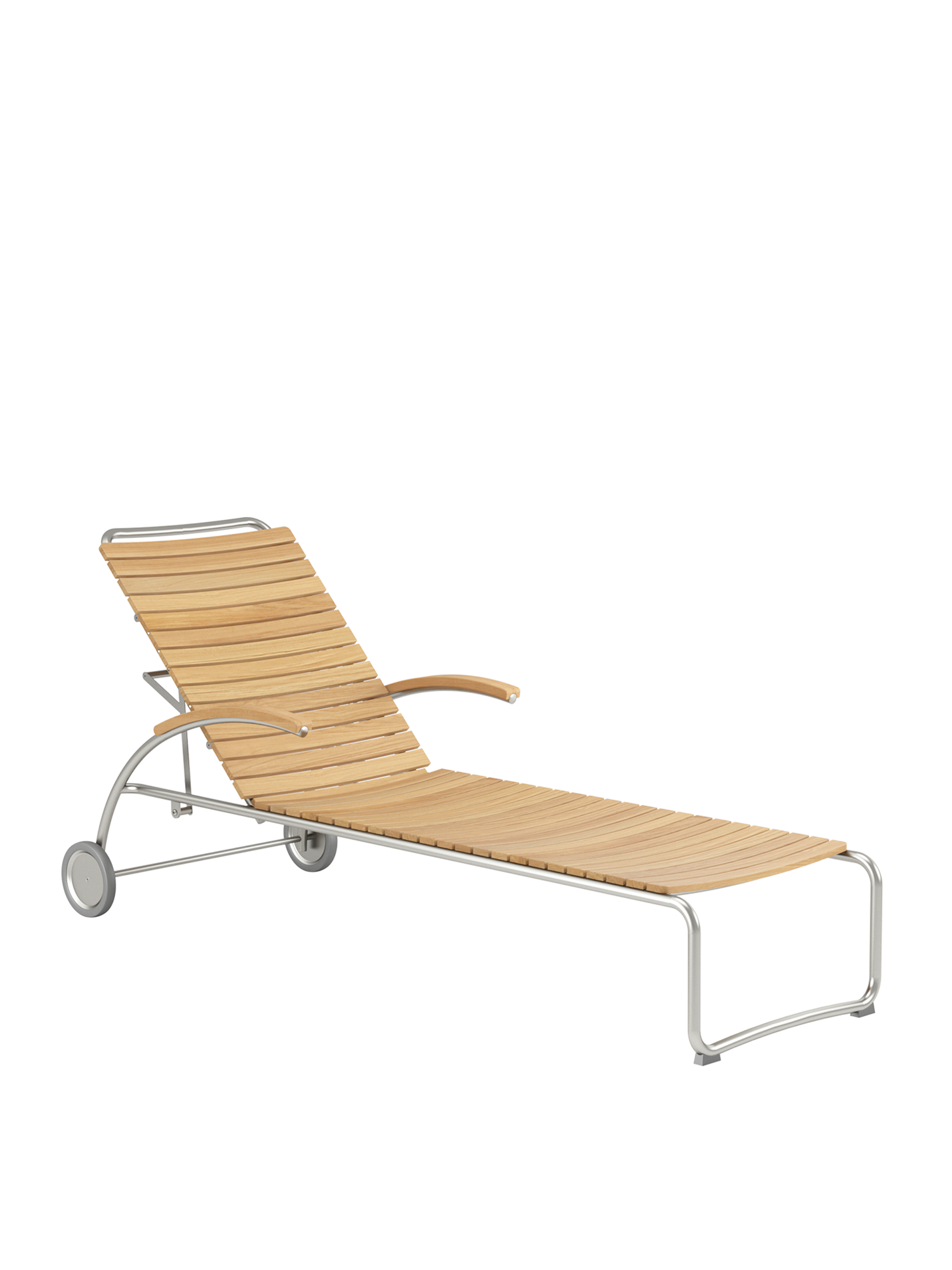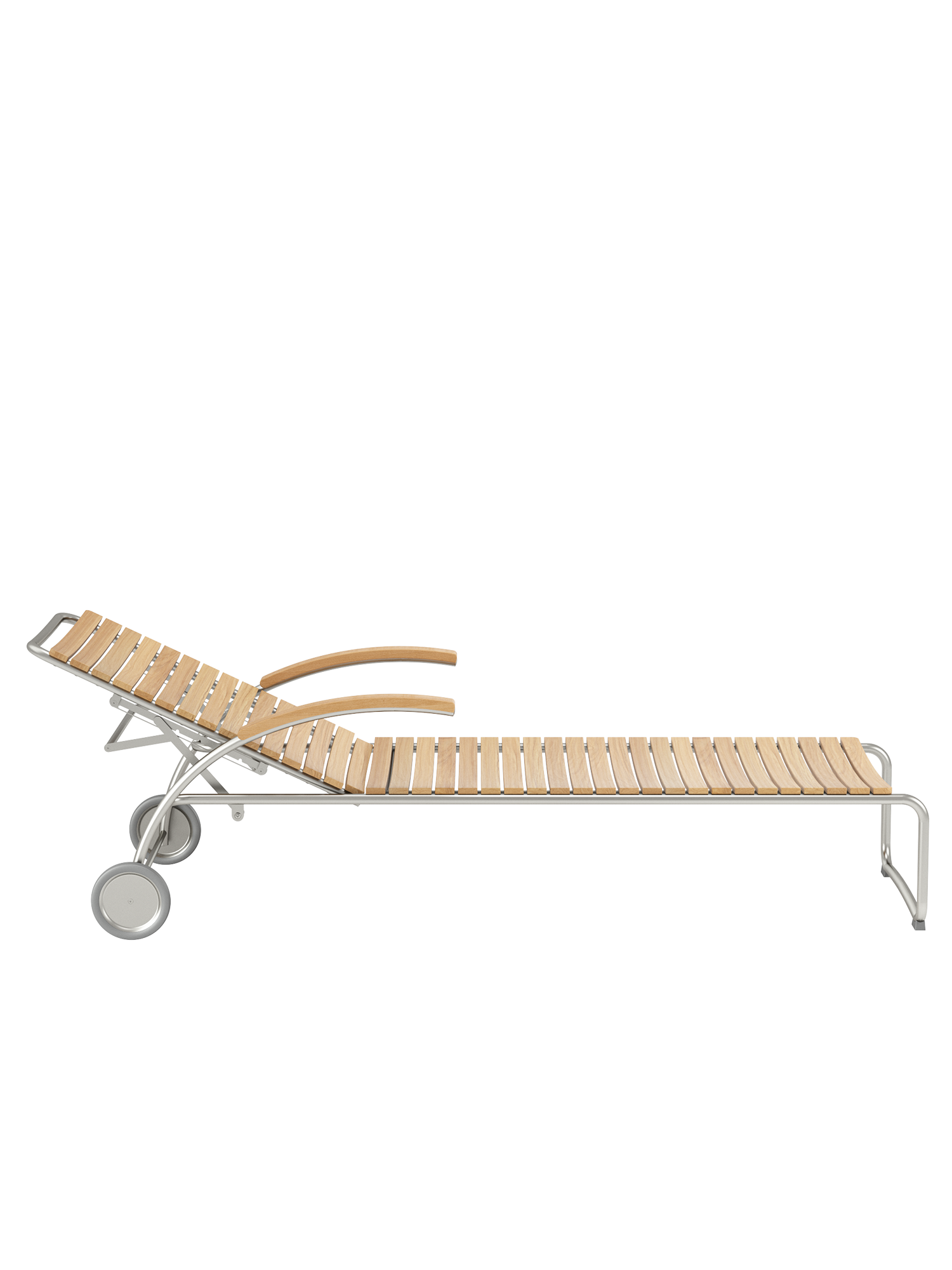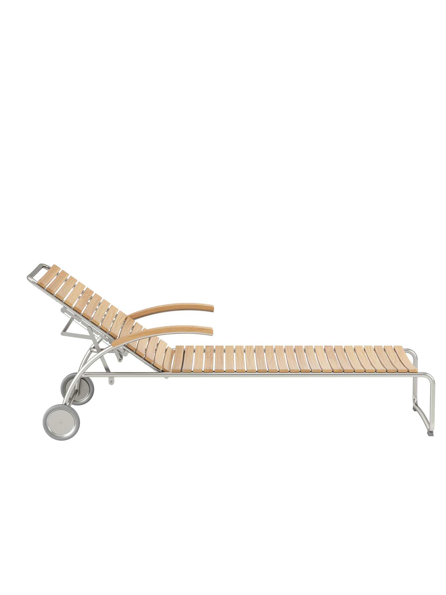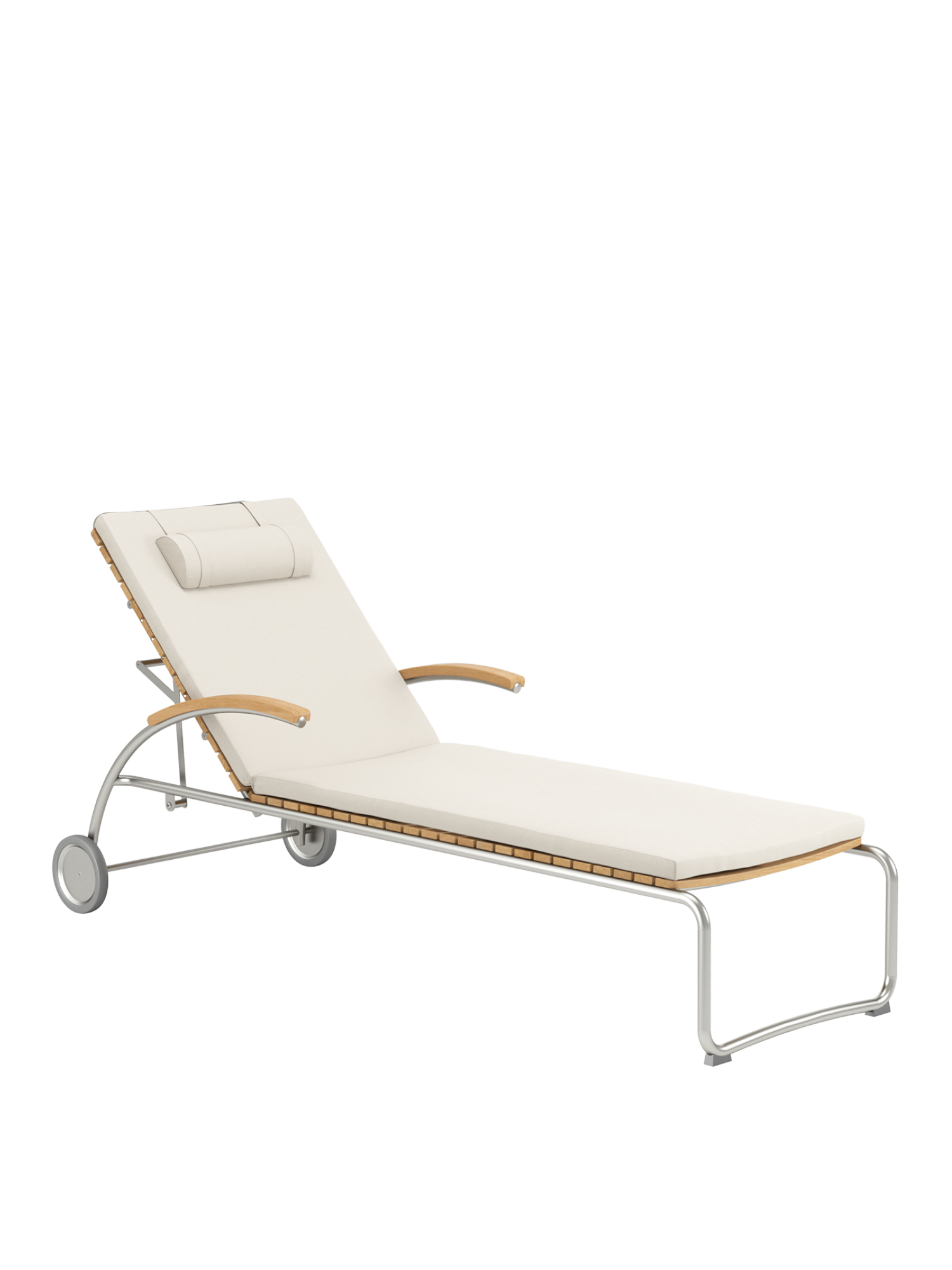 Die Rückenlehne lässt sich stufenweise von der Sitz- in die flache Liegeposition bewegen, die geschwungenen Armlehnen aus Teak passen sich harmonisch dem Edelstahlprofil an und sind eine Wohltat für die Arme. Dank ihrer Räder aus Gummi lässt sich die Liege leicht durch den Garten bewegen. Unter dem Gestell befinden sich auswechselbare Gleiter aus Kunststoff, die empfindliche Böden schützen.