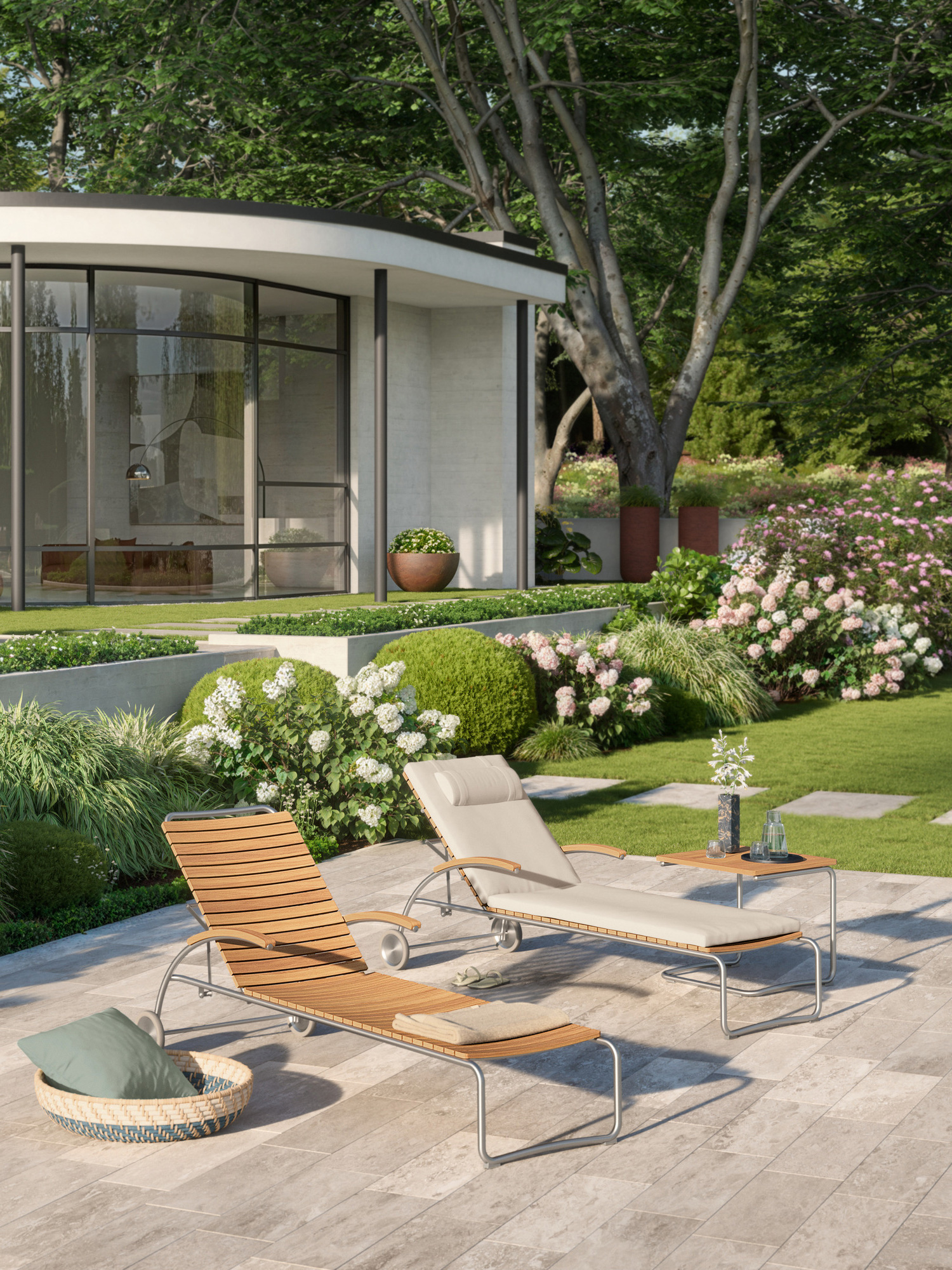 In den vom Bauhaus inspirierten Möbeln der Serie Bolero ergänzen sich edles Metall und warmes Teakholz in idealer Weise. Die großzügig bemessene Liegefläche aus Teak ist ergonomisch geformt und sorgt mit ihren eng gestellten Leisten für besondere Bequemlichkeit. Das Rohrgestell aus satiniertem Edelstahl trotzt allen Wetterlaunen. Auflagen in verschiedenen Farbtönen erhöhen noch die Bequemlichkeit der Möbel und setzen feine Akzente.