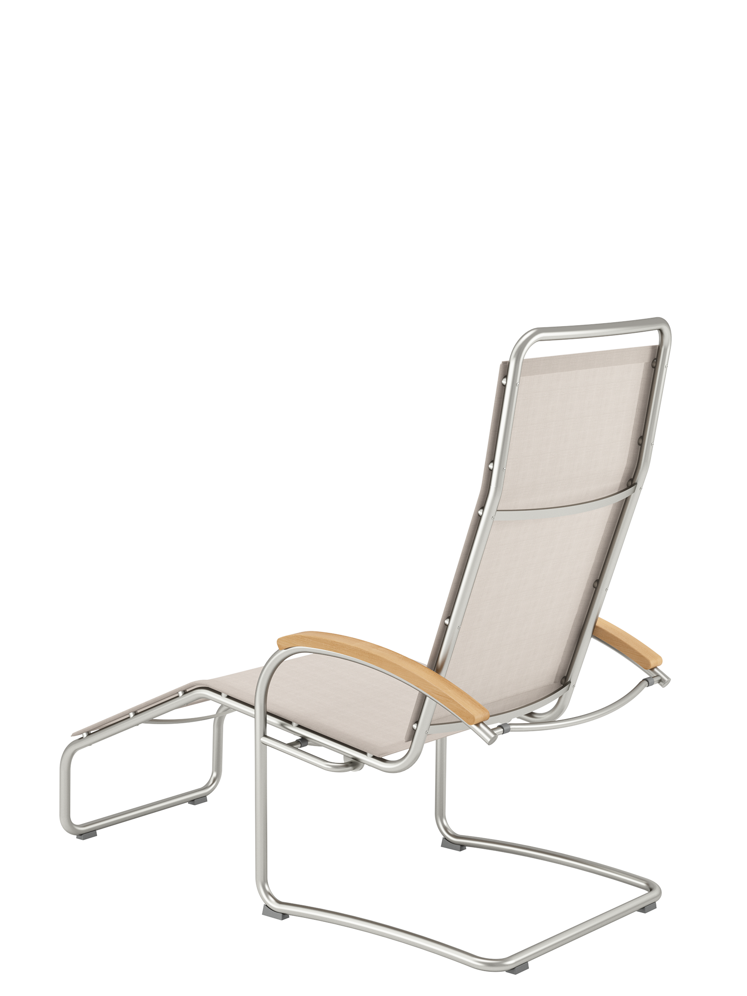 In dem vom Bauhaus inspirierten Liegesessel ergänzen sich edles Metall und ein hochwertiges Polymergewebe in idealer Weise. Das Gewebe zeichnet sich durch eine angenehm natürliche, textile Haptik aus. Anschmiegsam und straff zugleich empfiehlt es sich mit oder ohne Polster für unbeschwertes Sitzen und Liegen. Der natürliche Farbton, eine Melange zwischen zartem Braun und hellem Beige, unterstreicht die Eleganz des Möbels. Das Rohrgestell aus satiniertem Edelstahl trotzt allen Wetterlaunen, die gewölbten Armlehnen aus Teak passen sich seinem Profil an und schmeicheln den Händen. Auflagen in verschiedenen Farbtönen erhöhen noch die Bequemlichkeit der Möbel und setzen feine Akzente.