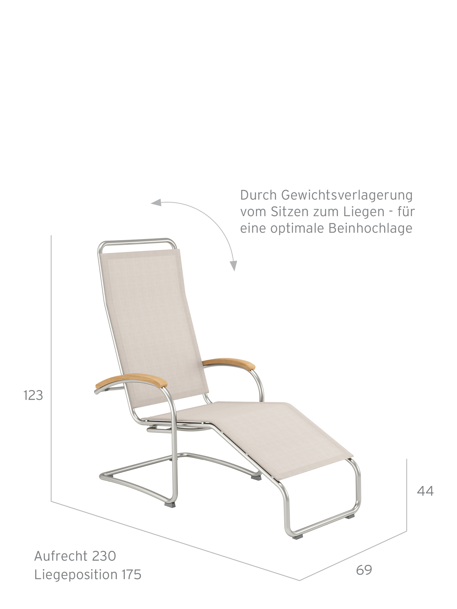 Aufrecht sitzen oder bequem zurücklehnen: Das leichte, wiegende Federn des Edelstahlgestells des Liegesessels entlastet den Rücken und wirkt sehr entspannend. Durch einfache Gewichtsverlagerung gleitet man sanft von der Sitz- in die Liegeposition. Unter dem Gestell befinden sich auswechselbare Gleiter aus Kunststoff, die empfindliche Böden schützen.