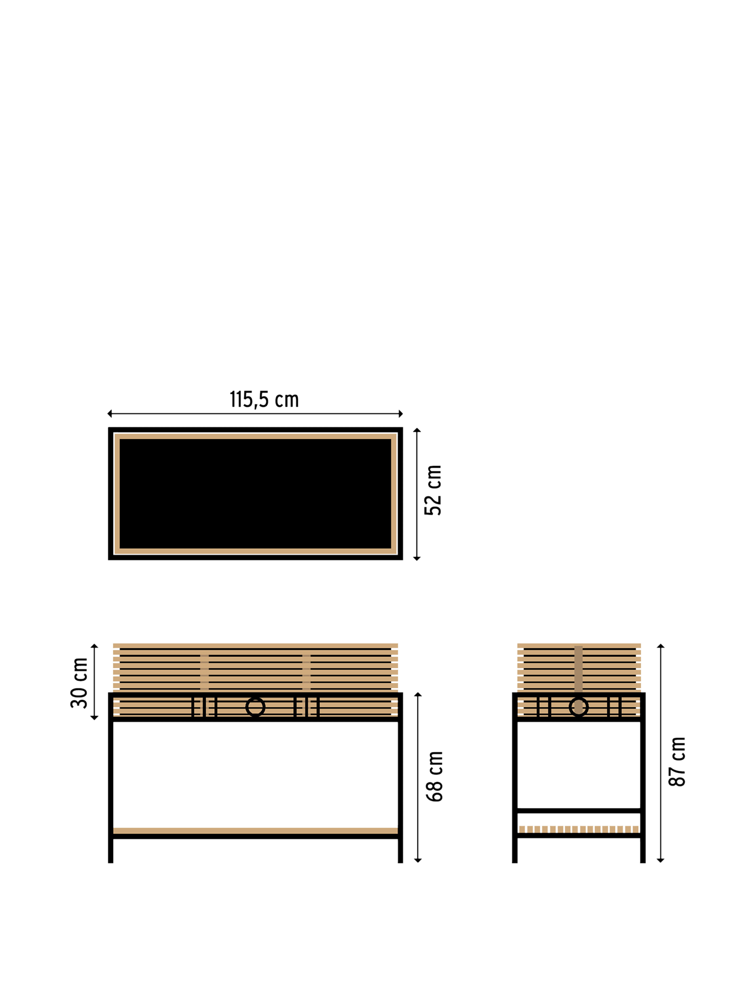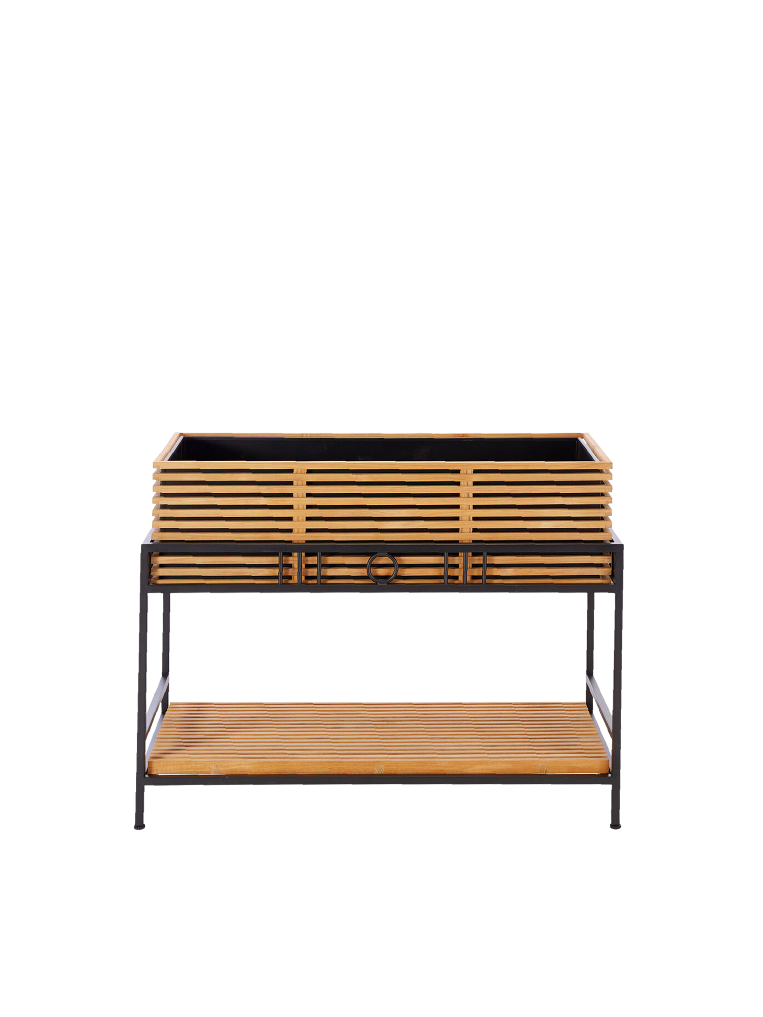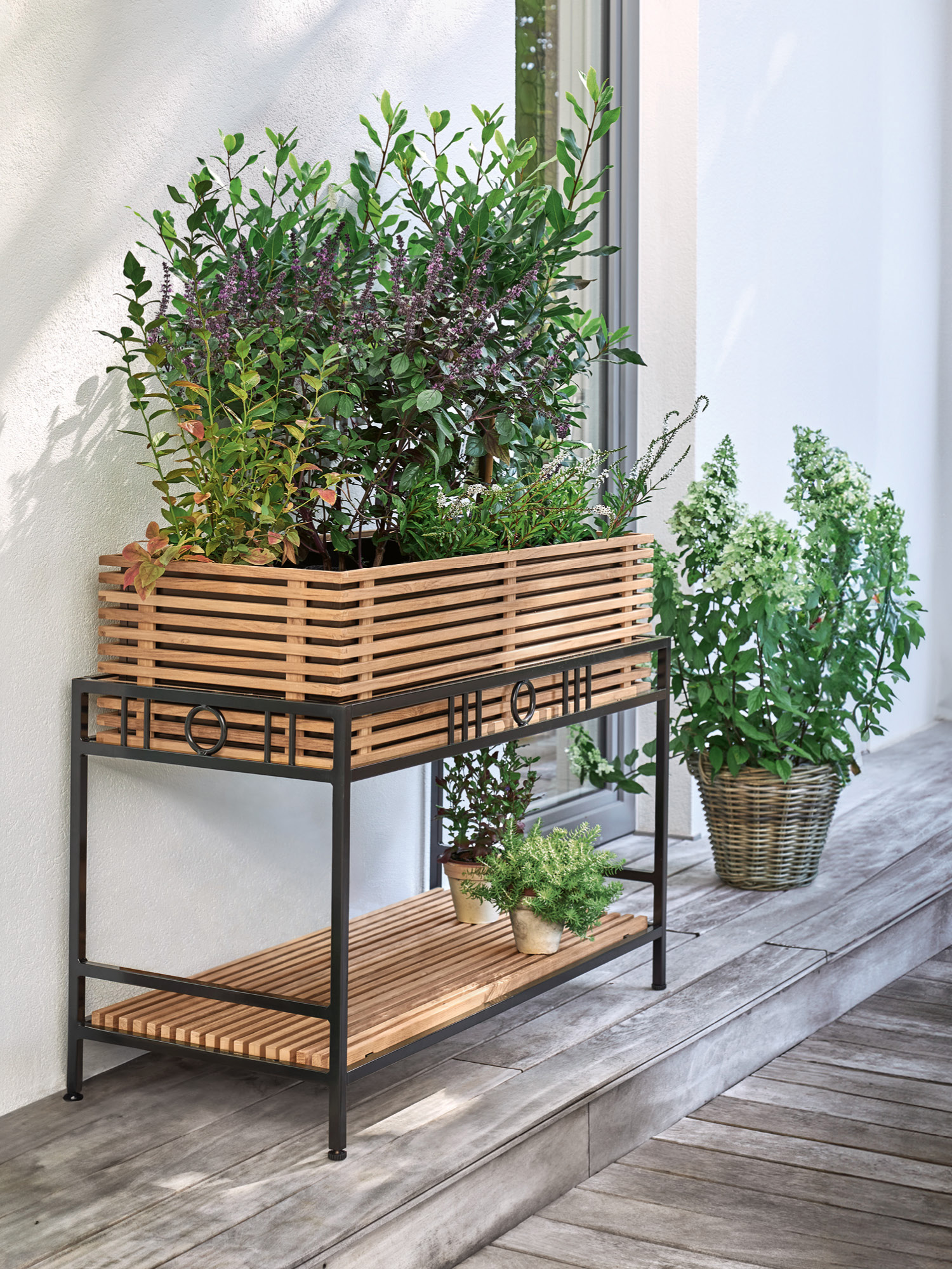 Der Pflanzkasten des Bretagne Hochbeets aus schwarz pulverbeschichtetem Aluminium bietet beste Wachstumsbedingungen. Seine Verkleidung besteht, genau wie der praktische Regalboden eine Etage tiefer, aus massiven Teakleisten. Ein im Gestell verborgener Auslauf leitet überschüssiges Wasser zur Erde.