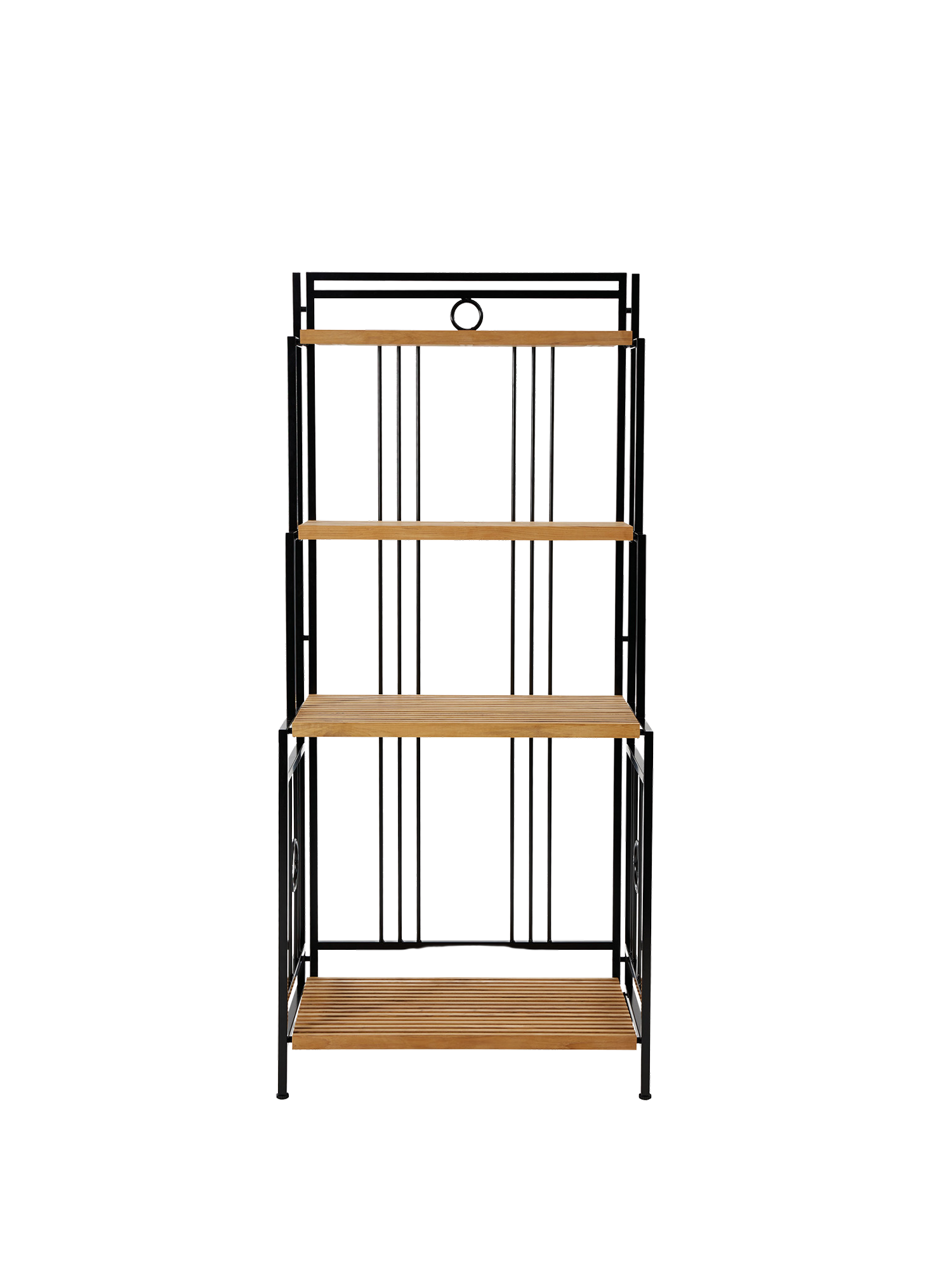 Das filigran anmutende Regal ist bewundernde Blicke gewöhnt. Es macht als Solitär eine charmante Figur, gibt sich dank seiner moderaten Breite aber auch mit weniger Platz zufrieden. Massive Teakleisten und ein Gestell aus schwarz pulverbeschichtetem Aluminium vereinen sich zu einem vielseitig nutzbaren Möbel. Die tiefen Böden in den beiden unteren Etagen bieten besonders viel praktischen Stauraum. Höhenversteller gleichen Unebenheiten im Boden aus.