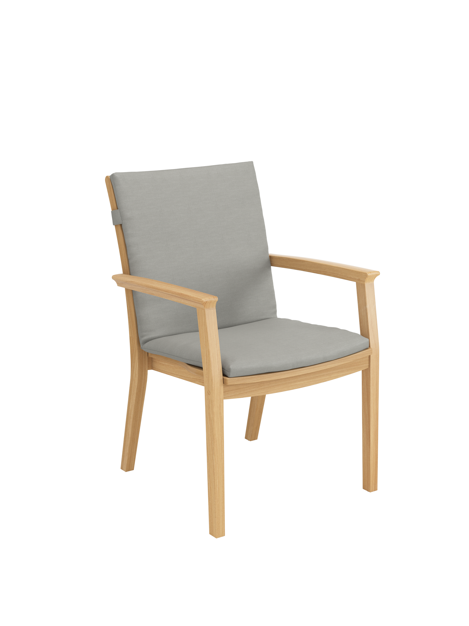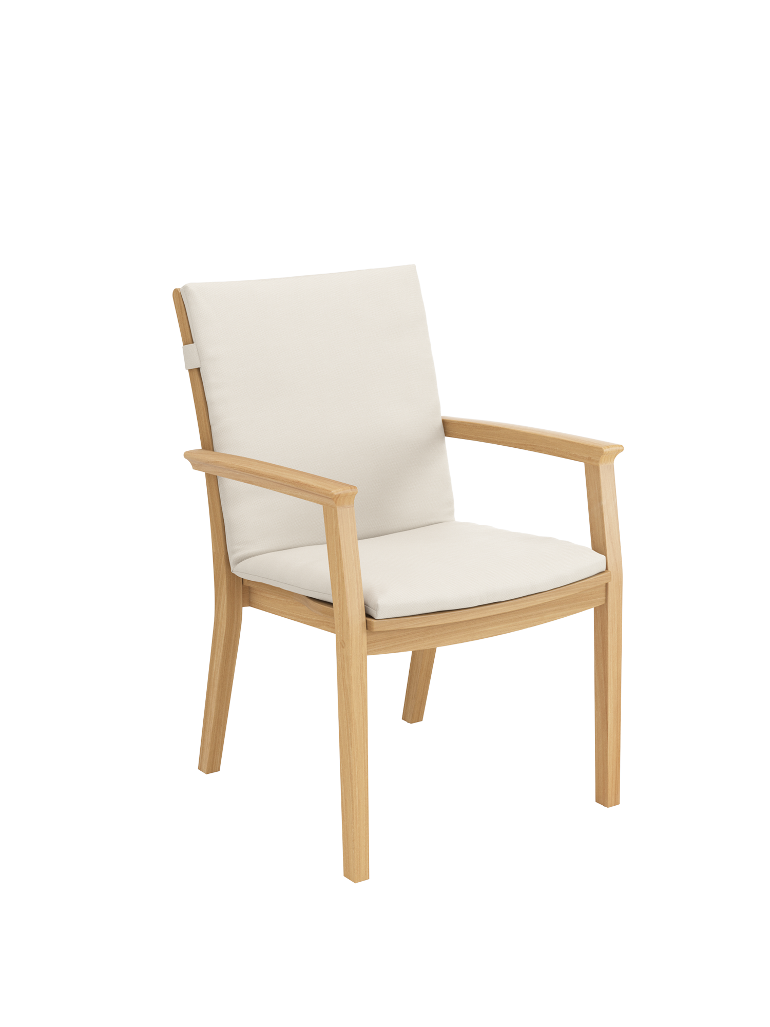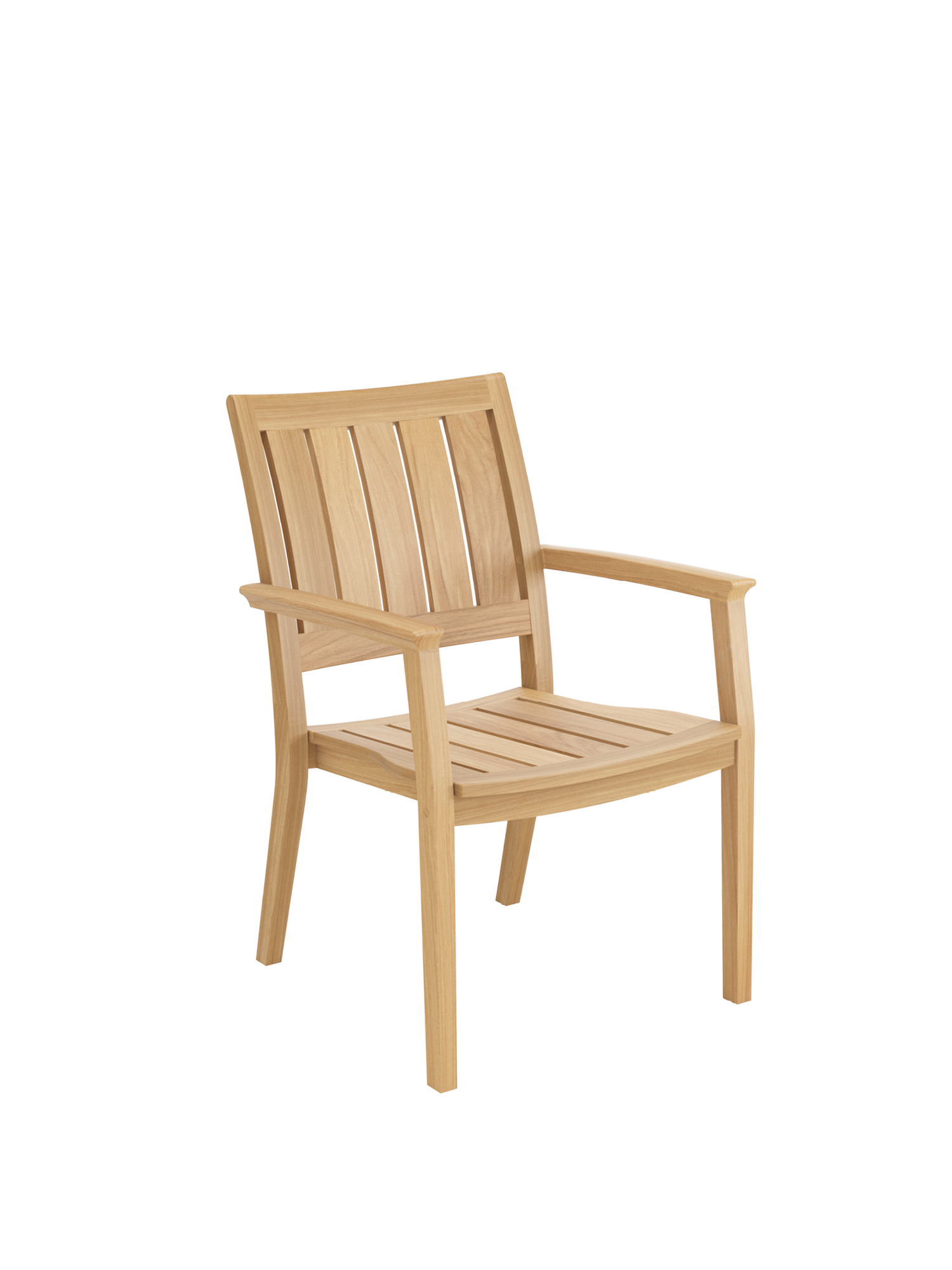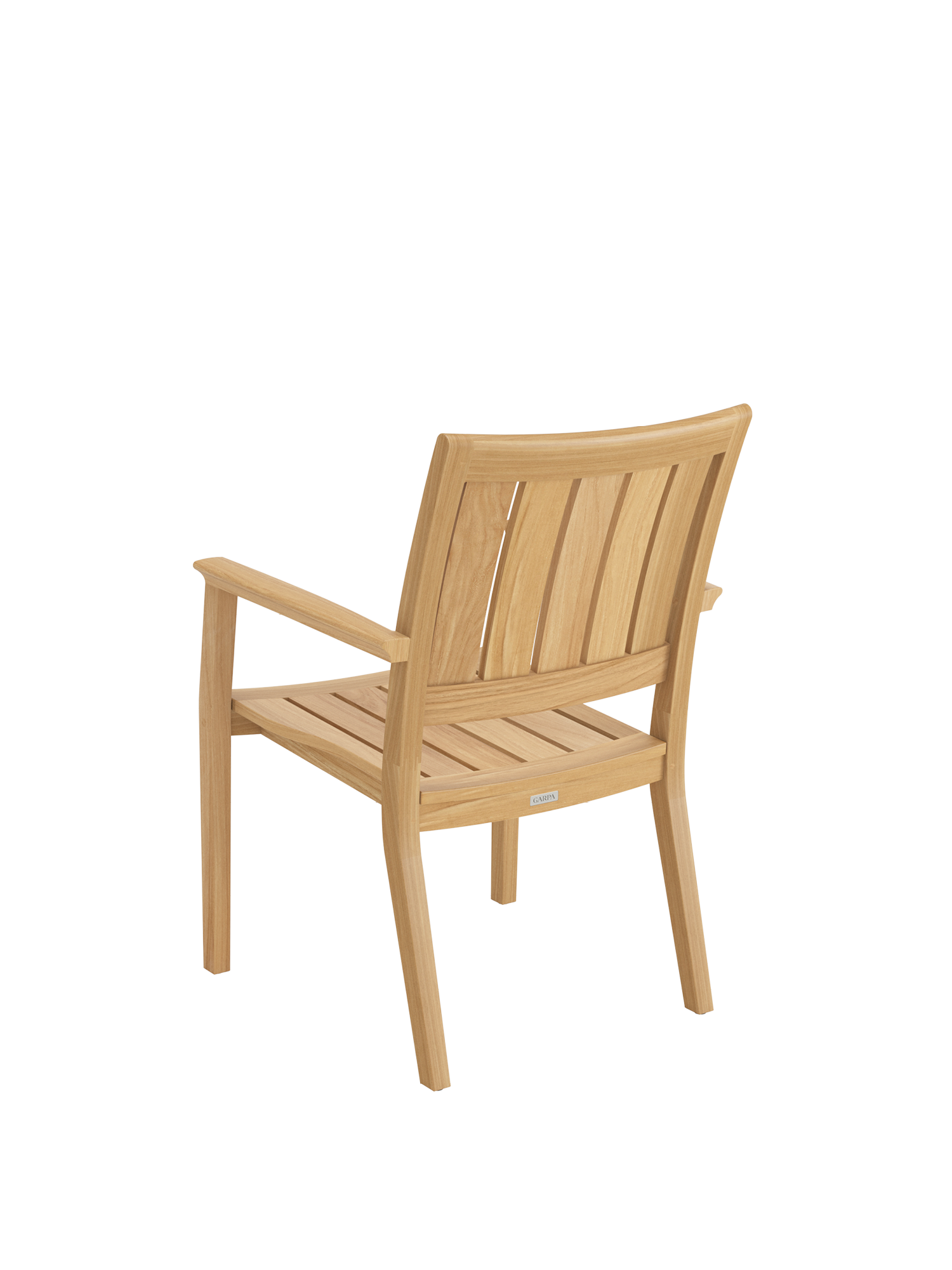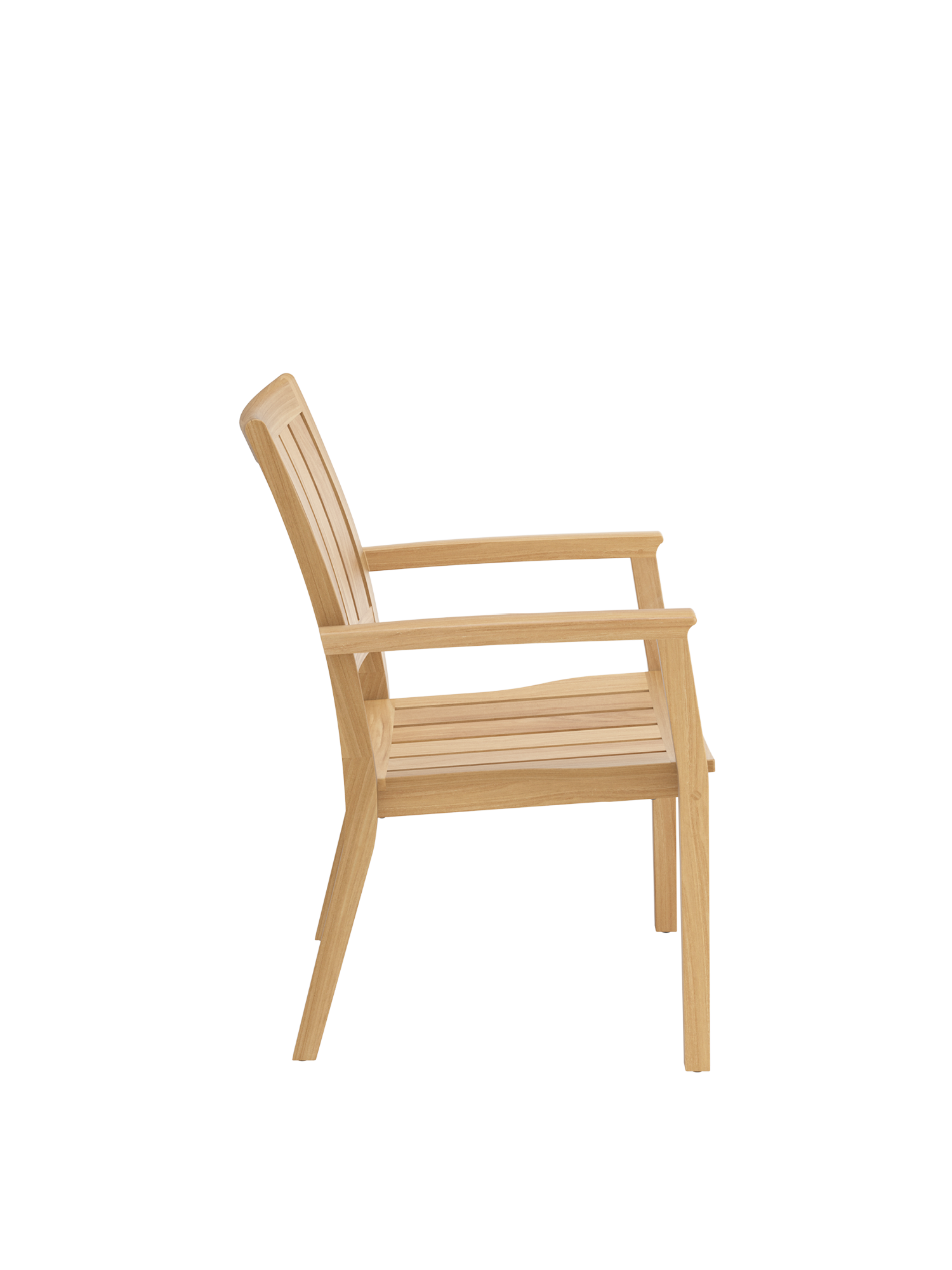 Die besondere Silhouette des stapelbaren Brighton Armlehnstuhls kommt insbesondere im Bereich der Sitzfläche zur Geltung. Die seitlichen Teakleisten verjüngen sich nach hinten und sorgen im Zusammenspiel mit der Rückenlehne für ergonomischen Komfort.