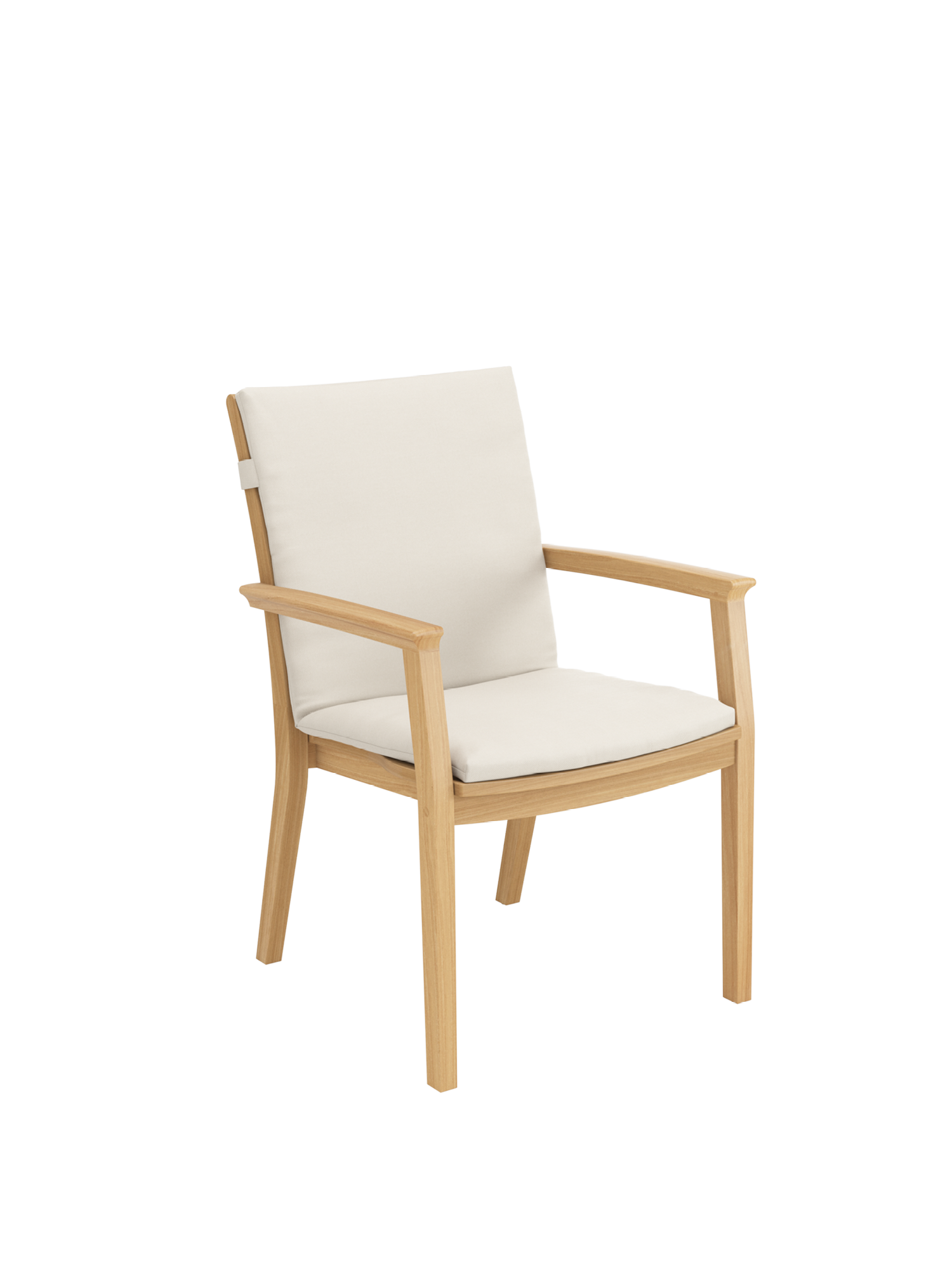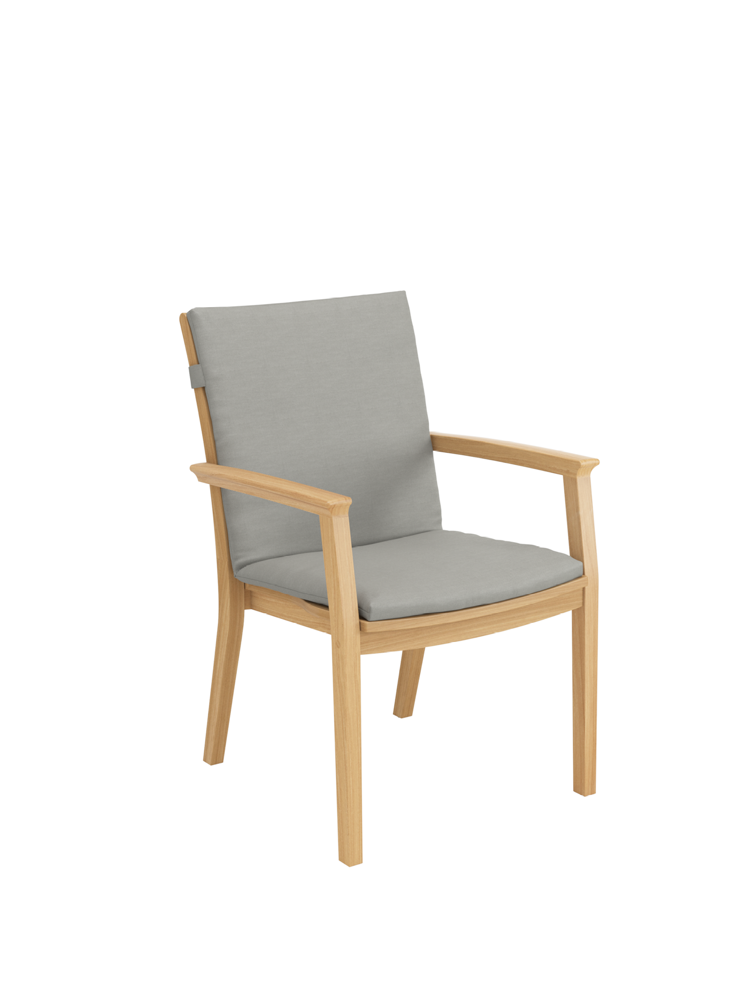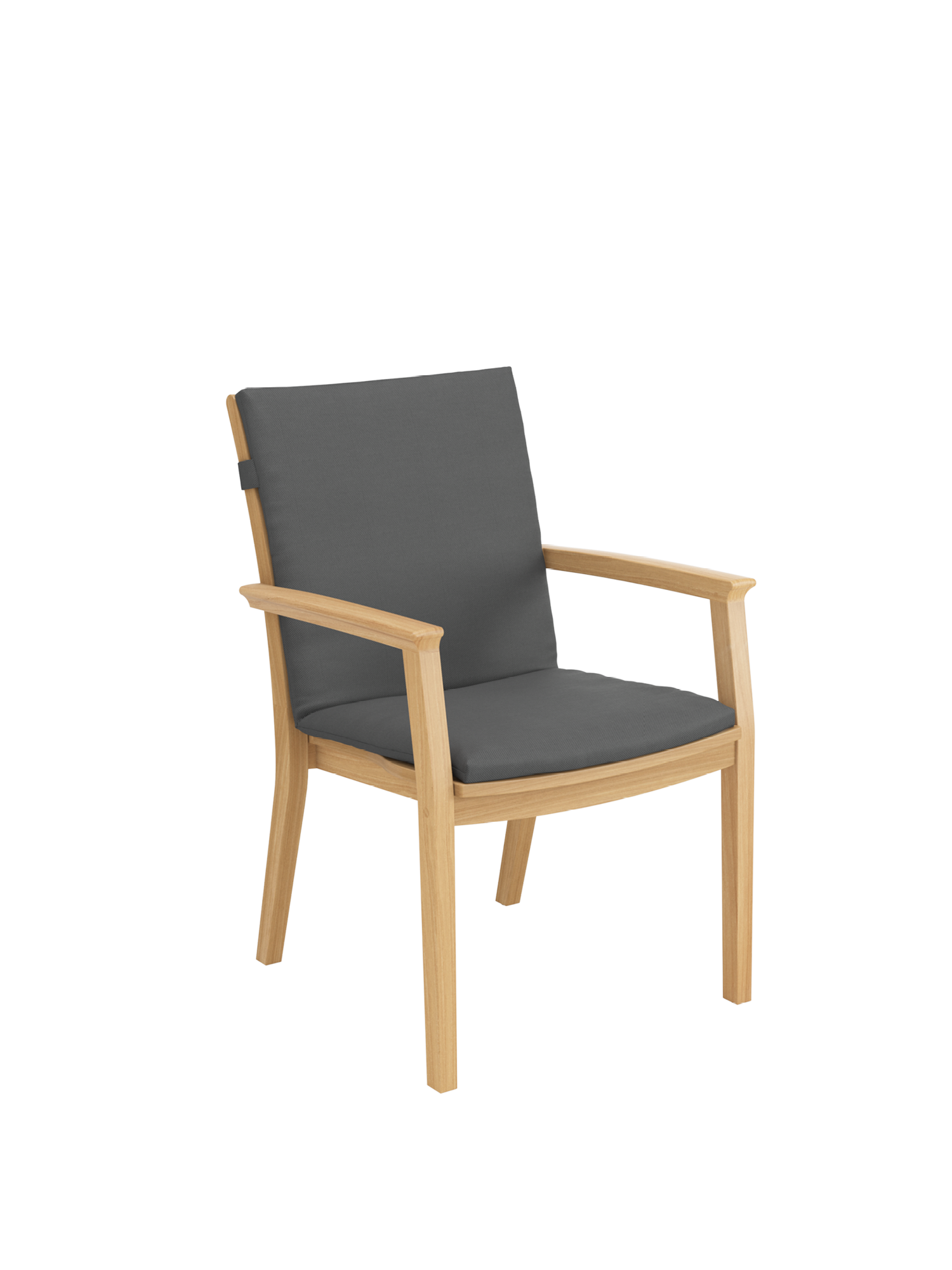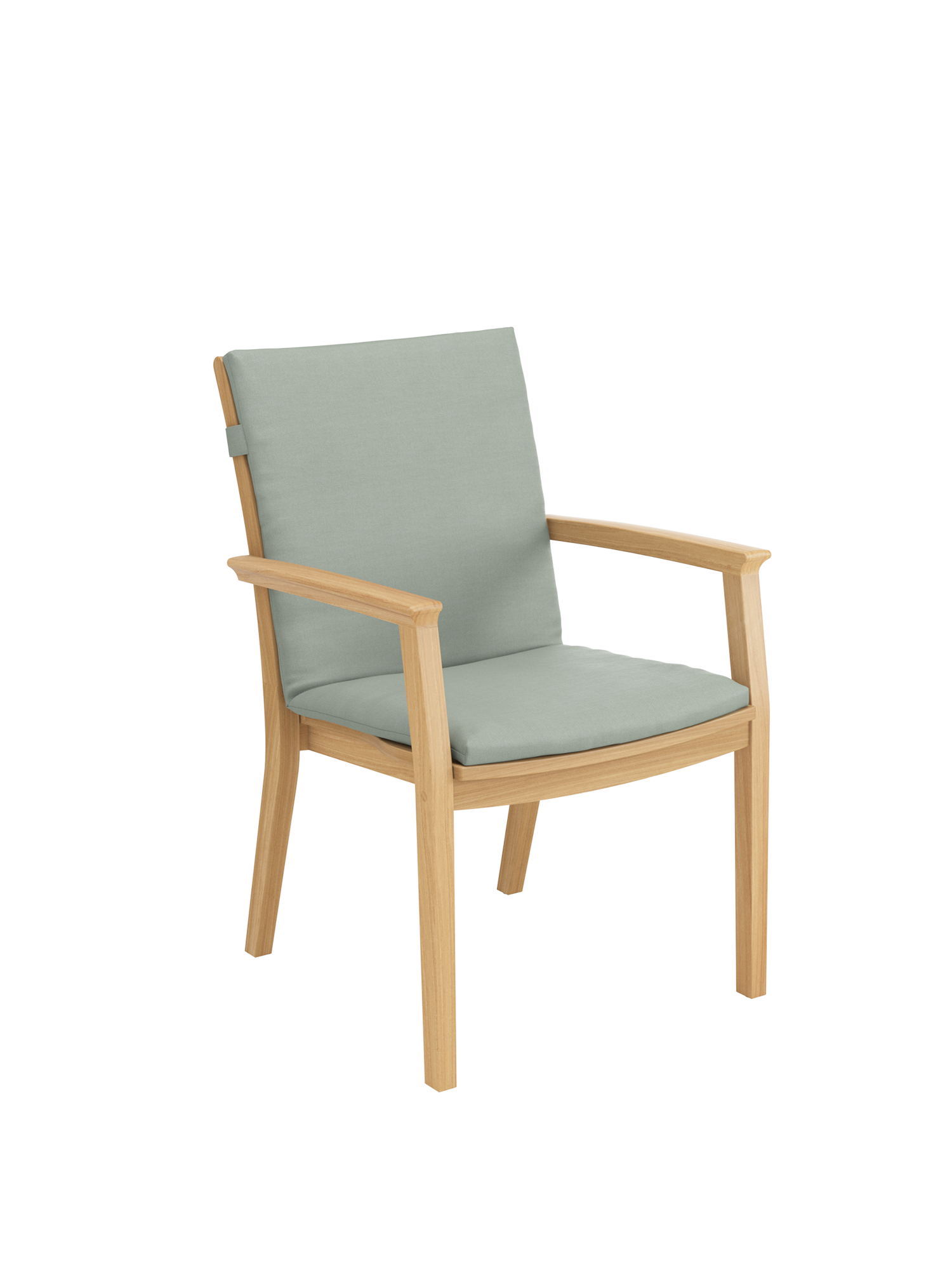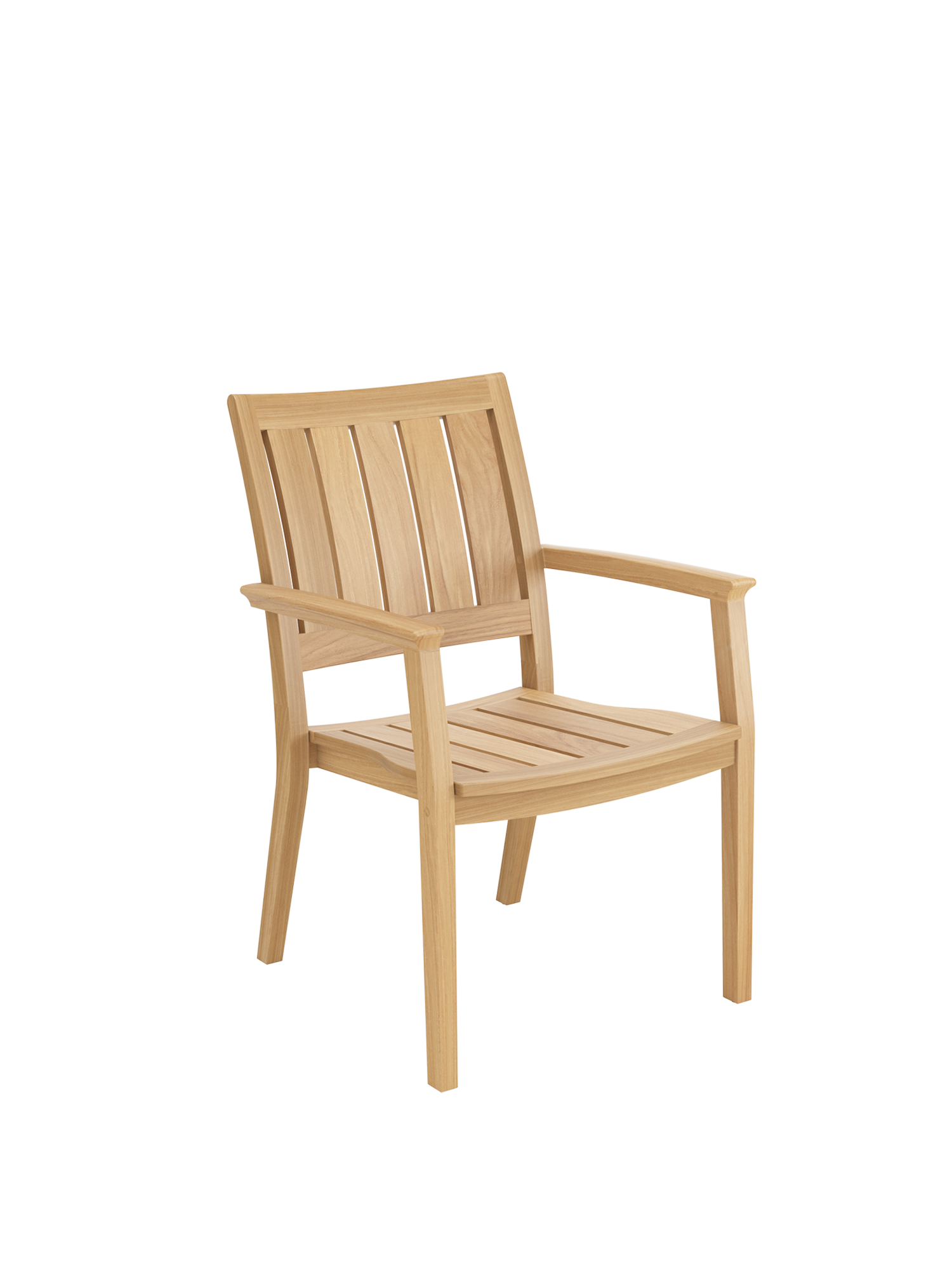 Die besondere Silhouette des stapelbaren Brighton Armlehnstuhls kommt insbesondere im Bereich der Sitzfläche zur Geltung. Die seitlichen Teakleisten verjüngen sich nach hinten und sorgen im Zusammenspiel mit der Rückenlehne für ergonomischen Komfort.