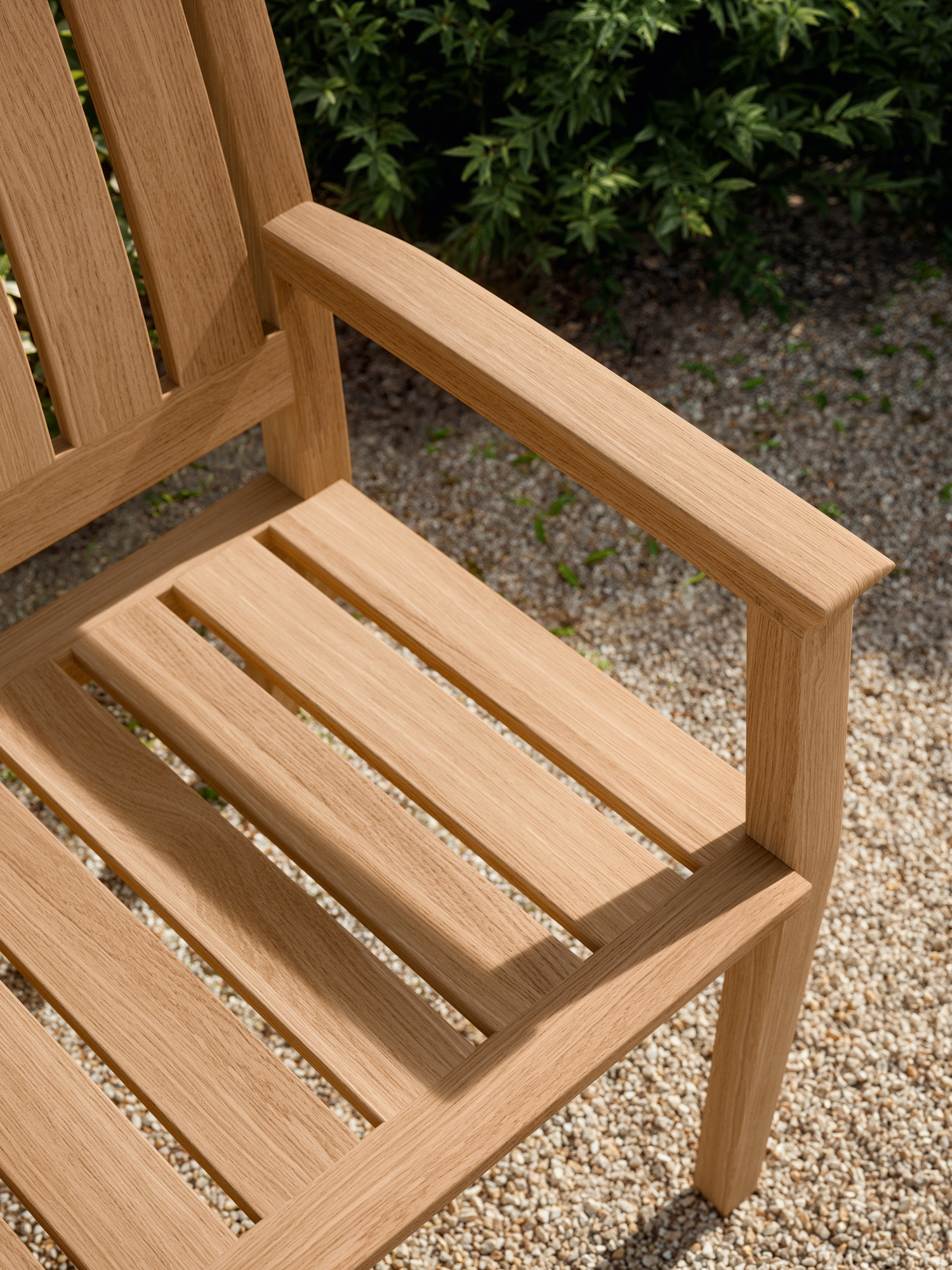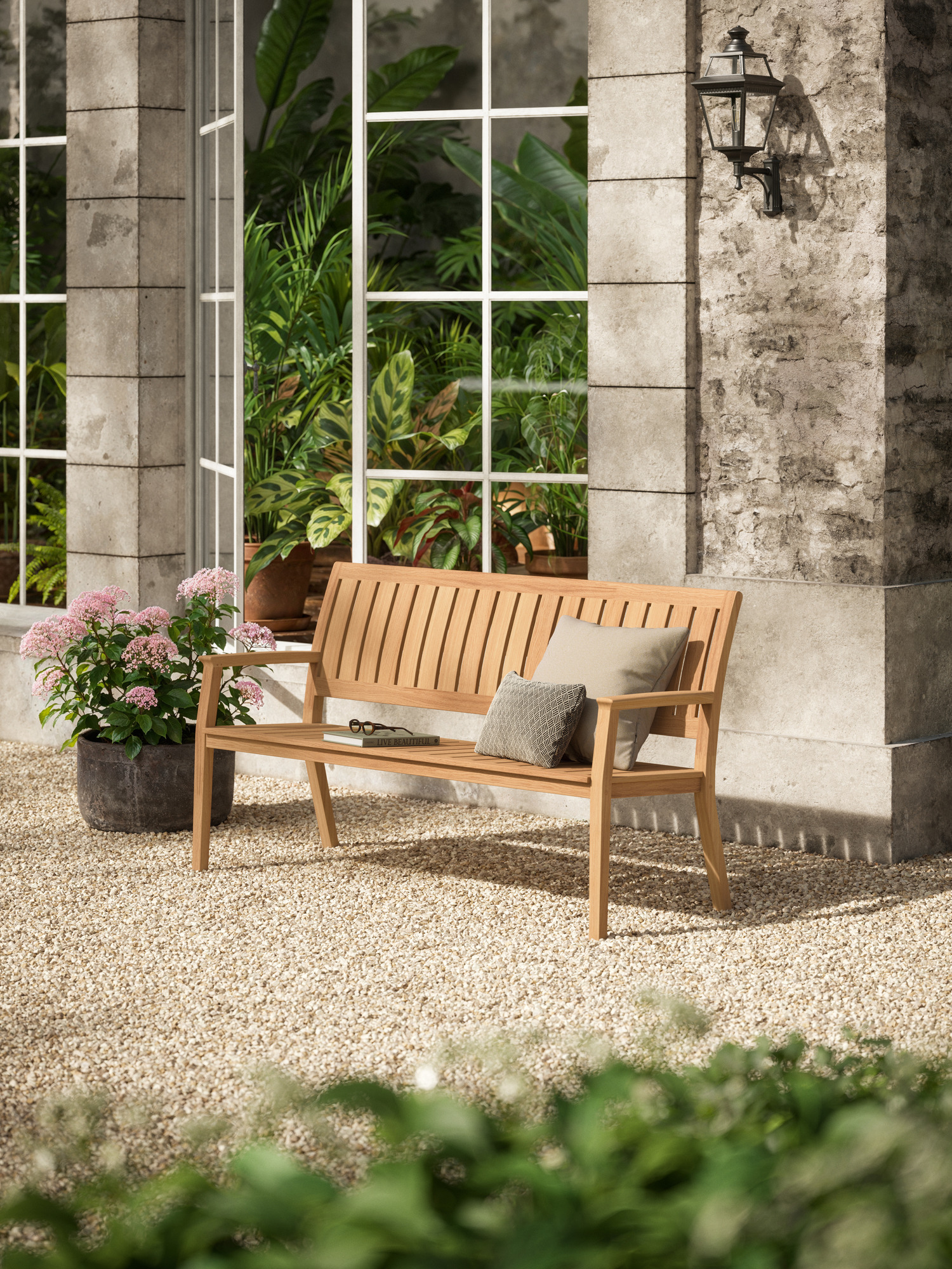 Die Brighton Bank interpretiert klassisches Teakdesign modern und empfiehlt sich für zeitlose Kombinationen unter freiem Himmel.