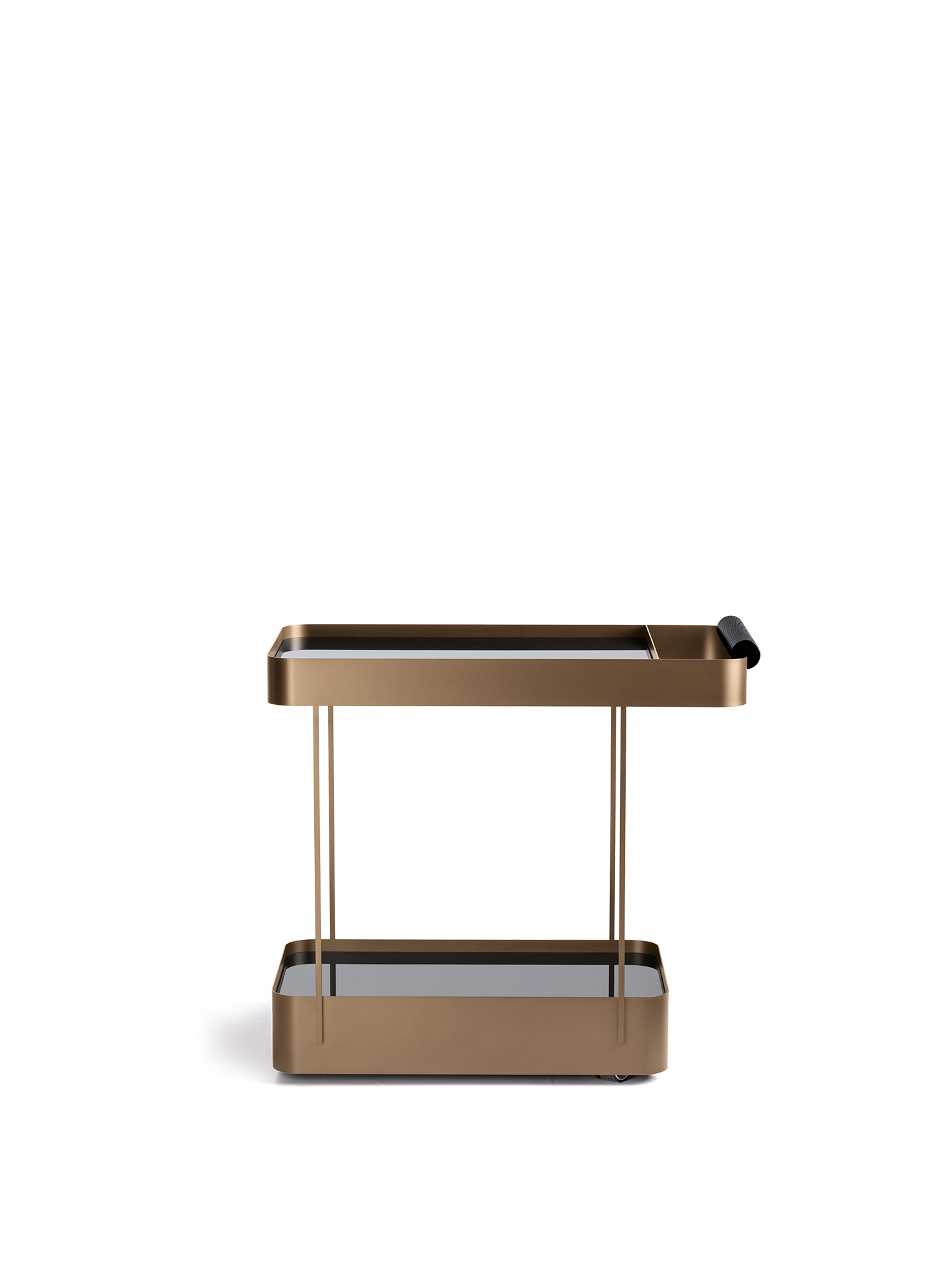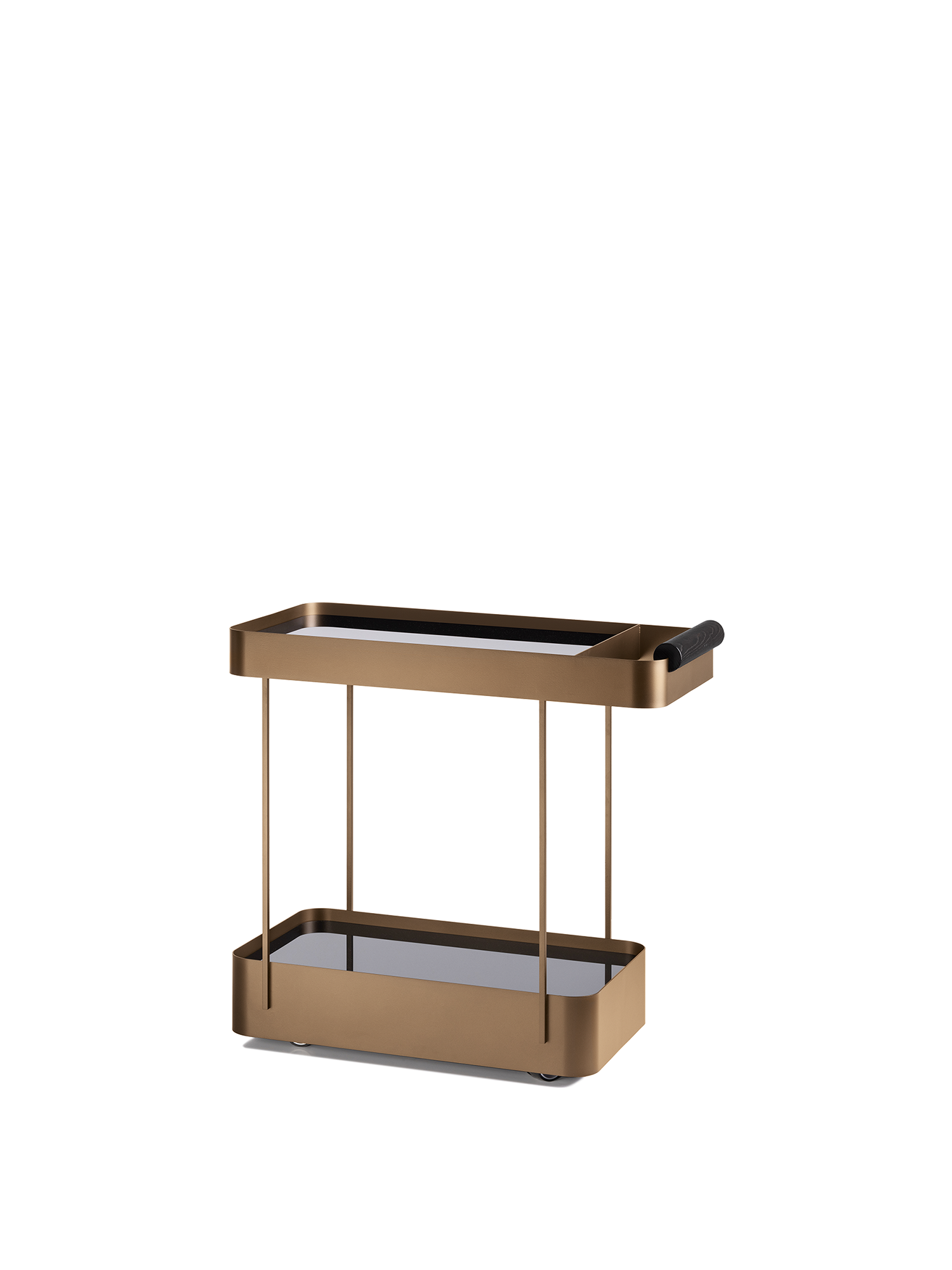 Gerade Flächen, gerundete Kanten und grazile Streben kennzeichnen die stilsichere Formgebung des flexiblen Barwagens, der Gläser, Getränke und Snacks nahe der Sitzgruppe bereithält. Sein filigranes Gestell besteht aus pulverbeschichtetem Stahl in einem Bronzeton, die eingelegten Glasböden der Ablageflächen auf zwei Ebenen sind dunkel verspiegelt. Ein schwarzer Holzgriff, der in den oberen Rahmen eingelassen ist, und dezent verborgene Rollen machen den Barwagen beweglich.