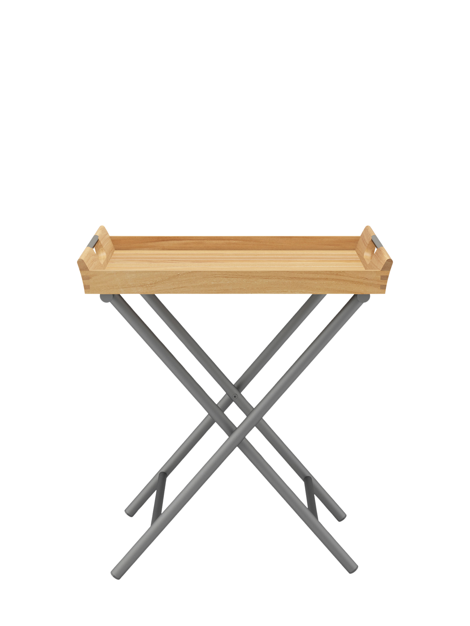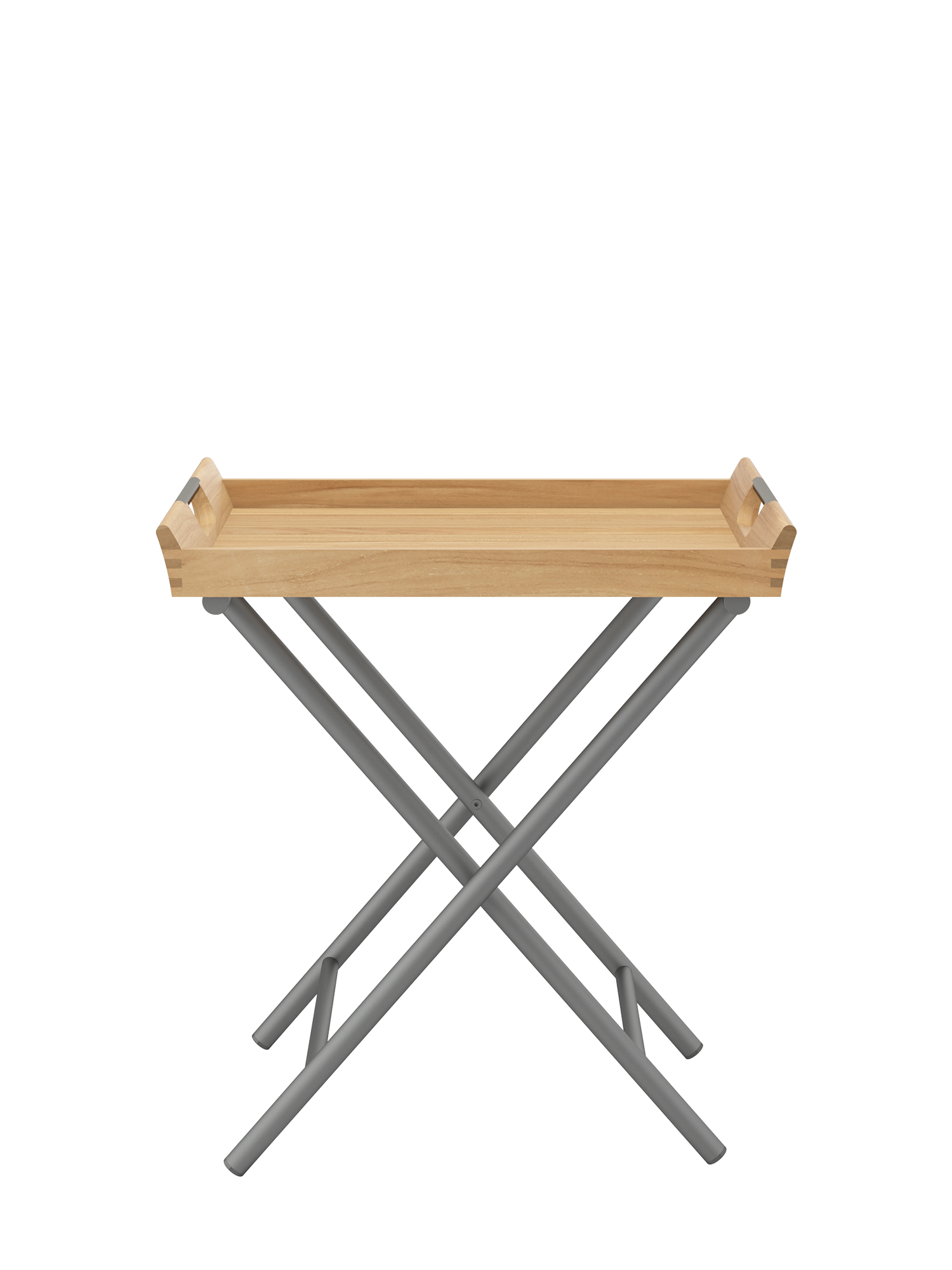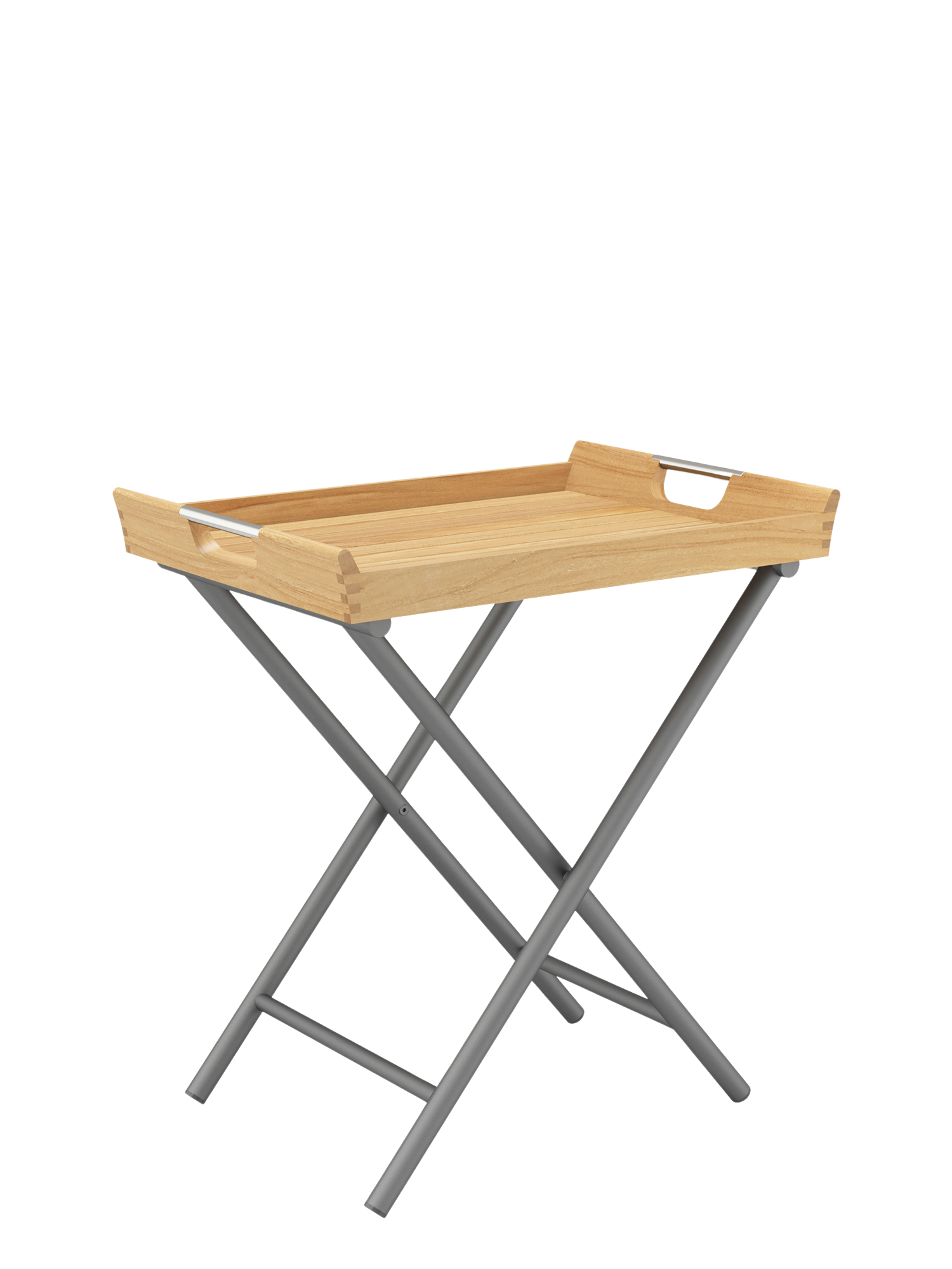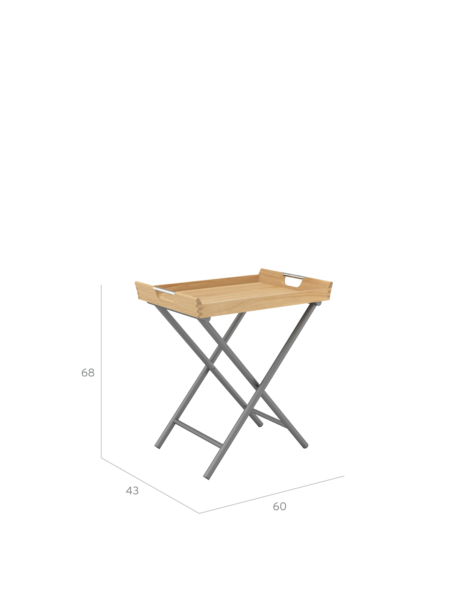 Auf dem klappbaren Gestell aus graphitfarben pulverbeschichtetem Edelstahl wartet das abnehmbare Tablett aus Teakholz auf seinen Einsatz.