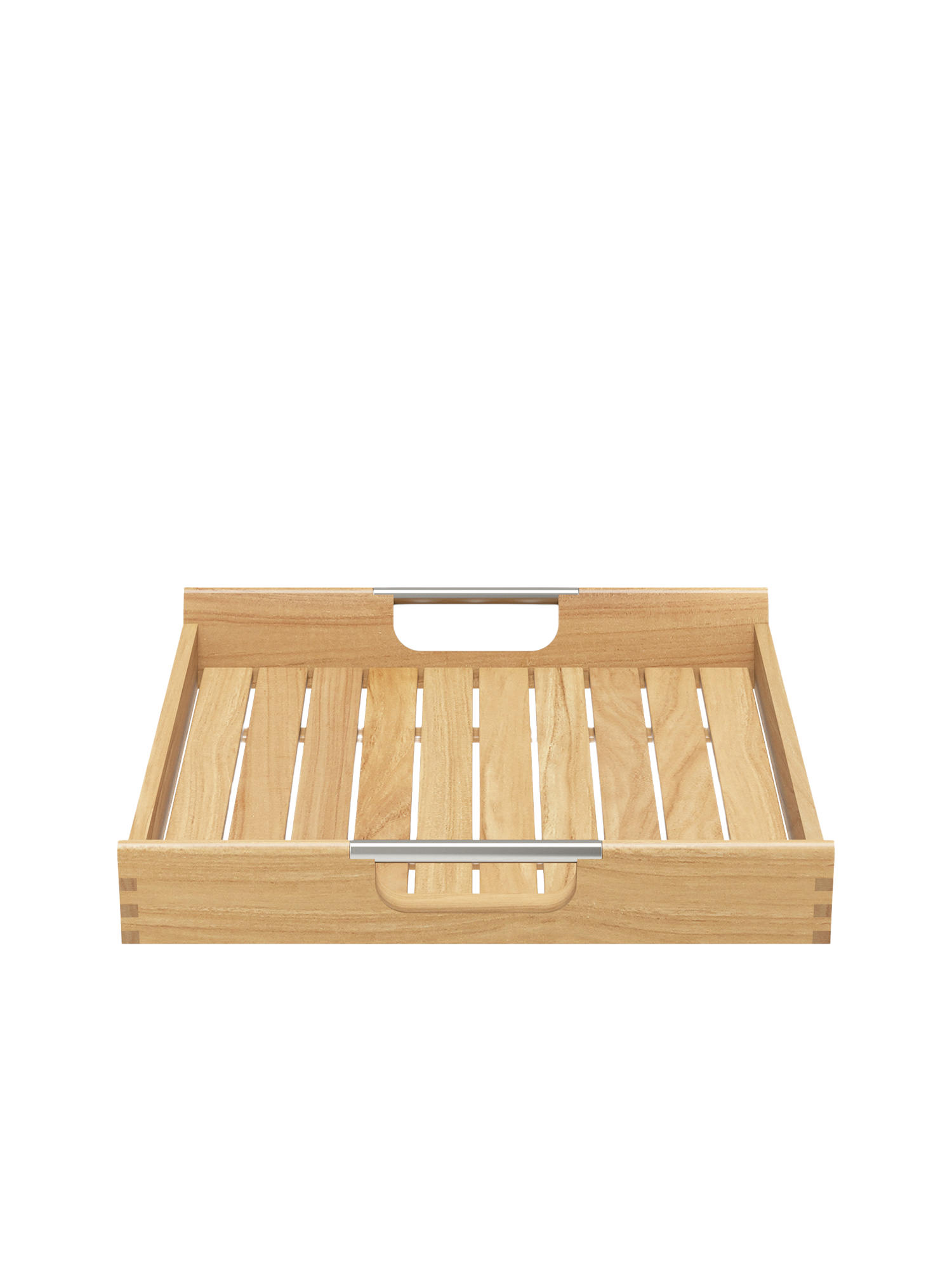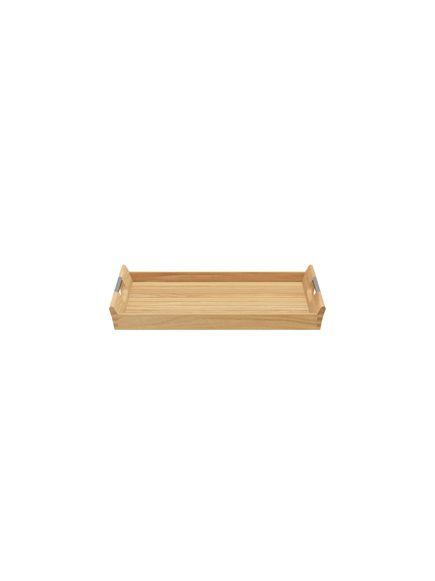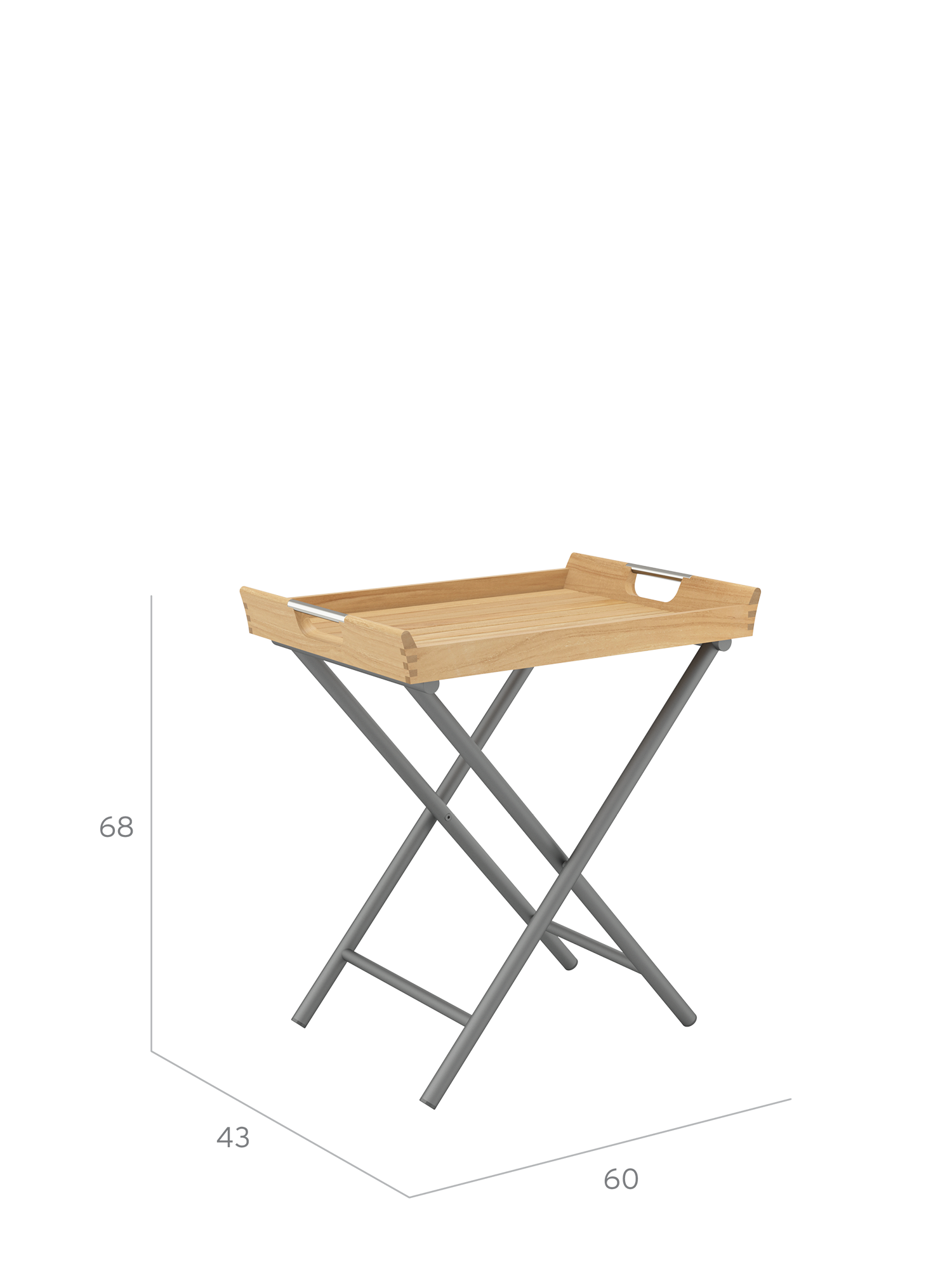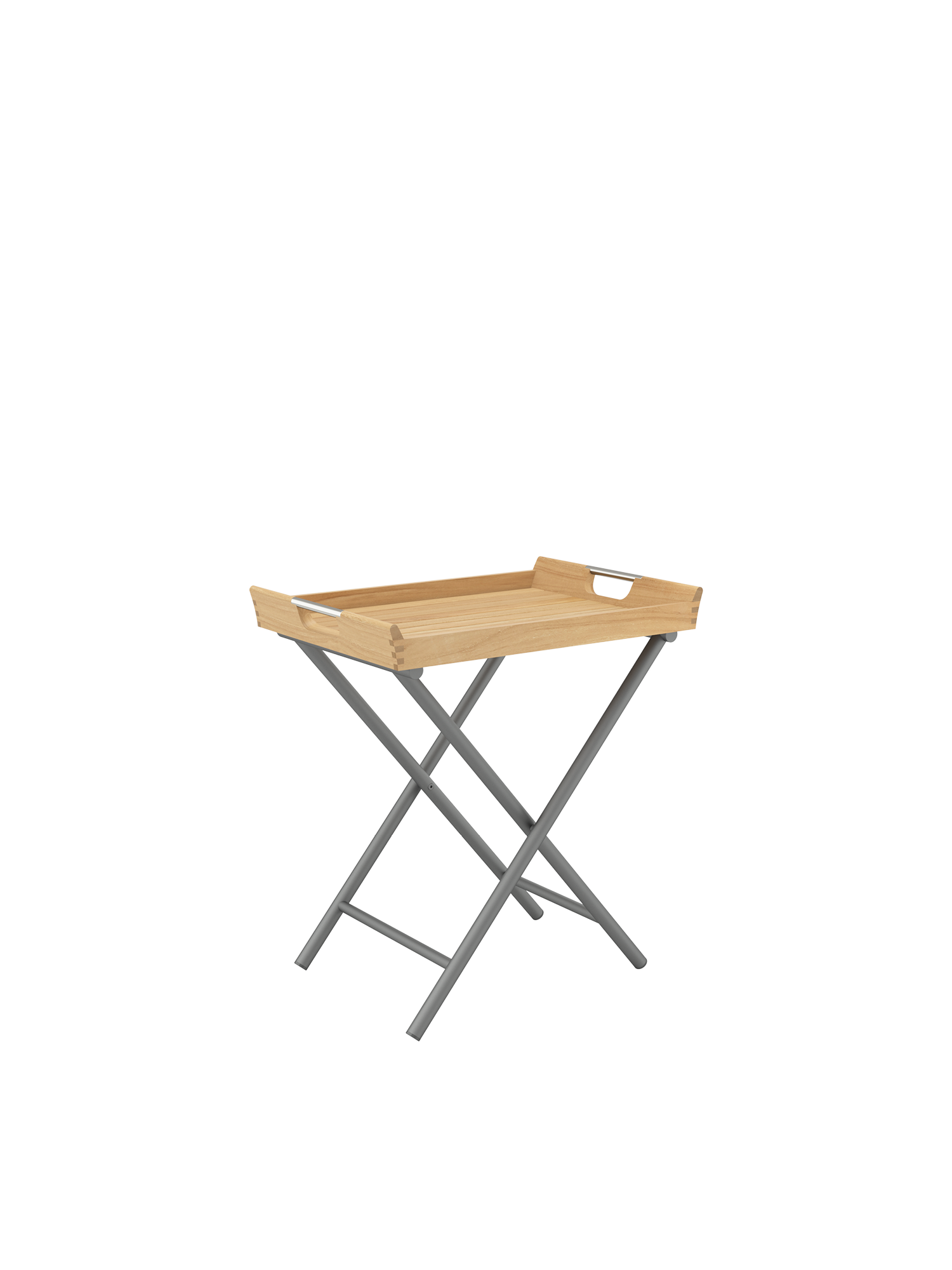 Auf dem klappbaren Gestell aus graphitfarben pulverbeschichtetem Edelstahl wartet das abnehmbare Tablett aus Teakholz auf seinen Einsatz.