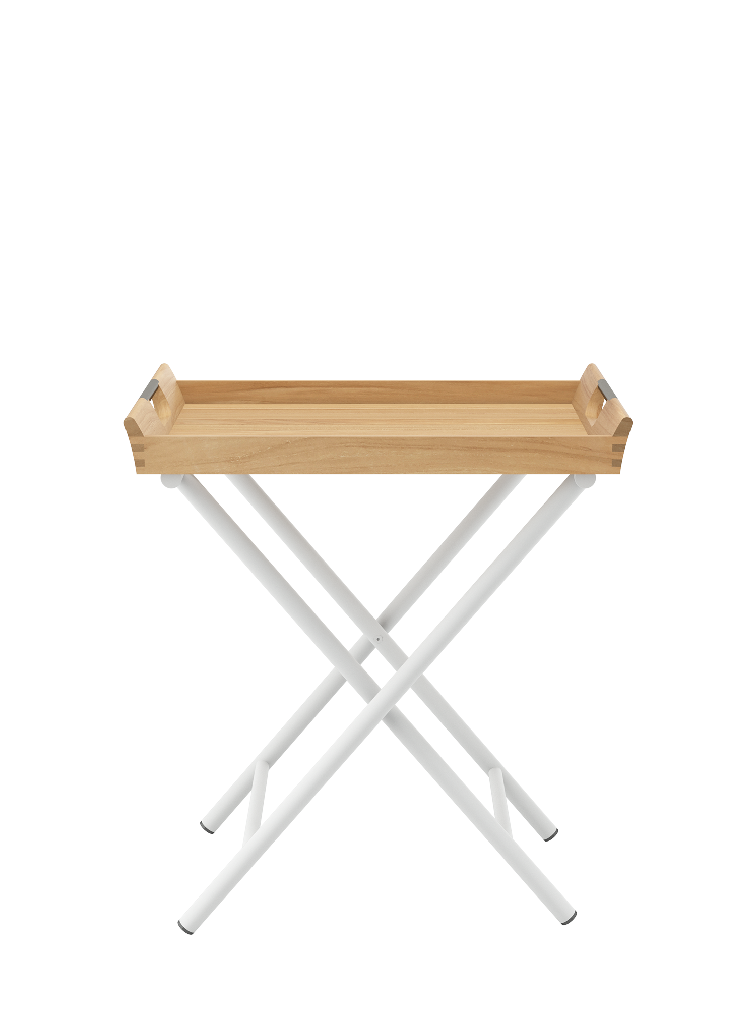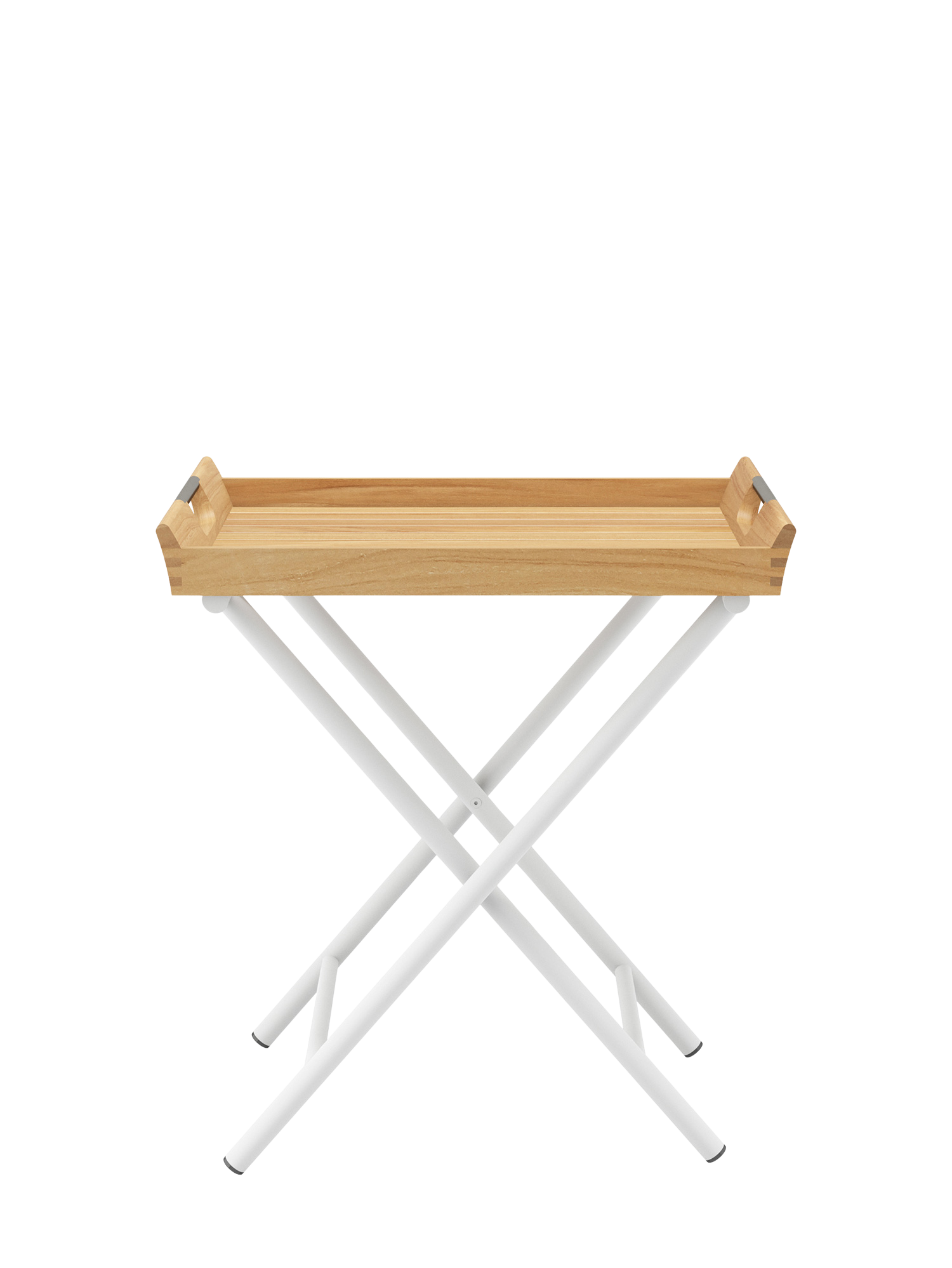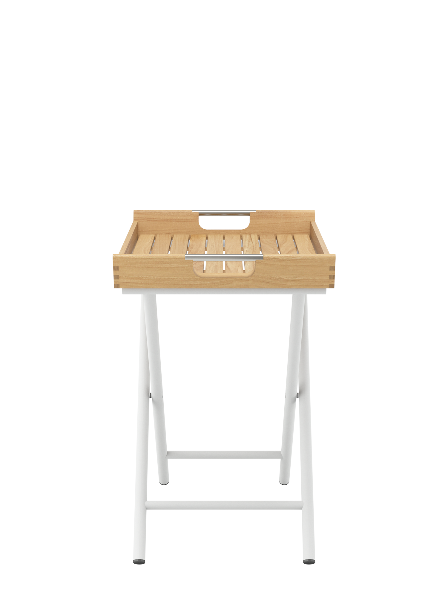 Auf dem klappbaren Gestell aus weiß pulverbeschichtetem Edelstahl wartet das abnehmbare Tablett aus Teakholz auf seinen Einsatz.