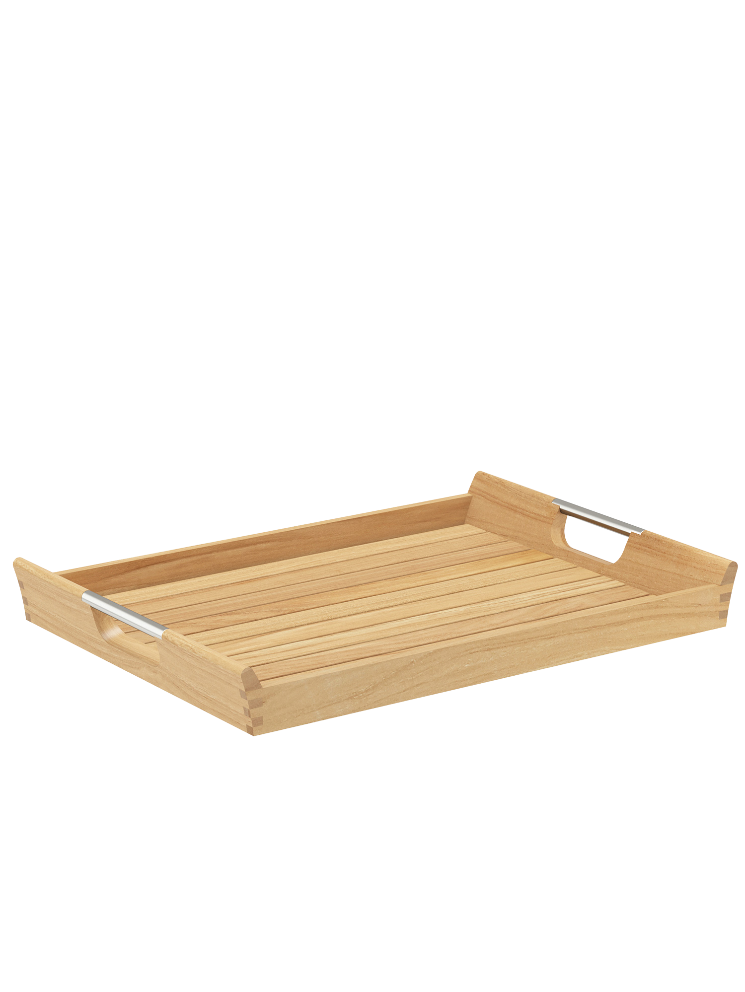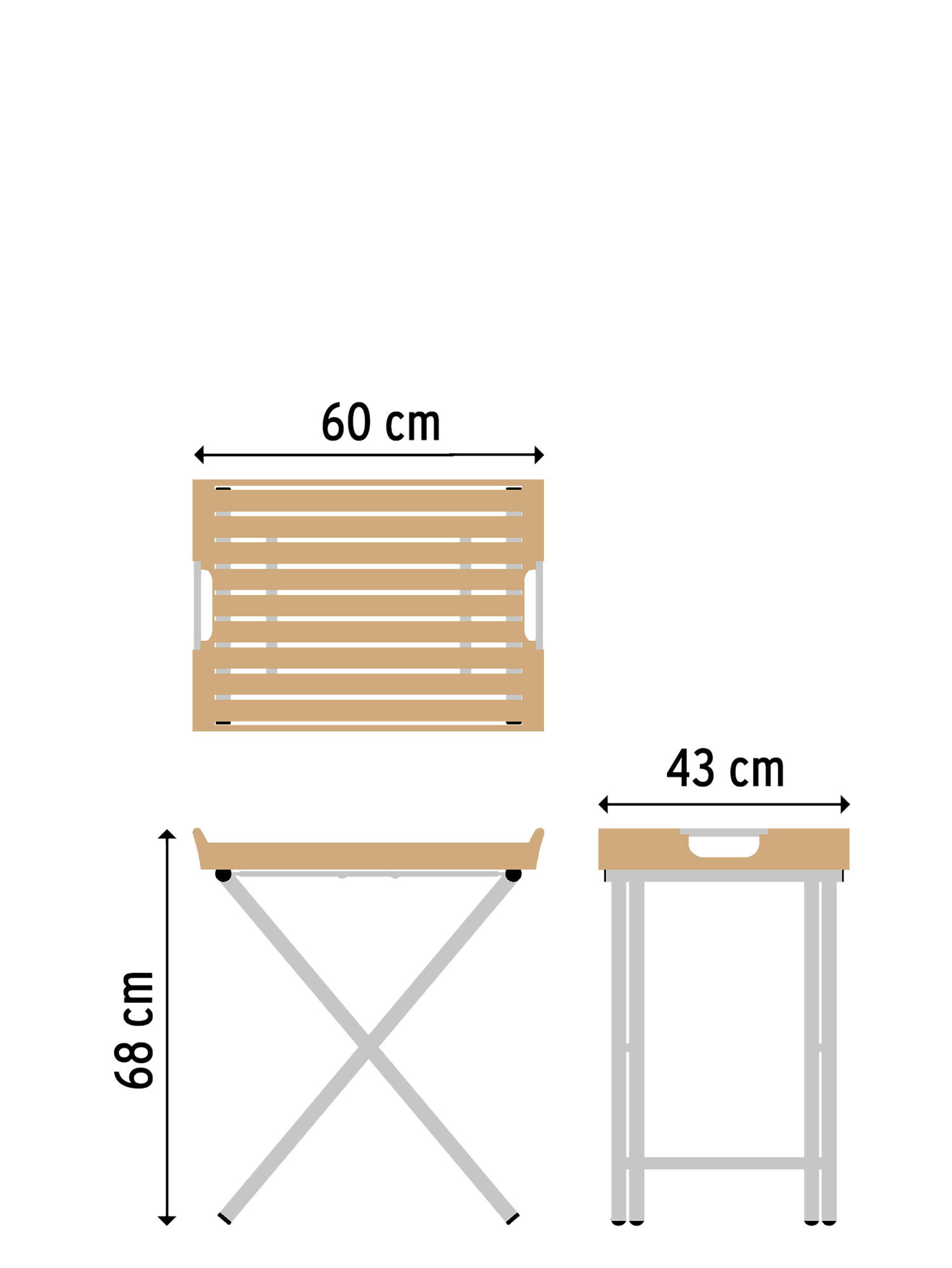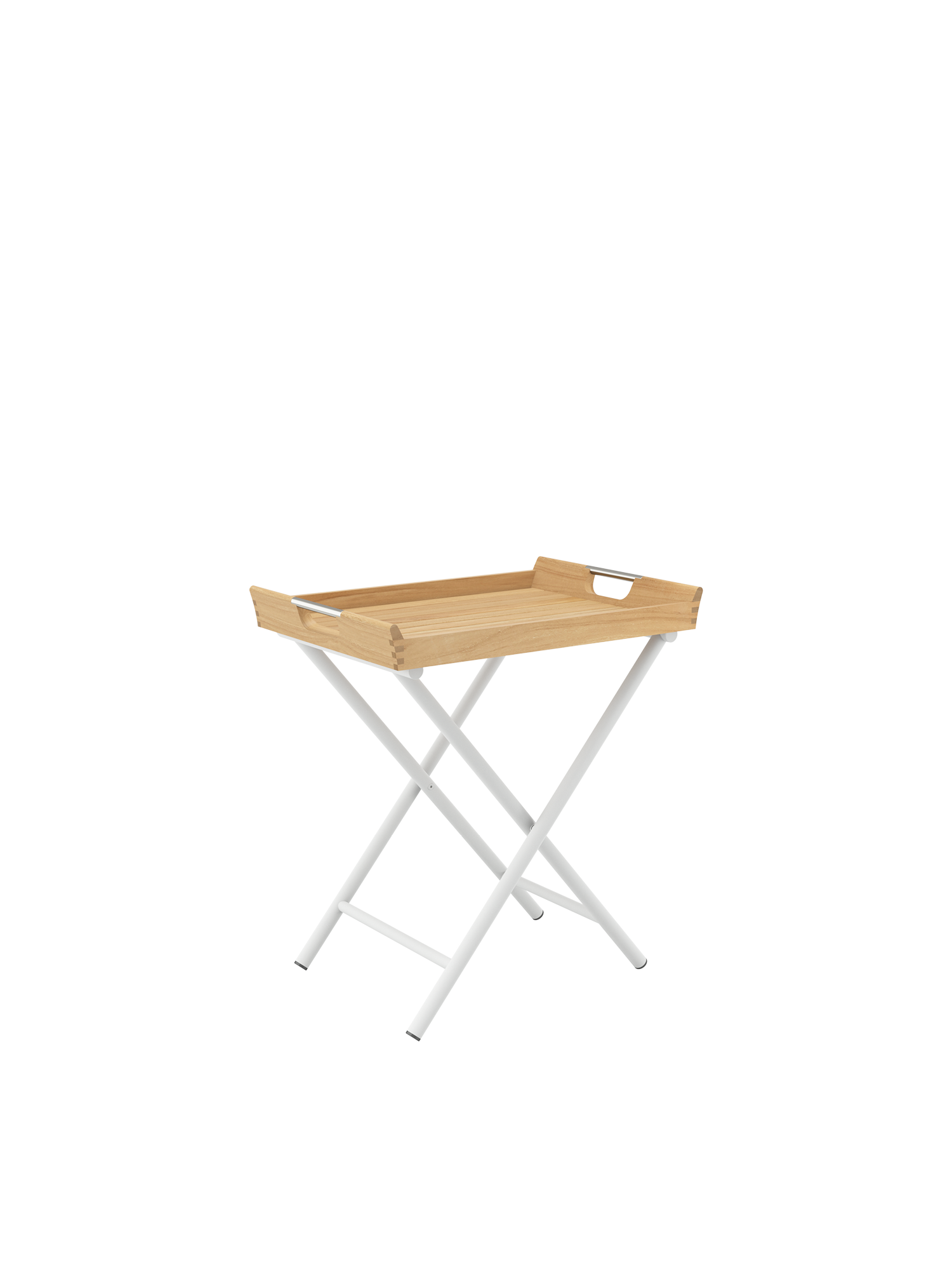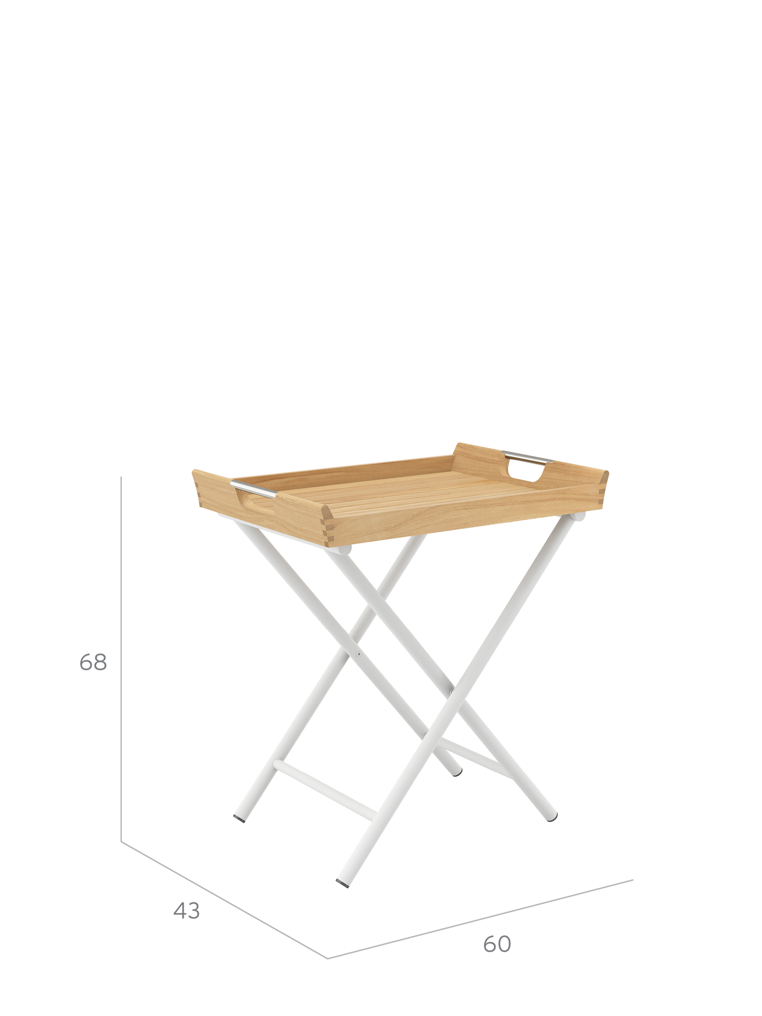 Auf dem klappbaren Gestell aus weiß pulverbeschichtetem Edelstahl wartet das abnehmbare Tablett aus Teakholz auf seinen Einsatz.