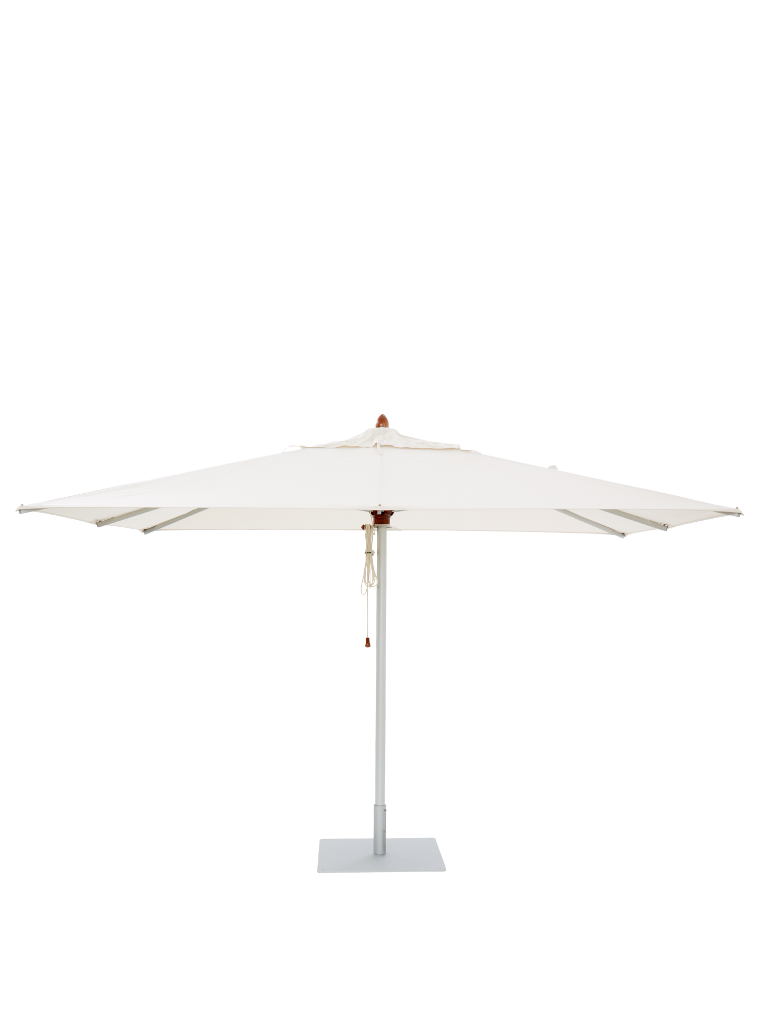 Der rechteckige Sonnenschirm eignet sich besonders für grössere Sitzgruppen. Die Kombination aus eloxierten Aluminiumprofilen und Holzelementen passt sowohl zu klassischen als auch zu modernen Kollektionen. Ein doppelter Seilzug mit Edelstahlbeschlägen erleichtert das Öffnen. Der quadratische Schirmständer sorgt für festen Stand. Eine Schutzhülle aus Polyacrylstoff gehört immer zum Lieferumfang.