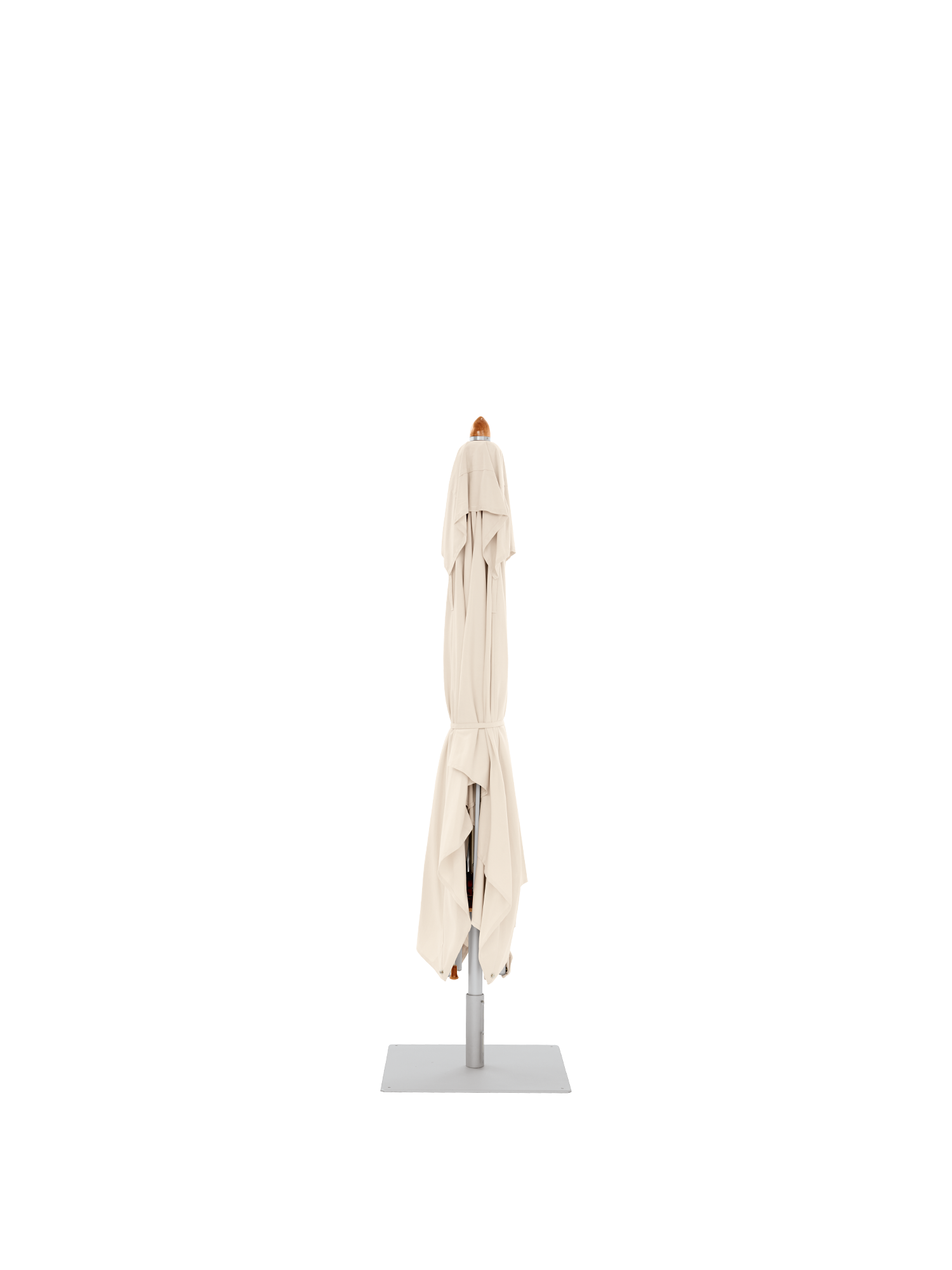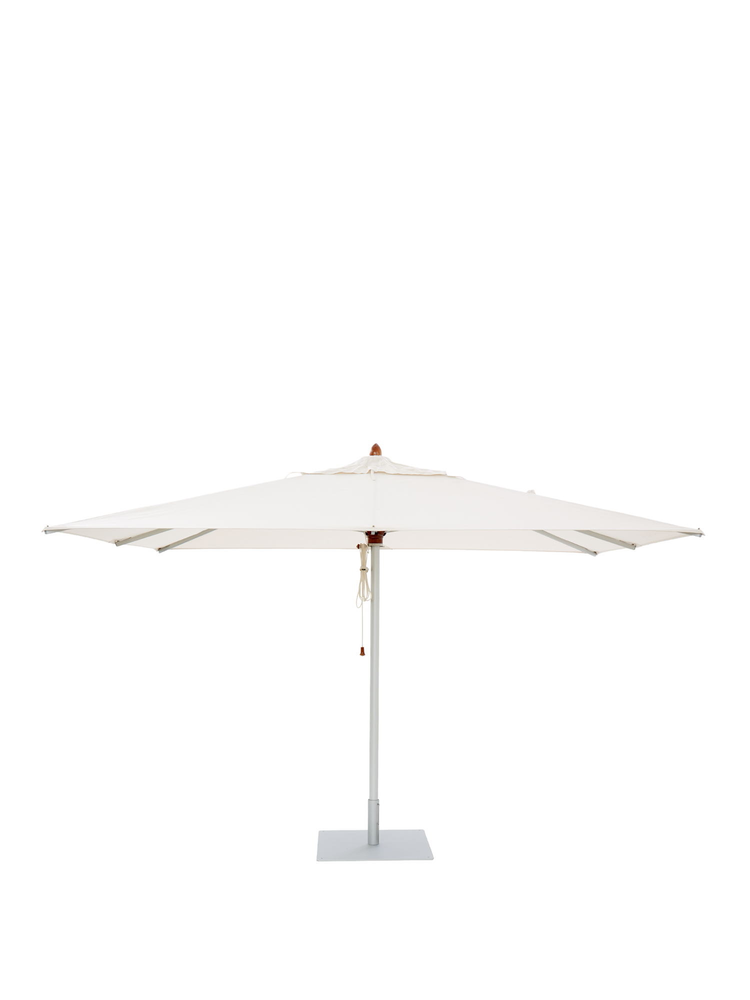 Mast, Gabel und Streben der Calabria Schirme bestehen aus eloxiertem, silberweißem Aluminium; Mastspitze, Krone und Schieber aus lackiertem Hartholz, das schlicht und fein gedrechselt ist.