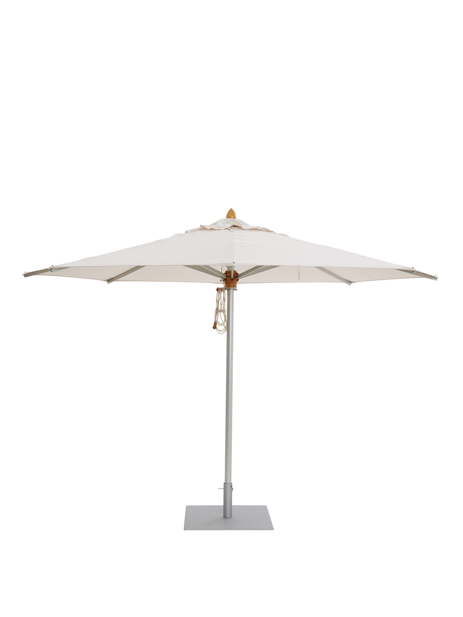 Der runde Sonnenschirm eignet sich besonders für grössere Sitzgruppen. Die Kombination aus eloxierten Aluminiumprofilen und Holzelementen passt sowohl zu klassischen als auch zu modernen Kollektionen. Ein doppelter Seilzug mit Edelstahlbeschlägen erleichtert das Öffnen. Der quadratische Schirmständer sorgt für festen Stand. Eine Schutzhülle aus Polyacrylstoff gehört immer zum Lieferumfang.
