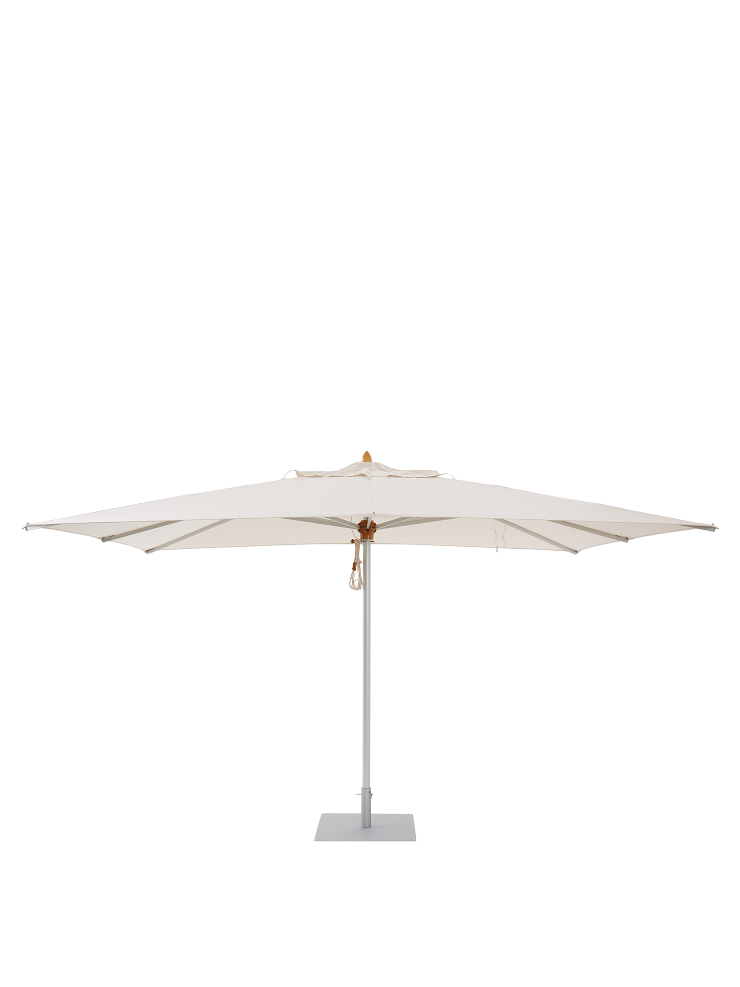 Mast, Gabel und Streben der Calabria Schirme bestehen aus eloxiertem, silberweißem Aluminium; Mastspitze, Krone und Schieber aus lackiertem Hartholz, das schlicht und fein gedrechselt ist.