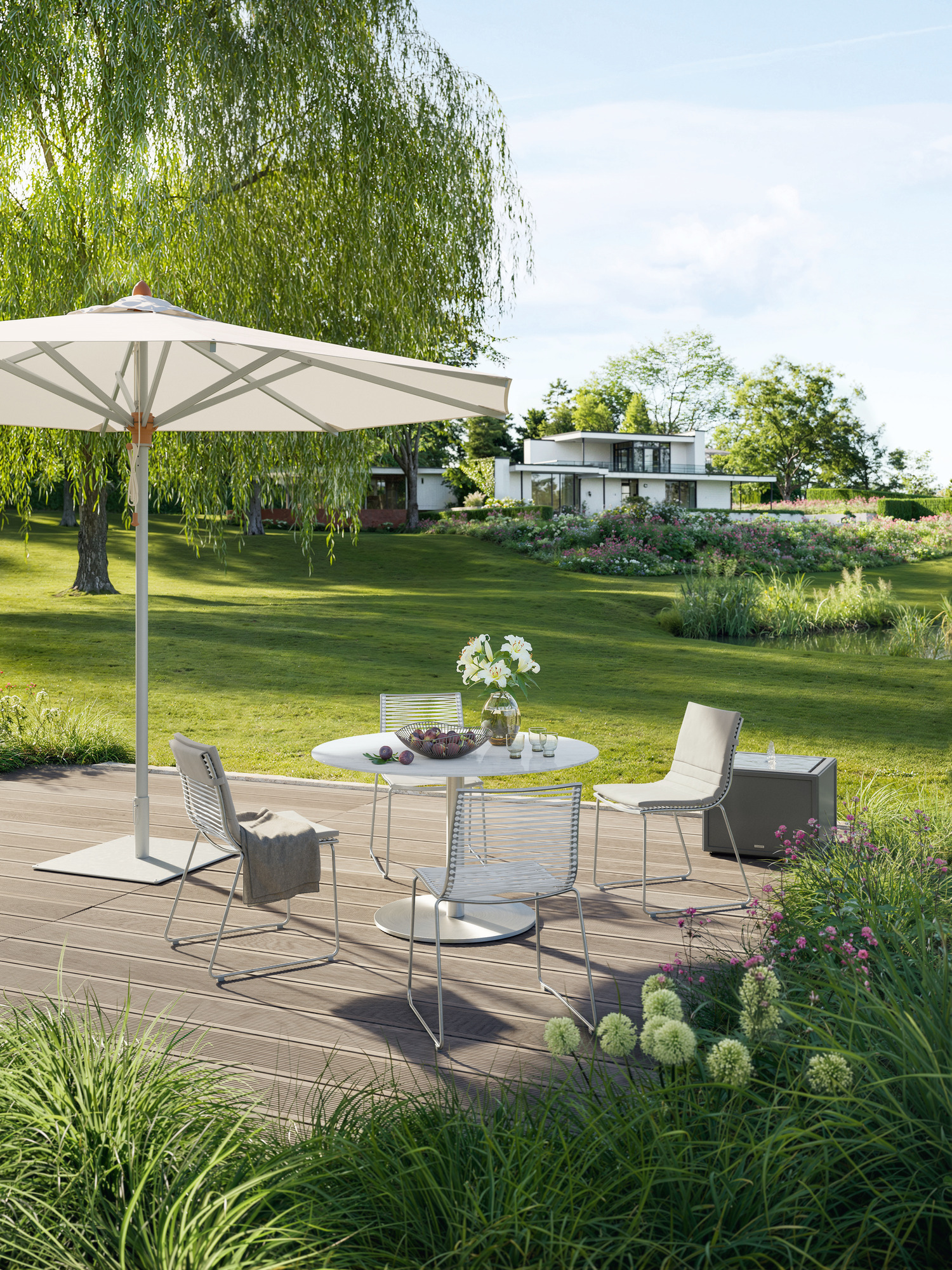 Klar, modern und trotzdem warm und behütend: Calabria spendet lichten Schatten und dämmt die Hitze des Tages auf angenehme Grade.