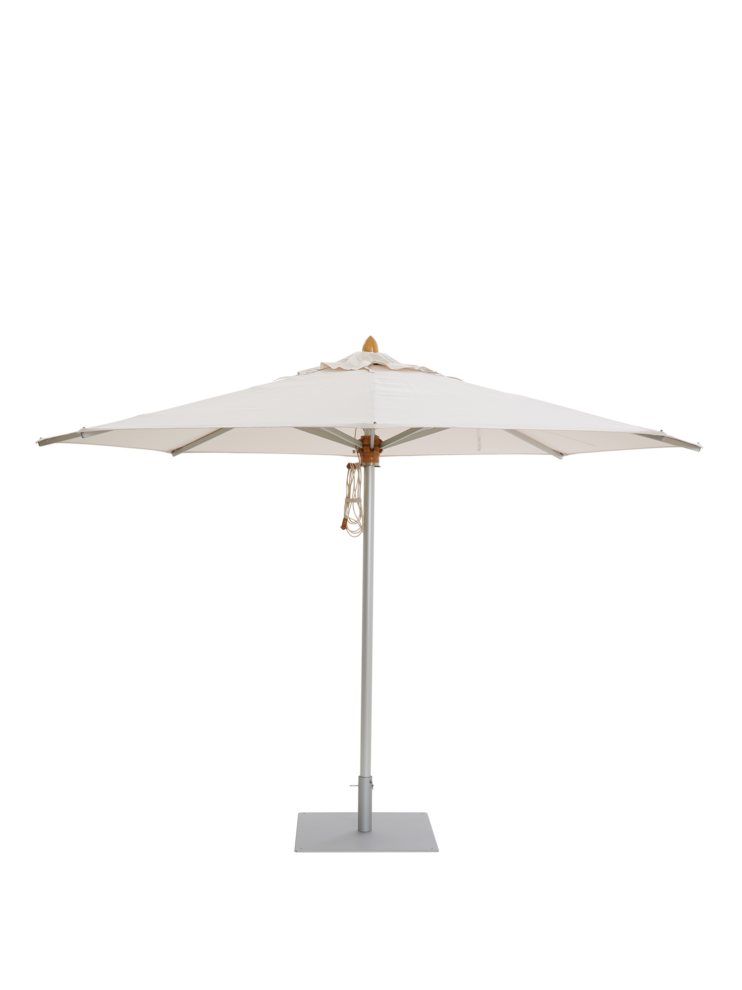 Mast, Gabel und Streben der Calabria Schirme bestehen aus eloxiertem, silberweißem Aluminium; Mastspitze, Krone und Schieber aus lackiertem Hartholz, das schlicht und fein gedrechselt ist.